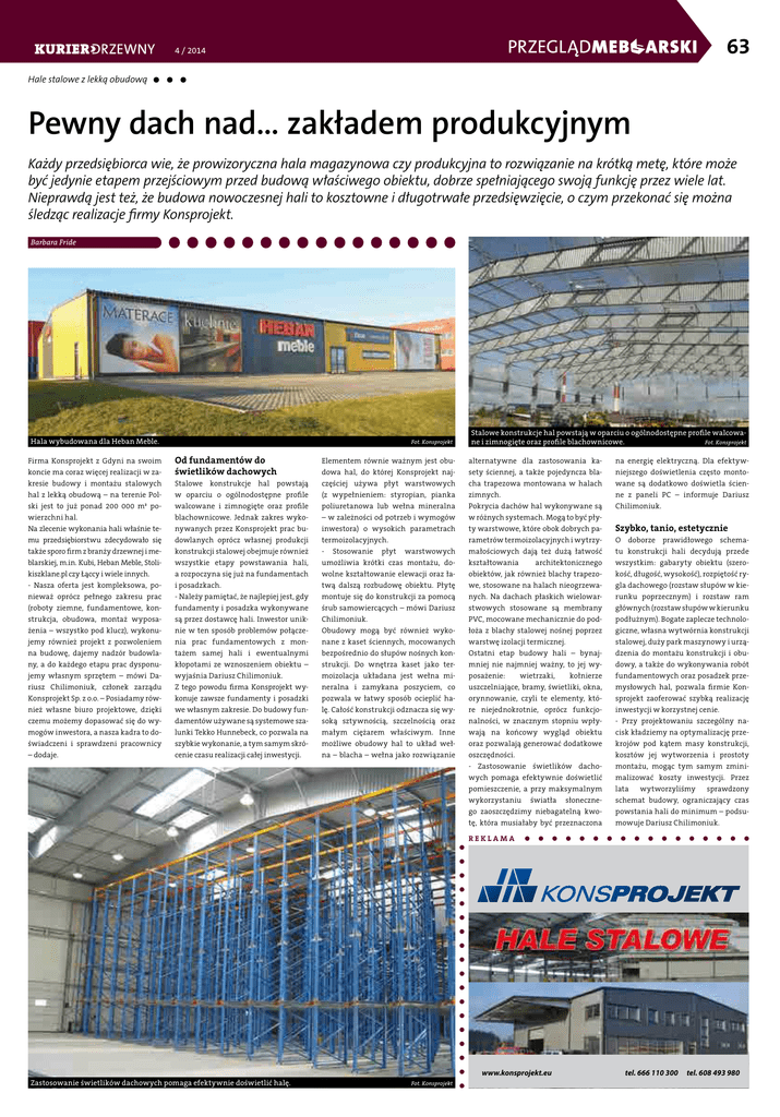 63 4 / 2014 Hale stalowe z lekką obudową Pewny dach nad… zakładem produkcyjnym Każdy przedsiębiorca wie, że prowizoryczna hala magazynowa czy produkcyjna to rozwiązanie na krótką metę, które może być jedynie etapem przejściowym przed budową właściwego obiektu, dobrze spełniającego swoją funkcję przez wiele lat. Nieprawdą jest też, że budowa nowoczesnej hali to kosztowne i długotrwałe przedsięwzięcie, o czym przekonać się można śledząc realizacje firmy Konsprojekt. Barbara Fride Hala wybudowana dla Heban Meble. Firma Konsprojekt z Gdyni na swoim koncie ma coraz więcej realizacji w zakresie budowy i montażu stalowych hal z lekką obudową – na terenie Polski jest to już ponad 200 000 m² powierzchni hal. Na zlecenie wykonania hali właśnie temu przedsiębiorstwu zdecydowało się także sporo firm z branży drzewnej i meblarskiej, m.in. Kubi, Heban Meble, Stolikiszklane.pl czy Łąccy i wiele innych. - Nasza oferta jest kompleksowa, ponieważ oprócz pełnego zakresu prac (roboty ziemne, fundamentowe, konstrukcja, obudowa, montaż wyposażenia – wszystko pod klucz), wykonujemy również projekt z pozwoleniem na budowę, dajemy nadzór budowlany, a do każdego etapu prac dysponujemy własnym sprzętem – mówi Dariusz Chilimoniuk, członek zarządu Konsprojekt Sp. z o.o. – Posiadamy również własne biuro projektowe, dzięki czemu możemy dopasować się do wymogów inwestora, a nasza kadra to doświadczeni i sprawdzeni pracownicy – dodaje. Fot. Konsprojekt Od fundamentów do świetlików dachowych Stalowe konstrukcje hal powstają w oparciu o ogólnodostępne profile walcowane i zimnogięte oraz profile blachownicowe. Jednak zakres wykonywanych przez Konsprojekt prac budowlanych oprócz własnej produkcji konstrukcji stalowej obejmuje również wszystkie etapy powstawania hali, a rozpoczyna się już na fundamentach i posadzkach. - Należy pamiętać, że najlepiej jest, gdy fundamenty i posadzka wykonywane są przez dostawcę hali. Inwestor uniknie w ten sposób problemów połączenia prac fundamentowych z montażem samej hali i ewentualnymi kłopotami ze wznoszeniem obiektu – wyjaśnia Dariusz Chilimoniuk. Z tego powodu firma Konsprojekt wykonuje zawsze fundamenty i posadzki we własnym zakresie. Do budowy fundamentów używane są systemowe szalunki Tekko Hunnebeck, co pozwala na szybkie wykonanie, a tym samym skrócenie czasu realizacji całej inwestycji. Elementem równie ważnym jest obudowa hal, do której Konsprojekt najczęściej używa płyt warstwowych (z wypełnieniem: styropian, pianka poliuretanowa lub wełna mineralna – w zależności od potrzeb i wymogów inwestora) o wysokich parametrach termoizolacyjnych. - Stosowanie płyt warstwowych umożliwia krótki czas montażu, dowolne kształtowanie elewacji oraz łatwą dalszą rozbudowę obiektu. Płytę montuje się do konstrukcji za pomocą śrub samowiercących – mówi Dariusz Chilimoniuk. Obudowy mogą być również wykonane z kaset ściennych, mocowanych bezpośrednio do słupów nośnych konstrukcji. Do wnętrza kaset jako termoizolacja układana jest wełna mineralna i zamykana poszyciem, co pozwala w łatwy sposób ocieplić halę. Całość konstrukcji odznacza się wysoką sztywnością, szczelnością oraz małym ciężarem właściwym. Inne możliwe obudowy hal to układ wełna – blacha – wełna jako rozwiązanie Stalowe konstrukcje hal powstają w oparciu o ogólnodostępne profile walcowane i zimnogięte oraz profile blachownicowe. Fot. Konsprojekt alternatywne dla zastosowania kasety ściennej, a także pojedyncza blacha trapezowa montowana w halach zimnych. Pokrycia dachów hal wykonywane są w różnych systemach. Mogą to być płyty warstwowe, które obok dobrych parametrów termoizolacyjnych i wytrzymałościowych dają też dużą łatwość kształtowania architektonicznego obiektów, jak również blachy trapezowe, stosowane na halach nieogrzewanych. Na dachach płaskich wielowarstwowych stosowane są membrany PVC, mocowane mechanicznie do podłoża z blachy stalowej nośnej poprzez warstwę izolacji termicznej. Ostatni etap budowy hali – bynajmniej nie najmniej ważny, to jej wyposażenie: wietrzaki, kołnierze uszczelniające, bramy, świetliki, okna, orynnowanie, czyli te elementy, które niejednokrotnie, oprócz funkcjonalności, w znacznym stopniu wpływają na końcowy wygląd obiektu oraz pozwalają generować dodatkowe oszczędności. - Zastosowanie świetlików dachowych pomaga efektywnie doświetlić pomieszczenie, a przy maksymalnym wykorzystaniu światła słonecznego zaoszczędzimy niebagatelną kwotę, która musiałaby być przeznaczona na energię elektryczną. Dla efektywniejszego doświetlenia często montowane są dodatkowo doświetla ścienne z paneli PC – informuje Dariusz Chilimoniuk. Szybko, tanio, estetycznie O doborze prawidłowego schematu konstrukcji hali decydują przede wszystkim: gabaryty obiektu (szerokość, długość, wysokość), rozpiętość rygla dachowego (rozstaw słupów w kierunku poprzecznym) i rozstaw ram głównych (rozstaw słupów w kierunku podłużnym). Bogate zaplecze technologiczne, własna wytwórnia konstrukcji stalowej, duży park maszynowy i urządzenia do montażu konstrukcji i obudowy, a także do wykonywania robót fundamentowych oraz posadzek przemysłowych hal, pozwala firmie Konsprojekt zaoferować szybką realizację inwestycji w korzystnej cenie. - Przy projektowaniu szczególny nacisk kładziemy na optymalizację przekrojów pod kątem masy konstrukcji, kosztów jej wytworzenia i prostoty montażu, mogąc tym samym zminimalizować koszty inwestycji. Przez lata wytworzyliśmy sprawdzony schemat budowy, ograniczający czas powstania hali do minimum – podsumowuje Dariusz Chilimoniuk. REKLAMA www.konsprojekt.eu Zastosowanie świetlików dachowych pomaga efektywnie doświetlić halę. Fot. Konsprojekt tel. 666 110 300 tel. 608 493 980