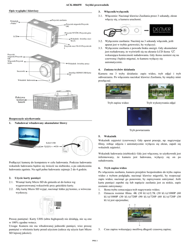 ACK-8060W Szybki przewodnik Opis wyglądu i klawiszy Wskaźnik „Zajęty” 3. Włącznik/wyłącznik 3.1. Włączenie: Nacisnąć klawisz Zasilania przez 3 sekundy, ekran włączy się, a kamera uruchomi. Przycisk zasilania Przycisk migawki/Przycisk OK Przycisk WYŚW./Przycisk góra LCD Wskaźnik świetlny sieci Wi-Fi 3.2. Wyłączenie zasilania: Naciśnij na 3 sekundy włącznik, jeśli aparat jest w trybie gotowości, by wyłączyć. 3.3. Wyłączenie zasilania z powodu braku anergii. Gdy akumulator jest rozładowany, to wyświetli się na ekranie LCD ikona wskazująca konieczność naładowania. Gdy ikona zamieni się na czerwoną i będzie migotać, to kamera wyłączy się automatycznie. Przycisk sieci Wi-Fi/Przycisk dó ł Przycisk migawki/Przycisk OK Włącznik/Przycisk trybu Wskaźnik świetlny pracy 4. Soczewki Interfejs HDMI/USB/karty TF Zmiana trybów działania Kamera ma 3 tryby działania: zapis wideo, tryb zdjęć i tryb odtwarzania. Po włączeniu naciskać klawisz Zasilania, by między nimi przełączać. Wskaźnik ładowania Pokrywa komory baterii Tryb zapisu wideo Tryb wykonywania zdjęć Rozpoczęcie użytkowania 1. Naładować wbudowany akumulator litowy Tryb powtarzania 5. Kabel USB Wskaźnik ładowania (niebieski): Gdy jest włączony, to użytkownik jest informowany, że kamera jest ładowana, wyłączy się on po naładowaniu. Podłączyć kamerę do komputera w celu ładowania. Podczas ładowania wskaźnik ładowania będzie się świecić na niebiesko, a po zakończeniu ładowania zgaśnie. Na ogół pełne ładowanie zajmuje 2 do 4 godzin. 2. Wskaźnik Wskaźnik zajętości (czerwony): Gdy aparat pracuje, np. nagrywając filmy, robiąc zdjęcia i automatycznie wyłącza się ekran, zapali się wskaźnik zajętości. 6. Tryb zapisu wideo Po włączeniu zasilania, kamera przejdzie bezpośrednio do trybu zapisu wideo z trybem podglądu, nacisnąć klawisz migawki, by rozpocząć zapis wideo; nacisnąć go ponownie, by zapisywanie zatrzymać. Jeśli karta pamięci zapełni się lub napięcie zasilania jest za niskie, zapis zostanie zatrzymany: 1. Ikona trybu oznaczająca tryb nagrywania wideo; 2. Oznacza rozmiar filmu. 4K (30 kl./s)/2,7K (30 kl./s)/1080P (60 kl./s)/1080P (30 kl./s)/720P (90 kl./s)/720P (60 kl./s)/720P (30 kl./s) jest opcjonalne; Użycie karty pamięci 2.1. Wsunąć kartę Micro SD do gniazda aż do końca wg wygrawerowanej wskazówki przy gnieździe karty. 2.2. Aby kartę Micro SD wyjąć, nacisnąć lekko jej koniec, a wówczas wyskoczy. Proszę pamiętać: Karty UHS (ultra highspeed) nie działają, nie są one w 100% zgodne wstecz. Uwaga: Kamera nie ma wbudowanej jednostki pamięci, wiec proszę pamiętać o włożeniu karty przed użyciem (zaleca się użycie kart Micro SD lepszej jakości). 3. POL 1 Czas zapisu wskazujący możliwą długość czasową zapisu; ACK-8060W 4. 7. Szybki przewodnik Ikona akumulatora oznaczająca bieżący stan naładowania akumulatora; (Maksymalnie można nagrać 29 minut filmu wideo. Aby kontynuować, należy ręcznie ponownie włączyć aparat.) Nacisnąć migawkę, by zapis rozpocząć, nacisnąć migawkę ponownie, by zapis zatrzymać; Odtwarzać wideo w zwolnionym tempie: Nacisnąć przycisk Zasilanie, by przejść do trybu odtwarzania; wybrać Wideo Nacisnąć OK, by odtwarzać wideo w zwolnionym tempie, tak jak pokazano na prawym obrazku. Tryb wykonywania zdjęć Po włączeniu zasilania nacisnąć dwukrotnie klawisz włączenia Zasilania, by przejść do trybu zdjęć, a w trybie podglądu nacisnąć klawisz migawki, by wykonać zdjęcie: 1. Ikona trybu wskazująca aktualny stan jest dla trybu zdjęć; 2. Rozmiar filmu wideo; 2 M/5 M/8 M/12 M/16 MP (opcjonalnie); 3. Ikona akumulatora wskazująca aktualny stan naładowania. 4. Czas nagrywania 9. Jak zmienić język? Naciśnij włącznik, a następni naciśnij przycisk OK. Wejdziesz do menu trybu ustawień. Naciśnij przycisk Wi-Fi, a następnie wybierz język i kliknij OK. 10. Opis funkcji „cyklicznego wykonywania zdjęć” 8. Funkcja „cyklicznego wykonywania zdjęć” jest używana głównie, w scenach miejskich, fotografowaniu natury, zjawisk astronomicznych, oraz rozwoju biologicznego. Funkcja ta pozwala na automatyczne wykonywanie zdjęć, z wcześniej ustalonym interwałem, a następnie utworzenie wideo, poprzez zebranie zdjęć ich analizę i przetworzenie; prędkość odtwarzania wideo jest regulowana poprzez zmianę prędkości odtwarzania ramek (zdjęć), tworząc w ten sposób specjalny efekt wideo. Posługiwanie się menu Są różne menu dla każdego trybu pracy, jak pokazano na następujących rysunkach: Menu dla zapisu wideo Menu dla trybu zdjęć Menu trybu ustawień Menu ustawień obrazu Działanie: W menu wybierz „Cykliczne wykonywanie zdjęć” i naciśnij OK, by wejść do podmenu. Następnie przesuń kursor, by wybrać cykl z 0,5 s/1 s/2 s/5 s/10 s/30 s/60 s, a następnie naciśnij OK, by potwierdzić. Na wyświetlaczu pojawi się jak następuje: Działanie: Naciśnij włącznik, a na ekranie LCD wyświetli się menu tego trybu. W tym czasie nacisnąć klawisz Zasilania, aby przesunąć kursor w prawo lub w lewo i nacisnąć klawisz Wi-Fi, by przesunąć kursor do góry lub w dół i wybierać kolejno menu. Nacisnąć klawisz OK, by potwierdzić i nacisnąć klawisz Menu, by powrócić lub opuścić tryb menu. Opis funkcji „Spowolniony ruch” Spowolniony ruch oznacza, zapisywanie z normalną częstotliwością klatek/sek. i odtwarzanie z niższą częstotliwością. Na przykład przy zapisie z częstotliwością 60 klatek/sek. i odtwarzaniu przy 30 klatek/sek. film będzie odtwarzany w zwolnionym tempie. Działanie: w menu wybrać opcję „Spowolniony ruch”, nacisnąć OK, by przejść do podmenu, przemieścić kursor, by wybrać Włączony, a następnie potwierdzić naciśnięciem OK. Na wyświetlaczu pojawi się jak następuje: Nacisnąć migawkę, by zapis rozpocząć, nacisnąć migawkę ponownie, by zapis zatrzymać;
