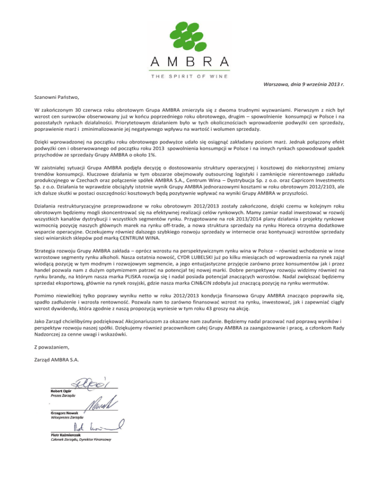 Warszawa, dnia 9 września 2013 r. Szanowni Państwo, W zakończonym 30 czerwca roku obrotowym Grupa AMBRA zmierzyła się z dwoma trudnymi wyzwaniami. Pierwszym z nich był wzrost cen surowców obserwowany już w końcu poprzedniego roku obrotowego, drugim – spowolnienie konsumpcji w Polsce i na pozostałych rynkach działalności. Priorytetowym działaniem było w tych okolicznościach wprowadzenie podwyżki cen sprzedaży, poprawienie marż i zminimalizowanie jej negatywnego wpływu na wartość i wolumen sprzedaży. Dzięki wprowadzonej na początku roku obrotowego podwyżce udało się osiągnąć zakładany poziom marż. Jednak połączony efekt podwyżki cen i obserwowanego od początku roku 2013 spowolnienia konsumpcji w Polsce i na innych rynkach spowodował spadek przychodów ze sprzedaży Grupy AMBRA o około 1%. W zaistniałej sytuacji Grupa AMBRA podjęła decyzję o dostosowaniu struktury operacyjnej i kosztowej do niekorzystnej zmiany trendów konsumpcji. Kluczowe działania w tym obszarze obejmowały outsourcing logistyki i zamknięcie nierentownego zakładu produkcyjnego w Czechach oraz połączenie spółek AMBRA S.A., Centrum Wina – Dystrybucja Sp. z o.o. oraz Capricorn Investments Sp. z o.o. Działania te wprawdzie obciążyły istotnie wynik Grupy AMBRA jednorazowymi kosztami w roku obrotowym 2012/2103, ale ich dalsze skutki w postaci oszczędności kosztowych będą pozytywnie wpływać na wyniki Grupy AMBRA w przyszłości. Działania restrukturyzacyjne przeprowadzone w roku obrotowym 2012/2013 zostały zakończone, dzięki czemu w kolejnym roku obrotowym będziemy mogli skoncentrować się na efektywnej realizacji celów rynkowych. Mamy zamiar nadal inwestować w rozwój wszystkich kanałów dystrybucji i wszystkich segmentów rynku. Przygotowane na rok 2013/2014 plany działania i projekty rynkowe wzmocnią pozycję naszych głównych marek na rynku off-trade, a nowa struktura sprzedaży na rynku Horeca otrzyma dodatkowe wsparcie operacyjne. Oczekujemy również dalszego szybkiego rozwoju sprzedaży w internecie oraz kontynuacji wzrostów sprzedaży sieci winiarskich sklepów pod marką CENTRUM WINA. Strategia rozwoju Grupy AMBRA zakłada – oprócz wzrostu na perspektywicznym rynku wina w Polsce – również wchodzenie w inne wzrostowe segmenty rynku alkoholi. Nasza ostatnia nowość, CYDR LUBELSKI już po kilku miesiącach od wprowadzenia na rynek zajął wiodącą pozycję w tym modnym i rozwojowym segmencie, a jego entuzjastyczne przyjęcie zarówno przez konsumentów jak i przez handel pozwala nam z dużym optymizmem patrzeć na potencjał tej nowej marki. Dobre perspektywy rozwoju widzimy również na rynku brandy, na którym nasza marka PLISKA rozwija się i nadal posiada potencjał znaczących wzrostów. Nadal zwiększać będziemy sprzedaż eksportową, głównie na rynek rosyjski, gdzie nasza marka CIN&CIN zdobyła już znaczącą pozycję na rynku wermutów. Pomimo niewielkiej tylko poprawy wyniku netto w roku 2012/2013 kondycja finansowa Grupy AMBRA znacząco poprawiła się, spadło zadłużenie i wzrosła rentowność. Pozwala nam to zarówno finansować wzrost na rynku, inwestować, jak i zapewniać ciągły wzrost dywidendy, która zgodnie z naszą propozycją wyniesie w tym roku 43 groszy na akcję. Jako Zarząd chcielibyśmy podziękować Akcjonariuszom za okazane nam zaufanie. Będziemy nadal pracować nad poprawą wyników i perspektyw rozwoju naszej spółki. Dziękujemy również pracownikom całej Grupy AMBRA za zaangażowanie i pracę, a członkom Rady Nadzorczej za cenne uwagi i wskazówki. Z poważaniem, Zarząd AMBRA S.A.