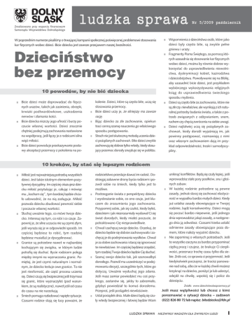 Nr 5/2009 pazdziernik Zrealizowano przy wsparciu finansowym Samorządu Województwa Dolnośląskiego W poprzednim numerze pisaliśmy o trwającej kampanii społecznej poświęconej problemowi stosowania kar fizycznych wobec dzieci. Bicie dziecka jest zawsze przejawem naszej bezsilności. Dzieciñstwo bez przemocy 10 powodów, by nie biæ dziecka Bicie dzieci może doprowadzać do fizycznych urazów, takich jak zasinienia, obrzęki, krwiaki podtwardówkowe, uszkodzenia nerwów i złamania kości. Bicie dziecka niszczy jego ufność i burzy poczucie własnej wartości. Dzieci znacznie chętniej podejmują zachowania nastawione na współpracę, jeśli łączy je z rodzicami silna więź miłości. Bicie dzieci powoduje przekazywanie postawy akceptacji przemocy z pokolenia na po- kolenie. Dzieci, które są często bite, uczą się stosowania przemocy. Bicie dzieci uczy je, że silniejszy ma zawsze rację. Bijąc dziecko za złe zachowanie, opiekun traci cenną szansę nauczenia go właściwego sposobu postępowania. Strach nie jest skuteczną metodą uczenia dzieci pożądanych zachowań. Bite dzieci zwykle zachowują się dobrze tylko wtedy, kiedy stosujący przemoc dorosły znajduje się w pobliżu. Wspomnienia z dzieciństwa osób, które jako dzieci były często bite, są zwykle pełne gniewu i urazy. Fragmenty Pisma Świętego, za pomocą których uzasadnia się stosowanie kar fizycznych wobec dzieci, można by równie dobrze wykorzystać do usprawiedliwienia niewolnictwa, dyskryminacji kobiet, kazirodztwa i dzieciobójstwa. Powoływanie się na Biblię, aby uzasadnić bicie dzieci, jest przykładem wybiórczego wykorzystywania religijnych ksiąg do usprawiedliwienia świeckiego sposobu myślenia. Dzieci są często bite za zachowania, które nie są złe czy niewłaściwe, ale wynikają z ich naturalnej potrzeby badania świata, a także z potrzeb związanych z odżywianiem, snem, ruchem czy chęcią zwrócenia na siebie uwagi. Dzieci najłatwiej uczą się pożądanych zachowań, kiedy dorośli wyjaśniają im, jak powinny postępować, rozmawiają z nimi oraz własnym zachowaniem dają im przykład odpowiedzialności, troski i samodyscypliny. 10 kroków, by staæ siê lepszym rodzicem Miłość jest najważniejszą potrzebą wszystkich dzieci. Jest także istotnym elementem pozytywnej dyscypliny. Im częściej okazujesz dziecku miłość przytulając je, całując i mówiąc mu „kocham cię”, tym bardziej będzie chciało udowodnić, że na nią zasługuje. Miłość pozwala dziecku zbudować pewność siebie i poczucie własnej wartości. Słuchaj uważnie tego, co mówi twoje dziecko. Interesuj się tym, co robi i co czuje. Zapewnij je, że silne uczucia nie są czymś złym, jeśli wyraża się je w odpowiedni sposób. Im częściej będziesz to robić, tym rzadziej będziesz musiał(a) je dyscyplinować. Granice są potrzebne nawet w najbardziej kochającym się związku, w którym ludzie potrafią się słuchać. Bycie rodzicem polega między innymi na wyznaczaniu granic. Pamiętaj, że jest czymś naturalnym i normalnym, że dziecko testuje owe granice. To nie jest niesforność, ale część procesu uczenia się. Dzieci czują się bezpieczniej jeśli trzymasz się granic, które wyznaczyłeś (pod warunkiem, że są realistyczne), nawet jeśli od czasu do czasu na nie narzekają. Śmiech pomaga rozładować napięte sytuacje. Czasami rodzice stają się tacy poważni, że rodzicielstwo przestaje dawać im radość. Dostrzegaj zabawne strony bycia rodzicem i pozwól sobie na śmiech, kiedy tylko jest to możliwe. Postrzeganie świata z perspektywy dziecka i wyobrażanie sobie, co ono czuje, jest kluczem do zrozumienia jego zachowania. Przypomnij sobie, jak się czułeś, kiedy byłeś, dzieckiem i jak niezrozumiały wydawał Ci się świat dorosłych, kiedy miałeś poczucie, że potraktowano Cię niesprawiedliwie. Chwal i zachęcaj swoje dziecko. Oczekuj, że dziecko będzie się dobrze zachowywało i zachęcaj je do podejmowania wysiłków. Chwal je za dobre zachowania i staraj się ignorować te niewłaściwe. Im częściej będziesz zrzędzić, tym rzadziej Twoje dziecko będzie Cię słuchać. Szanuj swoje dziecko tak, jak szanowałbyś dorosłego. Pozwól mu uczestniczyć w podejmowaniu decyzji, szczególnie tych, które go dotyczą. Uważnie wysłuchaj jego zdania. Jeśli masz zamiar powiedzieć mu coś przykrego, zastanów się, jakby to zabrzmiało, gdybyś powiedział to komuś dorosłemu. Przeproś, jeśli postąpiłeś niewłaściwie. Ustal porządek dnia. Małe dzieci będą się czuły wtedy bezpieczniej i łatwiej będzie Wam LUDZKA SPRAWA uniknąć konfliktów. Będą się czuły lepiej, jeśli wprowadzisz stałe pory posiłków, snu i głośnych zabaw. W każdej rodzinie potrzebne są pewne zasady, jednak staraj się zachować elastyczność w wypadku bardzo małych dzieci. Kiedy już ustalisz zasady obowiązujące w Twojej rodzinie, bądź konsekwentny. Dzieci mogą się poczuć bardzo niepewnie, jeśli jednego dnia wprowadzisz jakąś zasadę, a następnego dnia ją odwołasz. Czasami trzeba ustalić odmienne zasady obowiązujące poza domem, które należy wyjaśnić dziecku. Nie zapominaj o własnych potrzebach. Jeśli to wszystko zaczyna za bardzo przypominać ciężką pracę i czujesz, że brakuje Ci cierpliwości, przeznacz trochę czasu tylko dla siebie. Zrób coś, co sprawia ci przyjemność. Jeśli kiedykolwiek poczujesz, że tracisz panowanie nad sobą, albo że w każdej chwili możesz krzyknąć na dziecko, poniżyć je lub uderzyć, odejdź na chwilę, uspokój się i policz do dziesięciu. Źródło: www.dzieciństwobezprzemocy.pl Jeśli masz wątpliwości lub chcesz z kimś porozmawiać o sytuacji dziecka – zadzwoń (022) 826 80 72 lub napisz: [email protected] NIEZWYKŁY MAGAZYN DLA ZWYKŁYCH LUDZI I Nr 5/2009 pazdziernik Zrealizowano przy wsparciu finansowym Samorządu Województwa Dolnośląskiego Za czyje grzechy? Od września 20