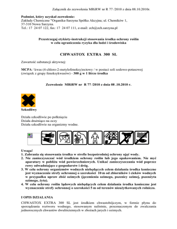 Załącznik do zezwolenia MRiRW nr R 77 /2010 z dnia 08.10.2010r. Podmiot, który uzyskał zezwolenie: Zakłady Chemiczne "Organika-Sarzyna Spółka Akcyjna; ul. Chemików 1, 37-310 Nowa Sarzyna. Tel.: 17 24 07 122, fax: 17 24 07 111, e-mail: [email protected] Przestrzegaj etykiety-instrukcji stosowania środka ochrony roślin w celu ograniczenia ryzyka dla ludzi i środowiska CHWASTOX EXTRA 300 SL Zawartość substancji aktywnej: MCPA / kwas (4-chloro-2-metylofenoksy)octowy / w postaci soli sodowo-potasowej (związek z grupy fenoksykwasów) - 300 g w 1 litrze środka Zezwolenie MRiRW nr R 77 /2010 z dnia 08 .10.2010 r. Szkodliwy Działa szkodliwie po połknięciu Działa drażniąco na oczy Działa szkodliwie na organizmy wodne. Uwaga! 1. Zabrania się stosowania środka w strefie bezpośredniej ochrony ujęć wody. 2. Nie zanieczyszczać wód środkiem ochrony roślin lub jego opakowaniem. Nie myć aparatury w pobliżu wód powierzchniowych. Unikać zanieczyszczania wód poprzez rowy odwadniające z gospodarstw i dróg. 3. W celu ochrony organizmów wodnych niebędących celem działania środka konieczne jest wyznaczenie strefy ochronnej o szerokości 10 m od zbiorników i cieków wodnych w przypadku upraw zbóż ozimych (jęczmienia ozimego, pszenicy ozimej, pszenżyta ozimego, żyta). 4. W celu ochrony roślin lądowych niebędących celem działania środka konieczne jest wyznaczenie strefy ochronnej o szerokości 5 m od terenów nieużytkowanych rolniczo. I OPIS DZIAŁANIA CHWASTOX EXTRA 300 SL jest środkiem chwastobójczym, w formie płynu do sporządzania roztworu wodnego, stosowanym nalistnie, przeznaczonym do zwalczania jednorocznych chwastów dwuliściennych w zbożach jarych i ozimych. DZIAŁANIE NA CHWASTY Środek pobierany jest głównie przez liście chwastów powodując ich deformację, a następnie zahamowanie wzrostu i zamieranie roślin. Środek najskuteczniej niszczy chwasty znajdujące się w fazie 2-6 liści. Chwasty wrażliwe: dymnica pospolita, komosa biała, ostróżeczka polna, poziewnik szorstki, stulicha psia, tasznik pospolity, tobołki polne. Chwasty średnio wrażliwe: chaber bławatek, mak polny. Chwasty średnio odporne: gwiazdnica pospolita, niezapominajka polna, rdest powojowaty, szarłat szorstki. Chwasty odporne: bratek polny, jasnota purpurowa, krzywoszyj polny, maruna bezwonna, przetacznik perski, przetacznik polny, przytulia czepna, rdest plamisty, rumian polny, miotła zbożowa. II ZAKRES STOSOWANIA ZBOŻA JARE i OZIME pszenica jara, jęczmień jary, pszenżyto jare, owies, pszenica ozima, jęczmień ozimy, pszenżyto ozime, żyto Termin stosowania: zabieg wykonać wiosną, od początku fazy krzewienia zbóż do końca tej fazy. Zalecana dawka: 3,0 l/ha. Zalecana ilość wody: 200-300 l/ha. Zalecane opryskiwanie: średniokropliste. Uwaga! Na teren potraktowany środkiem nie wpuszczać zwierząt gospodarskich, zwłaszcza bydła mlecznego, przez 21 dni od zabiegu. III NASTĘPSTWO ROŚLIN W przypadku konieczności likwidacji plantacji potraktowanej środkiem (w wyniku uszkodzenia roślin przez przymrozki, choroby lub szkodniki) po wykonaniu uprawy przedsiewnej można uprawiać inne rośliny z wyjątkiem gatunków specjalnie wrażliwych na środek np.: pomidor, buraki. IV OKRES KARENCJI Okres od dnia ostatniego zabiegu do dnia zbioru i przeznaczenia do konsumpcji NIE DOTYCZY. V OKRES PREWENCJI DLA LUDZI, ZWIERZĄT I PSZCZÓŁ Okres zapobiegający zatruciu NIE DOTYCZY. VI SPORZĄDZANIE CIECZY UŻYTKOWEJ Przed przystąpieniem do sporządzania cieczy użytkowej dokładnie ustalić potrzebną jej ilość. Odmierzoną ilość środka wlać do zbiornika opryskiwacza napełnionego częściowo wodą z włączonym mieszadłem. Opróżnione opakowania przepłukać trzykrotnie wodą, a popłuczyny wlać do zbiornika opryskiwacza z cieczą użytkową. Zbiornik opryskiwacza uzupełnić wodą do potrzebnej ilości. Opryskiwać z włączonym mieszadłem. Po wlaniu środka do zbiornika opryskiwacza nie wyposażonego w mieszadło hydrauliczne ciecz w zbiorniku mechanicznie wymieszać. W przypadku przerw w opryskiwaniu przed ponownym przystąpieniem do pracy należy dokładnie wymieszać ciecz użytkową w zbiorniku opryskiwacza. Po pracy aparaturę dokładnie wymyć. Ze względu na bardzo dużą wrażliwość niektórych roślin uprawnych nawet na znikome ilości środka, bardzo ważne jest dokładne wymycie opryskiwacza po zabiegu, zwłaszcza przed użyciem w innych roślinach uprawnych niż zalecane. VII PRZECHOWYWANIE Chronić przed dziećmi. Nie przechowywać razem z żywnością, napojami i paszami dla zwierząt. Przechowywać pojemnik szczelnie zamknięty. Przechowywać wyłącznie w oryginalnym opakowaniu w temperaturze nie niższej niż 0oC i nie wyższej niż 30oC. VIII WARUNKI BEZPIECZNEGO STOSOWANIA ŚRODKA OCHRONY ROŚLIN Unikać zanieczyszczenia oczu. Zanieczyszczone oczy przemyć natychmiast dużą ilością wody i zasięgnąć porady lekarza. Nosić odpowiednią odzież ochronną, odpowiednie rękawice ochronne, okulary i ochronę twarzy. W razie połknięcia niezwłocznie zasięgnij porady lekarza, pokaż opakowanie lub etykietę. Środka nie stosować: - w okresie suszy, - na rośliny chore, uszkodzone lub mokre, - w temperaturze poniżej 10oC i powyżej 25oC, - w okresie gdy temperatura nocą jest niższa niż 5oC, - przed zbliżającymi się przymrozkami i deszczem, - podczas wiatru, stwarzającego możliwość znoszenia cieczy użytkowej na sąsiednie rośliny uprawne. Podczas stosowania środka nie dopuścić do znoszenia cieczy użytkowej na sąsiednie plantacje roślin uprawnych oraz nakładania się cieczy użytkowej na stykach pasów zabiegowych i uwrociach. Resztki cieczy użytkowej rozcieńczyć wodą i wypryskać na powierzchni poprzednio opryskiwanej. Wodę użytą do mycia aparatury wypryskać na powierzchni uprzednio opryskiwanej, stosując te same środki ochrony osobistej. W przypadku mycia aparatury przy użyciu środków myjących 