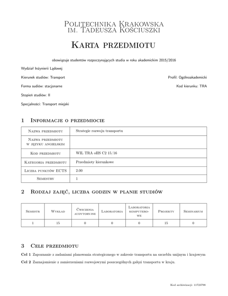 Politechnika Krakowska im. Tadeusza Kościuszki Karta przedmiotu obowiązuje studentów rozpoczynających studia w roku akademickim 2015/2016 Wydział Inżynierii Lądowej Kierunek studiów: Transport Profil: Ogólnoakademicki Forma sudiów: stacjonarne Kod kierunku: TRA Stopień studiów: II Specjalności: Transport miejski 1 Informacje o przedmiocie Nazwa przedmiotu Strategie rozwoju transportu Nazwa przedmiotu w języku angielskim Kod przedmiotu Kategoria przedmiotu Przedmioty kierunkowe Liczba punktów ECTS 2.00 1 Semestry 2 3 WIL TRA oIIS C2 15/16 Rodzaj zajęć, liczba godzin w planie studiów Semestr Wykład Ćwiczenia audytoryjne Laboratoria Laboratoria komputerowe Projekty Seminarium 1 15 0 0 0 15 0 Cele przedmiotu Cel 1 Zapoznanie z zadaniami planowania strategicznego w zakresie transportu na szczeblu unijnym i krajowym Cel 2 Zaznajomienie z zamierzeniami rozwojowymi poszczególnych gałęzi transportu w kraju. Kod archiwizacji: 11723798 Politechnika Krakowska im. Tadeusza Kościuszki 4 Wymagania wstępne w zakresie wiedzy, umiejętności i innych kompetencji 1 Planowanie sieci transportowych studia I stopnia, kierunek Transport 5 Efekty kształcenia EK1 Wiedza Opanowanie podstawowych zadań planowania strategicznego w zakresie transportu na szczeblu unijnym i krajowym EK2 Wiedza Utrwalenie wiedzy w zakresie zamierzeń rozwojowych poszczególnych gałęzi transportu w Polsce EK3 Umiejętności Umiejętność sporządzania prognoz ruchu w regionalnym transporcie publicznym z wykorzystaniem uproszczonych modeli podróży EK4 Kompetencje społeczne Kompetencje społeczne wg programu ogólnowydziałowego 6 Treści programowe Wykład Lp Tematyka zajęć Opis szczegółowy bloków tematycznych Liczba godzin W1 Strategia rozwoju transportu w dokumentach Unii Europejskiej 3 W2 Problematyka transportowa w dokumencie strategicznym Polska 2030 2 W3 Strategia rozwoju transportu kolejowego w Polsce. 3 W4 Strategia rozwoju transportu drogowego w Polsce 2 W5 Strategia rozwoju transportu lotniczego, żeglugi morskiej i śródlądowej w Polsce 3 W6 Strategia rozowoju transportu Małopolski 2 Projekty Lp Tematyka zajęć Opis szczegółowy bloków tematycznych P1 Przedstawienie zakresu ćwiczenia projektowego. Wydanie tematów ćwiczeń projektowych obejmujących analizę obsługi komunikacyjnej wybranego powiatu. 2 P2 Analiza istniejącego systemu transportowego wybranego powiatu słabe i mocne strony 2 P3 Analiza zamierzeń inwestycyjnych krajowych i wojewódzkich na obszarze powiatu pod kątem wykorzystania do obsługi ruchu w obrębie powiatu. 2 P4 Propozycja modelu obsługi powiatu transportem publicznym i zwiększenie wykorzystania kolei w podróżach 2 Strona 2/6 Liczba godzin Politechnika Krakowska im. Tadeusza Kościuszki Projekty 7 Lp Tematyka zajęć Opis szczegółowy bloków tematycznych Liczba godzin P5 Opracowanie modelu symulacyjnego wybranego powiatu w programie VISUM. 3 P6 Weryfikacja zaproponowanego systemu transportowego za pomocą programu VISUM. Analiza otrzymanych wyników. 2 P7 Prezentacja wyników projektu i uzyskanie zaliczenia 2 Narzędzia dydaktyczne N1 Wykłady N2 Ćwiczenia projektowe N3 Konsultacje 8 Obciążenie pracą studenta Średnia liczba godzin na zrealizowanie aktywności Forma aktywności Godziny kontaktowe z nauczycielem akademickim, w tym: Godziny wynikające z planu studiów 30 Konsultacje przedmiotowe 0 Egzaminy i zaliczenia w sesji 0 Godziny bez udziału nauczyciela akademickiego wynikające z nakładu pracy studenta, w tym: Przygotowanie się do zajęć, w tym studiowanie zalecanej literatury 15 Opracowanie wyników 10 Przygotowanie raportu, projektu, prezentacji, dyskusji 5 Sumaryczna liczba godzin dla przedmiotu wynikająca z całego nakładu pracy studenta Sumaryczna liczba punktów ECTS dla przedmiotu 9 Sposoby oceny Ocena formująca F1 Projekt zespołowy Strona 3/6 60 2.00 Politechnika Krakowska im. Tadeusza Kościuszki Ocena podsumowująca P1 Test Kryteria oceny Efekt kształcenia 1 Na ocenę 2.0 Uzyskanie z testu zaliczeniowego 32% i mniej punktów w stosunku do możliwego maksimum Na ocenę 3.0 Uzyskanie z testu zaliczeniowego 33-44% punktów w stosunku do możliwego maksimum Na ocenę 3.5 Uzyskanie z testu zaliczeniowego 45-56% punktów w stosunku do możliwego maksimum Na ocenę 4.0 Uzyskanie z testu zaliczeniowego 57-68% punktów w stosunku do możliwego maksimum Na ocenę 4.5 Uzyskanie z testu zaliczeniowego 69-80% punktów w stosunku do możliwego maksimum Na ocenę 5.0 Uzyskanie z testu zaliczeniowego ponad 81% punktów w stosunku do możliwego maksimum Efekt kształcenia 2 Na ocenę 2.0 Uzyskanie z testu zaliczeniowego 32% i mniej punktów w stosunku do możliwego maksimum Na ocenę 3.0 Uzyskanie z testu zaliczeniowego 33-44% punktów w stosunku do możliwego maksimum Na ocenę 3.5 Uzyskanie z testu zaliczeniowego 45-56% punktów w stosunku do możliwego maksimum Na ocenę 4.0 Uzyskanie z testu zaliczeniowego 57-68% punktów w stosunku do możliwego maksimum Na ocenę 4.5 Uzyskanie z testu zaliczeniowego 69-80% punktów w stosunku do możliwego maksimum Na ocenę 5.0 Uzyskanie z testu zaliczeniowego ponad 81% punktów w stosunku do możliwego maksimum Efekt kształcenia 3 Na ocenę 2.0 Ocena opracowanego projektu rozwoju sieci drogowej powiatu obejmująca: samodzielność wykonania ćwiczenia projektowego, poprawność stosowanej terminologii z zakresu planowania komunikacyjnego, kreatywność w formułowanej koncepcji rozwoju sieci ulic, poprawność przeprowadzanych obliczeń, trafność interpretacji wyników i odpowiedzi na pytania. uzyskanie 39% i mniej spełnienia wymagań zagregowanych Na ocenę 3.0 uzyskanie 40-50% spełnienia wymagań zagregowanych Strona 4/6 Politechnika Krakowska im. Tadeusza Kościuszki Na ocenę 3.5 uzyskanie 51-60% spełnienia wymagań zagregowanych Na ocenę 4.0 uzyskanie 61-70% spełnienia wymagań zagregowanych Na ocenę 4.5 uzyskanie 71-80% spełnienia wymagań zagregowanych Na ocenę 5.0 uzyskanie po