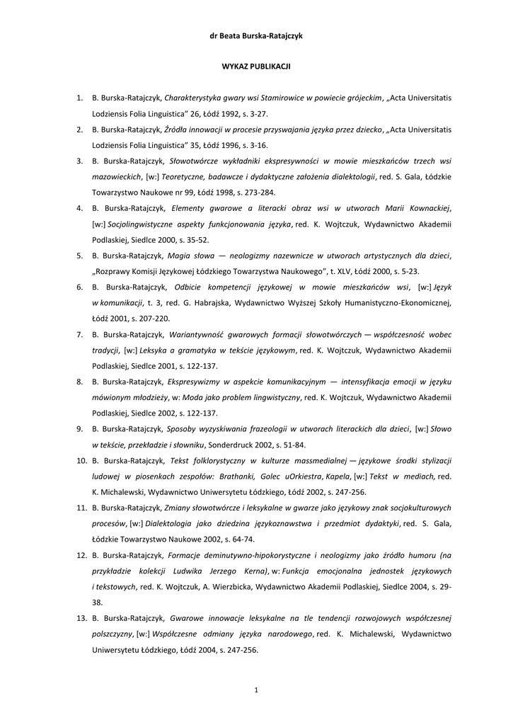 dr Beata Burska-Ratajczyk WYKAZ PUBLIKACJI 1. B. Burska-Ratajczyk, Charakterystyka gwary wsi Stamirowice w powiecie grójeckim, „Acta Universitatis Lodziensis Folia Linguistica” 26, Łódź 1992, s. 3-27. 2. B. Burska-Ratajczyk, Źródła innowacji w procesie przyswajania języka przez dziecko, „Acta Universitatis Lodziensis Folia Linguistica” 35, Łódź 1996, s. 3-16. 3. B. Burska-Ratajczyk, Słowotwórcze wykładniki ekspresywności w mowie mieszkańców trzech wsi mazowieckich, [w:] Teoretyczne, badawcze i dydaktyczne założenia dialektologii, red. S. Gala, Łódzkie Towarzystwo Naukowe nr 99, Łódź 1998, s. 273-284. 4. B. Burska-Ratajczyk, Elementy gwarowe a literacki obraz wsi w utworach Marii Kownackiej, [w:] Socjolingwistyczne aspekty funkcjonowania języka, red. K. Wojtczuk, Wydawnictwo Akademii Podlaskiej, Siedlce 2000, s. 35-52. 5. B. Burska-Ratajczyk, Magia słowa — neologizmy nazewnicze w utworach artystycznych dla dzieci, „Rozprawy Komisji Językowej Łódzkiego Towarzystwa Naukowego”, t. XLV, Łódź 2000, s. 5-23. 6. B. Burska-Ratajczyk, Odbicie kompetencji językowej w mowie mieszkańców wsi, [w:] Język w komunikacji, t. 3, red. G. Habrajska, Wydawnictwo Wyższej Szkoły Humanistyczno-Ekonomicznej, Łódź 2001, s. 207-220. 7. B. Burska-Ratajczyk, Wariantywność gwarowych formacji słowotwórczych — współczesność wobec tradycji, [w:] Leksyka a gramatyka w tekście językowym, red. K. Wojtczuk, Wydawnictwo Akademii Podlaskiej, Siedlce 2001, s. 122-137. 8. B. Burska-Ratajczyk, Ekspresywizmy w aspekcie komunikacyjnym — intensyfikacja emocji w języku mówionym młodzieży, w: Moda jako problem lingwistyczny, red. K. Wojtczuk, Wydawnictwo Akademii Podlaskiej, Siedlce 2002, s. 122-137. 9. B. Burska-Ratajczyk, Sposoby wyzyskiwania frazeologii w utworach literackich dla dzieci, [w:] Słowo w tekście, przekładzie i słowniku, Sonderdruck 2002, s. 51-84. 10. B. Burska-Ratajczyk, Tekst folklorystyczny w kulturze massmedialnej — językowe środki stylizacji ludowej w piosenkach zespołów: Brathanki, Golec uOrkiestra, Kapela, [w:] Tekst w mediach, red. K. Michalewski, Wydawnictwo Uniwersytetu Łódzkiego, Łódź 2002, s. 247-256. 11. B. Burska-Ratajczyk, Zmiany słowotwórcze i leksykalne w gwarze jako językowy znak socjokulturowych procesów, [w:] Dialektologia jako dziedzina językoznawstwa i przedmiot dydaktyki, red. S. Gala, Łódzkie Towarzystwo Naukowe 2002, s. 64-74. 12. B. Burska-Ratajczyk, Formacje deminutywno-hipokorystyczne i neologizmy jako źródło humoru (na przykładzie kolekcji Ludwika Jerzego Kerna), w: Funkcja emocjonalna jednostek językowych i tekstowych, red. K. Wojtczuk, A. Wierzbicka, Wydawnictwo Akademii Podlaskiej, Siedlce 2004, s. 2938. 13. B. Burska-Ratajczyk, Gwarowe innowacje leksykalne na tle tendencji rozwojowych współczesnej polszczyzny, [w:] Współczesne odmiany języka narodowego, red. K. Michalewski, Wydawnictwo Uniwersytetu Łódzkiego, Łódź 2004, s. 247-256. 1 dr Beata Burska-Ratajczyk 14. B. Burska-Ratajczyk, Dawne fakty językowe i ich walor edukacyjny (na materiale frazeologii ludowej), [w:] Diachronia w badaniach nad językiem i w dydaktyce szkoły wyższej, „Rozprawy Komisji Językowej Łódzkiego Towarzystwa Naukowego”, t. LI, cz. I, 2006, s. 39-48. 15. B. Burska-Ratajczyk, Ludowe ekspresywizmy słowotwórcze dotyczące mówienia (na materiale gwar mazowieckich), [w:] Wyrażanie emocji, red. K. Michalewski, Wydawnictwo Uniwersytetu Łódzkiego, Łódź 2006, s. 367-377. 16. B. Burska-Ratajczyk, Skibą w mur - związki frazeologiczne jako środek wyrażania emocji w felietonach Krzysztofa Skiby, w: Wokół językowej funkcji emocjonalnej. Fakty dawne i współczesne, red. K. Wojtczuk, V. Machnicka, Wydawnictwo Akademii Podlaskiej, Siedlce 2006, s. 21-32. 17. B. Burska-Ratajczyk, Nowoczesność i tradycja jako językowych środek perswazji w prasowych reklamach wyrobów perfumeryjnych, [w:] Język w marketingu, red. K. Michalewski, Wydawnictwo Uniwersytetu Łódzkiego, Łódź 2008, s. 115-123. 18. B. Burska-Ratajczyk, Wartościowanie komunikacji językowej (na materiale frazeologii gwar mazowieckich), [w:] Język, społeczeństwo, wartości, Prace Komisji Językowej Bydgoskiego Towarzystwa Naukowego, t. XVIII, red. E. Laskowska, I. Benenowska, M. Jaracz, Bydgoszcz 2008, s. 7184. 19. B. Burska-Ratajczyk, Emocjonalizmy frazeologiczne dotyczące sfery intelektu w języku młodzieży studenckiej, [w:] Rejestr emocjonalny języka, red. K. Wojtczuk, V. Machnicka, Wydawnictwo Akademii Podlaskiej, Siedlce 2009, s. 9-17. 20. B. Burska-Ratajczyk, Kategoria natury jako językowy środek perswazji w prasowych reklamach wyrobów kosmetycznych, [w:] Język, biznes, media, red. A. Rypel, D. Jastrzębska-Golonka, G. Sawicka, Prace Komisji Językoznawczej Bydgoskiego Towarzystwa Naukowego, t. XIX, Bydgoszcz 2009, s. 385394. 21. B. Burska-Ratajczyk, Językowy obraz matki w powieści „Kamień na kamieniu" Wiesława Myśliwskiego, [w:] Z zagadnień semantyki i stylistyki tekstu, red. A. Ginter, Wydawnictwo Uniwersytetu Łódzkiego, Łódź 2010, s. 101-109. 22. B. Burska-Ratajczyk, Kreowanie własnego wizerunku w kontekście językowej prezentacji przeciwnika politycznego (na przykładzie wypowiedzi Lecha Wałęsy), [w:] Język w prawie, administracji i gospodarce, red. K. Michalewski, Wydawnictwo Uniwersytetu Łódzkiego, Łódź 2010, s. 211-224. 23. B. Burska-Ratajczyk, Ocena aktywności człowieka w połączeniach wyrazowych z komponentem liczebnikowym, w: Ilość — wielkość — wartość, red. E. Umińska-Tytoń, Archidiecezjalne Wydawnictwo Łódzkie, Łódź 2010, s. 25-36. 24. Antroponimy jako element groteski w powieści Telemaniak Jacka Dąbały, [w:] Język nowych mediów i nowej literatury, red. K. Michalewski, cz. 1, Język nowej literatury, PRIMUM WERBUM, Łódź 2012, s. 30-40. 25. B. Burska-Ratajczyk, Realizacja funkcji perswazyjnej w tekstach gwarowych, Wydawnictwo Uniwersytetu Łódzkiego, Ł