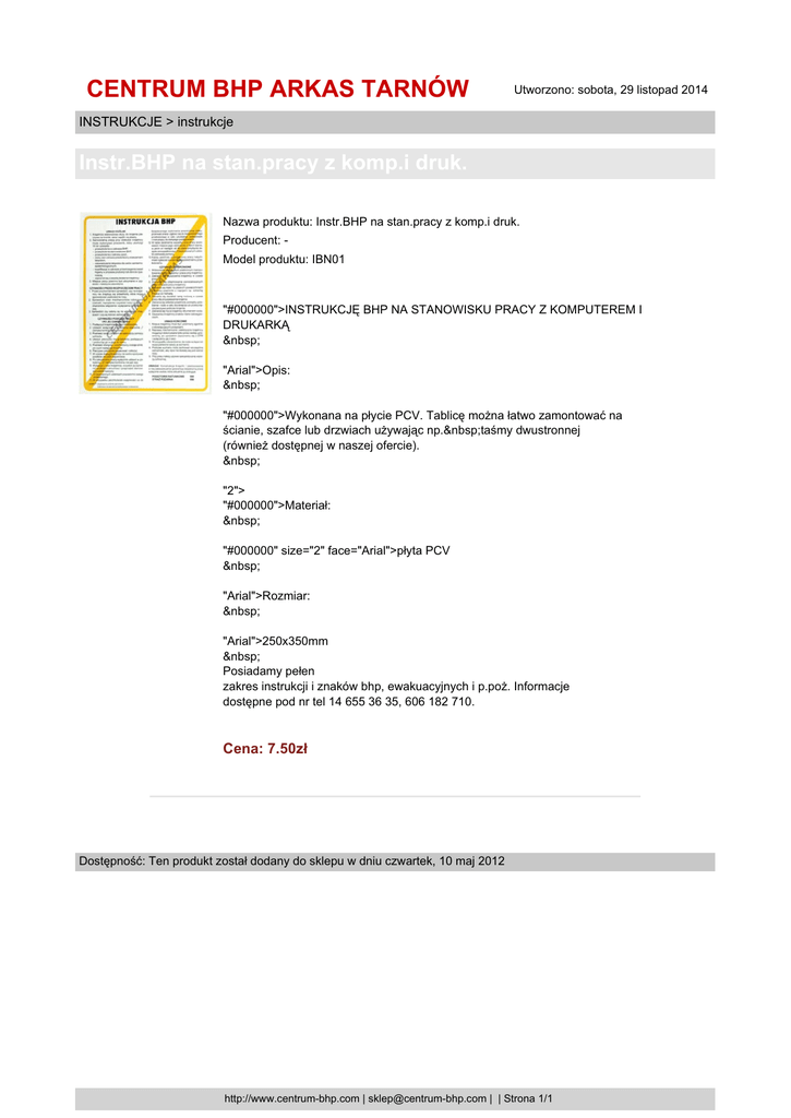 CENTRUM BHP ARKAS TARNÓW Utworzono: sobota, 29 listopad 2014 INSTRUKCJE > instrukcje Instr.BHP na stan.pracy z komp.i druk. Nazwa produktu: Instr.BHP na stan.pracy z komp.i druk. Producent: Model produktu: IBN01 "#000000">INSTRUKCJĘ BHP NA STANOWISKU PRACY Z KOMPUTEREM I DRUKARKĄ "Arial">Opis: "#000000">Wykonana na płycie PCV. Tablicę można łatwo zamontować na ścianie, szafce lub drzwiach używając np. taśmy dwustronnej (również dostępnej w naszej ofercie). "2"> "#000000">Materiał: "#000000" size="2" face="Arial">płyta PCV "Arial">Rozmiar: "Arial">250x350mm Posiadamy pełen zakres instrukcji i znaków bhp, ewakuacyjnych i p.poż. Informacje dostępne pod nr tel 14 655 36 35, 606 182 710. Cena: 7.50zł Dostępność: Ten produkt został dodany do sklepu w dniu czwartek, 10 maj 2012 http://www.centrum-bhp.com | [email protected] | | Strona 1/1