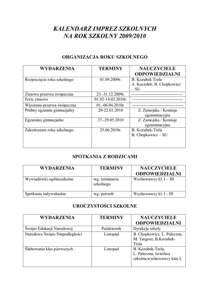 kalendarz imprez szkolnych na rok szkolny 2009/2010