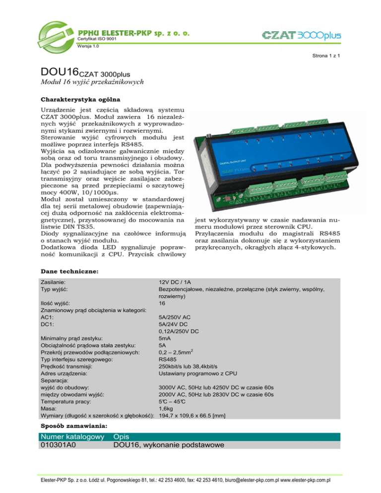 Certyfikat ISO 9001 Wersja 1.0 Strona 1 z 1 DOU16CZAT 3000plus Moduł 16 wyjść przekaźnikowych Charakterystyka ogólna Urządzenie jest częścią składową systemu CZAT 3000plus. Moduł zawiera 16 niezależnych wyjść przekaźnikowych z wyprowadzonymi stykami zwiernymi i rozwiernymi. Sterowanie wyjść cyfrowych modułu jest możliwe poprzez interfejs RS485. Wyjścia są odizolowane galwanicznie między sobą oraz od toru transmisyjnego i obudowy. Dla podwyższenia pewności działania można łączyć po 2 sąsiadujące ze sobą wyjścia. Tor transmisyjny oraz wejście zasilające zabezpieczone są przed przepięciami o szczytowej mocy 400W, 10/1000µs. Moduł został umieszczony w standardowej dla tej serii metalowej obudowie (zapewniającej dużą odporność na zakłócenia elektromagnetyczne), przystosowanej do mocowania na listwie DIN TS35. Diody sygnalizacyjne na czołówce informują o stanach wyjść modułu. Dodatkowa dioda LED sygnalizuje poprawność komunikacji z CPU. Przycisk chwilowy jest wykorzystywany w czasie nadawania numeru modułowi przez sterownik CPU. Przyłączenia modułu do magistrali RS485 oraz zasilania dokonuje się z wykorzystaniem przykręcanych, okrągłych złącz 4-stykowych. Dane techniczne: Zasilanie: Typ wyjść: Ilość wyjść: Znamionowy prąd obciążenia w kategorii: AC1: DC1: Minimalny prąd zestyku: Obciążalność prądowa stała zestyku: Przekrój przewodów podłączeniowych: Typ interfejsu szeregowego: Prędkość transmisji: Adres urządzenia: Separacja: wyjść do obudowy: między obwodami wyjść: Temperatura pracy: Masa: Wymiary (długość x szerokość x głębokość): 12V DC / 1A Bezpotencjałowe, niezależne, przełączne (styk zwierny, wspólny, rozwierny) 16 5A/250V AC 5A/24V DC 0,12A/250V DC 5mA 5A 2 0,2 – 2,5mm RS485 250kbit/s lub 38,4kbit/s Ustawiany programowo z CPU 3000V AC, 50Hz lub 4250V DC w czasie 60s 2000V AC, 50Hz lub 2830V DC w czasie 60s 5°C – 45°C 1,6kg 194,7 x 109,6 x 66.5 [mm] Sposób zamawiania: Numer katalogowy 010301A0 Opis DOU16, wykonanie podstawowe Elester-PKP Sp. z o.o. Łódź ul. Pogonowskiego 81, tel.: 42 253 4600, fax: 42 253 4610, [email protected] www.elester-pkp.com.pl