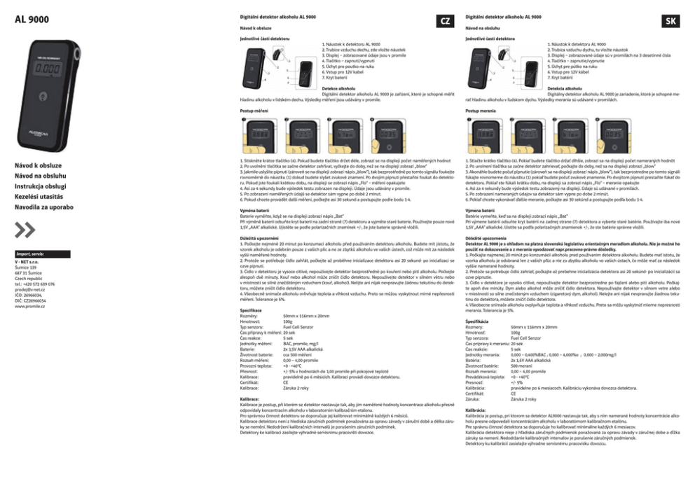 AL 9000 Digitální detektor alkoholu AL 9000 CZ Návod k obsluze Jednotlivé části detektoru Digitální detektor alkoholu AL 9000 Jednotlivé časti detektora 1. Náustek k detektoru AL 9000 2. Trubice vzduchu dechu, zde vložte náustek 3. Displej – zobrazované údaje jsou v promile 4. Tlačítko – zapnutí/vypnutí 5. Úchyt pro poutko na ruku 6. Vstup pro 12V kabel 7. Kryt baterií Návod k obsluze Návod na obsluhu Instrukcja obsługi Kezelési utasítás Navodila za uporabo Import, servis: V - NET s.r.o. Šumice 139 687 31 Šumice Czech republic tel.: +420 572 639 076 [email protected] IČO: 26966034, DIČ: CZ26966034 www.promile.cz SK Návod na obsluhu 1. Náustok k detektoru AL 9000 2. Trubica vzduchu dychu, tu vložte náustok 3. Displej – zobrazované údaje sú v promilách na 3 desetinné čísla 4. Tlačítko – zapnutie/vypnutie 5. Úchyt pre pútko na ruku 6. Vstup pre 12V kábel 7. Kryt batérií Detekce alkoholu Digitální detektor alkoholu AL 9000 je zařízení, které je schopné měřit hladinu alkoholu v lidském dechu. Výsledky měření jsou udávány v promile. Detekcia alkoholu Digitálny detektor alkoholu AL 9000 je zariadenie, ktoré je schopné merať hladinu alkoholu v ľudskom dychu. Výsledky merania sú udávané v promilách. Postup měření Postup merania 1. Stiskněte krátce tlačítko (4). Pokud budete tlačítko držet déle, zobrazí se na displeji počet naměřených hodnot 2. Po uvolnění tlačítka se začne detektor zahřívat, vyčkejte do doby, než se na displeji zobrazí „blow“ 3. Jakmile uslyšíte pípnutí (zároveň se na displeji zobrazí nápis „blow“), tak bezprostředně po tomto signálu foukejte rovnoměrně do náustku (1) dokud budete slyšet zvukové znamení. Po dvojím pípnutí přestaňte foukat do detektoru. Pokud jste foukali krátkou dobu, na displeji se zobrazí nápis „Flo“ – měření opakujete 4. Asi za 4 sekundy bude výsledek testu zobrazen na displeji. Údaje jsou udávány v promile. 5. Po zobrazení naměřených údajů se detektor sám vypne po době 2 minut. 6. Pokud chcete provádět další měření, počkejte asi 30 sekund a postupujte podle bodu 1-4. 1. Stlačte krátko tlačítko (4). Pokiaľ budete tlačítko držať dlhšie, zobrazí sa na displeji počet nameraných hodnôt 2. Po uvolnení tlačítka sa začne detektor zahrievať, počkajte do doby, než sa na displeji zobrazí „blow“ 3. Akonáhle budete počuť pípnutie (zároveň sa na displeji zobrazí nápis „blow“), tak bezprostredne po tomto signáli fúkajte rovnomerne do náustku (1) pokiaľ budete počuť zvukové znamenie. Po dvojitom pípnutí prestaňte fúkať do detektoru. Pokiaľ ste fúkali krátku dobu, na displeji sa zobrazí nápis „Flo“ – meranie opakujte 4. Asi za 4 sekundy bude výsledok testu zobrazený na displeji. Údaje sú udávané v promilách. 5. Po zobrazení nameraných údajov sa detektor sám vypne po dobe 2 minút. 6. Pokiaľ chcete vykonávať ďalšie meranie, počkajte asi 30 sekúnd a postupujte podľa bodu 1-4. Výměna baterií Baterie vyměňte, když se na displeji zobrazí nápis „Bat“ Při výměně baterií odsuňte kryt baterií na zadní straně (7) detektoru a vyjměte staré baterie. Používejte pouze nové 1,5V „AAA“ alkalické. Ujistěte se podle polarizačních znamínek +/-, že jste baterie správně vložili. Výmena batérií Batérie vymeňte, keď sa na displeji zobrazí nápis „Bat“ Pri výmene batérií odsuňte kryt batérií na zadnej strane (7) detektora a vyberte staré batérie. Používajte iba nové 1,5V „AAA“ alkalické. Uistite sa podľa polarizačných znamienok +/-, že ste batérie správne vložili. Důležitá upozornění 1. Počkejte nejméně 20 minut po konzumaci alkoholu před používáním detektoru alkoholu. Budete mít jistotu, že vzorek alkoholu je odebrán pouze z vašich plic a ne ze zbytků alkoholu ve vašich ústech, což může mít za následek vyšší naměřené hodnoty. 2. Protože se potřebuje čidlo zahřát, počkejte až proběhne inicializace detektoru asi 20 sekund- po inicializaci se ozve pípnutí. 3. Čidlo v detektoru je vysoce citlivé, nepoužívejte detektor bezprostředně po kouření nebo pití alkoholu. Počkejte alespoň dvě minuty. Kouř nebo alkohol může zničit čidlo detektoru. Nepoužívejte detektor v silném větru nebo v místnosti se silně znečištěným vzduchem (kouř, alkohol). Nelijte ani nijak nevpravujte žádnou tekutinu do detektoru, můžete zničit čidlo detektoru. 4. Všeobecně snímače alkoholu ovlivňuje teplota a vlhkost vzduchu. Proto se můžou vyskytnout mírné nepřesnosti měření. Tolerance je 5%. Dôležité upozornenia Detektor AL 9000 je s ohľadom na platnú slovenskú legislatívu orientačným meradlom alkoholu. Nie je možné ho použiť na dokazovanie a z merania vyvodzovať napr.pracovno-právne dôsledky. 1. Počkajte najmenej 20 minút po konzumácií alkoholu pred používaním detektora alkoholu. Budete mať istotu, že vzorka alkoholu je odobraná len z vašich pľúc a nie zo zbytku alkoholu vo vašich ústach, čo môže mať za následok vyššie namerané hodnoty. 2. Pretože sa potrebuje čidlo zahriať, počkajte až prebehne inicializácia detektora asi 20 sekúnd- po inicializácií sa ozve pípnutie. 3. Čidlo v detektore je vysoko citlivé, nepoužívajte detektor bezprostredne po fajčení alebo pití alkoholu. Počkajte apoň dve minúty. Dym alebo alkohol môže zničiť čidlo detektora. Nepoužívajte detektor v silnom vetre alebo v miestnosti so silne znečisteným vzduchem (cigaretový dym, alkohol). Nelejte ani nijak nevpravujte žiadnou tekutinu do detektora, môžete zničiť čidlo detektora. 4. Všeobecne snímače alkoholu ovplyvňuje teplota a vlhkosť vzduchu. Preto sa môžu vyskytnúť mierne nepresnosti merania. Tolerancia je 5%. Specifikace Rozměry: 50mm x 116mm x 20mm Hmotnost: 100g Typ senzor