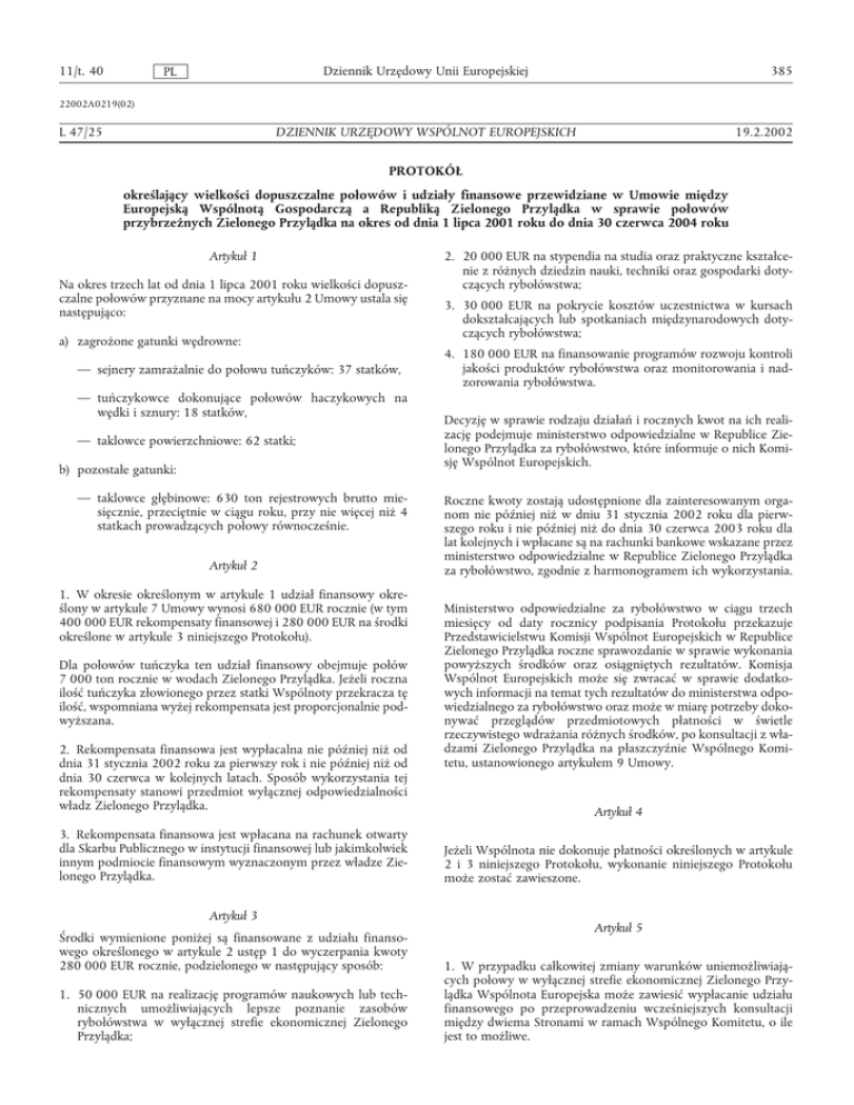 11/t. 40 Dziennik Urzędowy Unii Europejskiej PL 385 22002A0219(02) L 47/25 DZIENNIK URZĘDOWY WSPÓLNOT EUROPEJSKICH 19.2.2002 PROTOKÓŁ określający wielkości dopuszczalne połowów i udziały finansowe przewidziane w Umowie między Europejską Wspólnotą Gospodarczą a Republiką Zielonego Przylądka w sprawie połowów przybrzeżnych Zielonego Przylądka na okres od dnia 1 lipca 2001 roku do dnia 30 czerwca 2004 roku Artykuł 1 Na okres trzech lat od dnia 1 lipca 2001 roku wielkości dopuszczalne połowów przyznane na mocy artykułu 2 Umowy ustala się następująco: a) zagrożone gatunki wędrowne: — sejnery zamrażalnie do połowu tuńczyków: 37 statków, — tuńczykowce dokonujące połowów haczykowych na wędki i sznury: 18 statków, — taklowce powierzchniowe: 62 statki; b) pozostałe gatunki: — taklowce głębinowe: 630 ton rejestrowych brutto miesięcznie, przeciętnie w ciągu roku, przy nie więcej niż 4 statkach prowadzących połowy równocześnie. Artykuł 2 1. W okresie określonym w artykule 1 udział finansowy określony w artykule 7 Umowy wynosi 680 000 EUR rocznie (w tym 400 000 EUR rekompensaty finansowej i 280 000 EUR na środki określone w artykule 3 niniejszego Protokołu). Dla połowów tuńczyka ten udział finansowy obejmuje połów 7 000 ton rocznie w wodach Zielonego Przylądka. Jeżeli roczna ilość tuńczyka złowionego przez statki Wspólnoty przekracza tę ilość, wspomniana wyżej rekompensata jest proporcjonalnie podwyższana. 2. Rekompensata finansowa jest wypłacalna nie później niż od dnia 31 stycznia 2002 roku za pierwszy rok i nie później niż od dnia 30 czerwca w kolejnych latach. Sposób wykorzystania tej rekompensaty stanowi przedmiot wyłącznej odpowiedzialności władz Zielonego Przylądka. 3. Rekompensata finansowa jest wpłacana na rachunek otwarty dla Skarbu Publicznego w instytucji finansowej lub jakimkolwiek innym podmiocie finansowym wyznaczonym przez władze Zielonego Przylądka. Artykuł 3 Środki wymienione poniżej są finansowane z udziału finansowego określonego w artykule 2 ustęp 1 do wyczerpania kwoty 280 000 EUR rocznie, podzielonego w następujący sposób: 1. 50 000 EUR na realizację programów naukowych lub technicznych umożliwiających lepsze poznanie zasobów rybołówstwa w wyłącznej strefie ekonomicznej Zielonego Przylądka; 2. 20 000 EUR na stypendia na studia oraz praktyczne kształcenie z różnych dziedzin nauki, techniki oraz gospodarki dotyczących rybołówstwa; 3. 30 000 EUR na pokrycie kosztów uczestnictwa w kursach dokształcających lub spotkaniach międzynarodowych dotyczących rybołówstwa; 4. 180 000 EUR na finansowanie programów rozwoju kontroli jakości produktów rybołówstwa oraz monitorowania i nadzorowania rybołówstwa. Decyzję w sprawie rodzaju działań i rocznych kwot na ich realizację podejmuje ministerstwo odpowiedzialne w Republice Zielonego Przylądka za rybołówstwo, które informuje o nich Komisję Wspólnot Europejskich. Roczne kwoty zostają udostępnione dla zainteresowanym organom nie później niż w dniu 31 stycznia 2002 roku dla pierwszego roku i nie później niż do dnia 30 czerwca 2003 roku dla lat kolejnych i wpłacane są na rachunki bankowe wskazane przez ministerstwo odpowiedzialne w Republice Zielonego Przylądka za rybołówstwo, zgodnie z harmonogramem ich wykorzystania. Ministerstwo odpowiedzialne za rybołówstwo w ciągu trzech miesięcy od daty rocznicy podpisania Protokołu przekazuje Przedstawicielstwu Komisji Wspólnot Europejskich w Republice Zielonego Przylądka roczne sprawozdanie w sprawie wykonania powyższych środków oraz osiągniętych rezultatów. Komisja Wspólnot Europejskich może się zwracać w sprawie dodatkowych informacji na temat tych rezultatów do ministerstwa odpowiedzialnego za rybołówstwo oraz może w miarę potrzeby dokonywać przeglądów przedmiotowych płatności w świetle rzeczywistego wdrażania różnych środków, po konsultacji z władzami Zielonego Przylądka na płaszczyźnie Wspólnego Komitetu, ustanowionego artykułem 9 Umowy. Artykuł 4 Jeżeli Wspólnota nie dokonuje płatności określonych w artykule 2 i 3 niniejszego Protokołu, wykonanie niniejszego Protokołu może zostać zawieszone. Artykuł 5 1. W przypadku całkowitej zmiany warunków uniemożliwiających połowy w wyłącznej strefie ekonomicznej Zielonego Przylądka Wspólnota Europejska może zawiesić wypłacanie udziału finansowego po przeprowadzeniu wcześniejszych konsultacji między dwiema Stronami w ramach Wspólnego Komitetu, o ile jest to możliwe. 386 Dziennik Urzędowy Unii Europejskiej PL 2. Wypłacanie udziału finansowego zostanie wznowione, gdy sytuacja powróci do normy, po przeprowadzeniu konsultacji między dwoma Stronami, które potwierdzą, że zaistniała możliwość podjęcie działalności połowowej w zwykłym trybie. 11/t. 40 niniejszym traci moc i zostaje zastąpiony Załącznikiem do niniejszego Protokołu. Artykuł 7 Artykuł 6 Załącznik do Umowy między Europejską Wspólnotą Gospodarczą a Republiką Zielonego Przylądka w sprawie połowów na wodach przybrzeżnych Zielonego Przylądka Niniejszy Protokół wraz z załącznikami wchodzi w życie z dniem wzajemnej notyfikacji obydwu Stron o zakończeniu procedur niezbędnych w tym celu. Niniejszy Protokół stosuje się od dnia 1 lipca 2001 roku. 11/t. 40 Dziennik Urzędowy Unii Europejskiej PL ZAŁĄCZNIK WARUNKI PROWADZENIA POŁOWÓW PRZEZ STATKI WSPÓLNOTOWE W STREFIE POŁOWOWEJ ZIELONEGO PRZYLĄDKA 1. Wnioski o licencje i ich wydawanie 1.1. Właściwe władze Wspólnoty przedstawią ministerstwu Republiki Zielonego Przylądka odpowiedzialnemu za rybołówstwo, za pośrednictwem Przedstawicielstwa Komisji Wspólnot Europejskich w Republice Zielonego Przylądka, wnioski dotyczące każdego statku, który zamierza dokonywać połowów zgodnie z Umową najpóźniej na 15 dni przed datą rozpoczęcia wnioskowanego terminu ważności. Wnioski są s