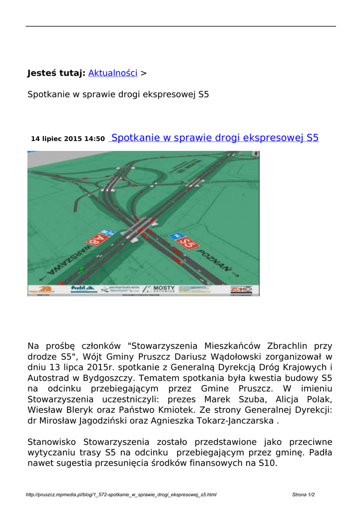 Jesteś tutaj: Aktualności > Spotkanie w sprawie drogi ekspresowej S5 14 lipiec 2015 14:50 Spotkanie w sprawie drogi ekspresowej S5 Na prośbę członków "Stowarzyszenia Mieszkańców Zbrachlin przy drodze S5", Wójt Gminy Pruszcz Dariusz Wądołowski zorganizował w dniu 13 lipca 2015r. spotkanie z Generalną Dyrekcją Dróg Krajowych i Autostrad w Bydgoszczy. Tematem spotkania była kwestia budowy S5 na odcinku przebiegającym przez Gmine Pruszcz. W imieniu Stowarzyszenia uczestniczyli: prezes Marek Szuba, Alicja Polak, Wiesław Bleryk oraz Państwo Kmiotek. Ze strony Generalnej Dyrekcji: dr Mirosław Jagodziński oraz Agnieszka Tokarz-Janczarska . Stanowisko Stowarzyszenia zostało przedstawione jako przeciwne wytyczaniu trasy S5 na odcinku przebiegającym przez gminę. Padła nawet sugestia przesunięcia środków finansowych na S10. http://pruszcz.mpmedia.pl/blog/1_572-spotkanie_w_sprawie_drogi_ekspresowej_s5.html Strona 1/2 Dyrekor Jagodziński wyjaśnił, że nie posiada uprawnień do zmiany przebiegu trasy lub całkowitego zaniechania budowy S5. Jego działania muszą być zgodne z prawem i kompetencjami. Przekazał, że na obecnym etapie wyłaniany jest wykonawca budowy w systemie "zaprojektuj i wybuduj". Przedstawiono też zebranym istotne informacje, co do zasad poszczególnych etapów budowy. Omówiono kwestie terminów, w jakich będzie następowało wywłaszczanie właścicieli nieruchomości i przekazywanie gruntów generalnej dyrekcji. Jednym z ważniejszych uczestników w budowie będzie wojewoda kujawsko-pomorski. Dyrektor Jagodziński zadeklarował chęć dalszych spotkań, nie tylko z członkami stowarzyszenia ale i z mieszkańcami oraz lokalnym samorządem, jeżeli będzie taka potrzeba ze strony zainteresowanych. Wójt podziękował uczestnikom za wykazanie dobrej woli podczas spotkania i za chęć prowadzenia dalszych rozmów. drukuj Wróć http://pruszcz.mpmedia.pl/blog/1_572-spotkanie_w_sprawie_drogi_ekspresowej_s5.html Powered by TCPDF (www.tcpdf.org) Strona 2/2
