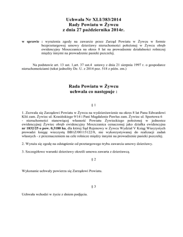 Uchwała Nr XLI/383/2014 Rady Powiatu w Żywcu z dnia 27 października 2014r. w sprawie : wyrażenia zgody na zawarcie przez Zarząd Powiatu w Żywcu w formie bezprzetargowej umowy dzierżawy nieruchomości położonej w Żywcu obręb ewidencyjny Moszczanica na okres 8 lat na prowadzenie działalności rolniczej między innymi na prowadzenie pasieki pszczelej. Na podstawie art. 13 ust. 1,art. 37 ust.4 ustawy z dnia 21 sierpnia 1997 r. o gospodarce nieruchomościami (tekst jednolity Dz. U. z 2014 poz. 518 z późn. zm.) Rada Powiatu w Żywcu uchwala co następuje : §1 1. Zezwala się Zarządowi Powiatu w Żywcu na wydzierżawienie na okres 8 lat Panu Edwardowi Kliś zam. Żywiec ul. Krasińskiego 9/14 i Pani Magdalenie Pawlus zam. Żywiec ul. Sportowa 6 - nieruchomości stanowiącej własność Powiatu Żywieckiego położonej w jednostce ewidencyjnej Żywiec obręb ewidencyjny Moszczanica oznaczonej jako działka ewidencyjna nr 1832/25 o pow. 0,3180 ha, dla której Sąd Rejonowy w Żywcu Wydział V Ksiąg Wieczystych prowadzi księgę wieczystą BB1Z/00115122/8, nie wykorzystywanej do realizacji zadań własnych - z przeznaczeniem na cele rolnicze między innymi na prowadzenie pasieki pszczelej. 2. Wyraża się zgodę na odstąpienie od przetargowego trybu zawarcia umowy dzierżawy. 3. Szczegółowe warunki dzierżawy określi umowa zawarta z dzierżawcą. §2 Wykonanie uchwały powierza się Zarządowi Powiatu. §3 Uchwała wchodzi w życie z dniem podjęcia.