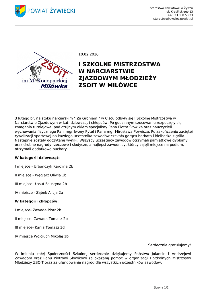 Starostwo Powiatowe w Żywcu ul. Krasińskiego 13 +48 33 860 50 23 [email protected] 10.02.2016 I SZKOLNE MISTRZOSTWA W NARCIARSTWIE ZJAZDOWYM MŁODZIEŻY ZSOIT W MILÓWCE 3 lutego br. na stoku narciarskim " Za Groniem " w Ciścu odbyły się I Szkolne Mistrzostwa w Narciarstwie Zjazdowym w kat. dziewcząt i chłopców. Po godzinnym szusowaniu rozpoczęły się zmagania turniejowe, pod czujnym okiem specjalisty Pana Piotra Słowika oraz nauczycieli wychowania fizycznego Pani mgr Iwony Pytel i Pana mgr Mirosława Porwisza. Po zakończeniu zaciętej rywalizacji sportowej na każdego uczestnika zawodów czekała gorąca herbata i kiełbaska z grilla. Następnie zostały odczytane wyniki. Wszyscy uczestnicy zawodów otrzymali pamiątkowe dyplomy oraz drobne nagrody rzeczowe i słodycze, a najlepsi zawodnicy, którzy zajęli miejsce na podium, otrzymali dodatkowo puchary. W kategorii dziewcząt: I miejsce - Urbańczyk Karolina 2b II miejsce - Węglarz Oliwia 1b III miejsce- Łasut Faustyna 2b IV miejsce - Ząbek Alicja 2a W kategorii chłopców: I miejsce- Zawada Piotr 2b II miejsce- Zawada Tomasz 2b III miejsce- Kania Tomasz 3d IV miejsce Wojciuch Mikołaj 1b Serdecznie gratulujemy! W imieniu całej Społeczności Szkolnej serdecznie dziękujemy Państwu Jolancie i Andrzejowi Zawadom oraz Panu Piotrowi Słowikowi za okazaną pomoc w organizacji I Szkolnych Mistrzostw Młodzieży ZSOiT oraz za ufundowanie nagród dla wszystkich uczestników zawodów. Strona 1/2 Starostwo Powiatowe w Żywcu ul. Krasińskiego 13 +48 33 860 50 23 [email protected] Informacja ZSOiT w Milówce Strona 2/2 Powered by TCPDF (www.tcpdf.org)