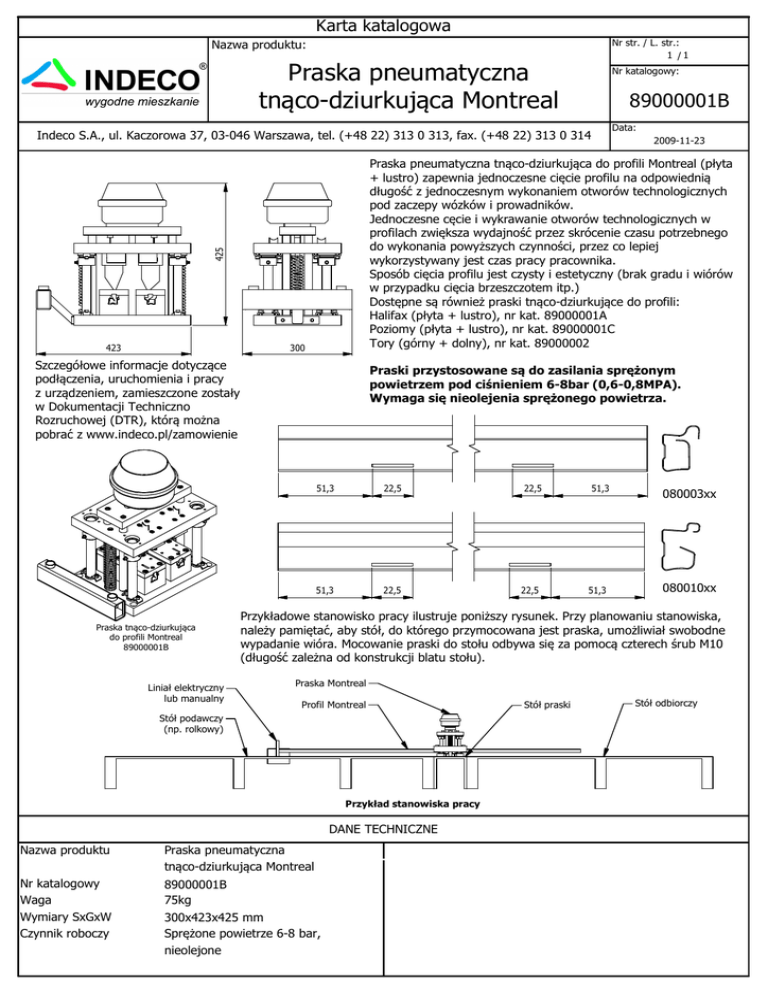 Karta katalogowa Nr str. / L. str.: 1 /1 Nazwa produktu: Praska pneumatyczna tnąco-dziurkująca Montreal Nr katalogowy: 89000001B Data: Indeco S.A., ul. Kaczorowa 37, 03-046 Warszawa, tel. (+48 22) 313 0 313, fax. (+48 22) 313 0 314 Praska pneumatyczna tnąco-dziurkująca do profili Montreal (płyta + lustro) zapewnia jednoczesne cięcie profilu na odpowiednią długość z jednoczesnym wykonaniem otworów technologicznych pod zaczepy wózków i prowadników. Jednoczesne cęcie i wykrawanie otworów technologicznych w profilach zwiększa wydajność przez skrócenie czasu potrzebnego do wykonania powyższych czynności, przez co lepiej wykorzystywany jest czas pracy pracownika. Sposób cięcia profilu jest czysty i estetyczny (brak gradu i wiórów w przypadku cięcia brzeszczotem itp.) Dostępne są również praski tnąco-dziurkujące do profili: Halifax (płyta + lustro), nr kat. 89000001A Poziomy (płyta + lustro), nr kat. 89000001C Tory (górny + dolny), nr kat. 89000002 425 423 300 Szczegółowe informacje dotyczące podłączenia, uruchomienia i pracy z urządzeniem, zamieszczone zostały w Dokumentacji Techniczno Rozruchowej (DTR), którą można pobrać z www.indeco.pl/zamowienie Praska tnąco-dziurkująca do profili Montreal 89000001B Liniał elektryczny lub manualny 2009-11-23 Praski przystosowane są do zasilania sprężonym powietrzem pod ciśnieniem 6-8bar (0,6-0,8MPA). Wymaga się nieolejenia sprężonego powietrza. 51,3 22,5 51,3 22,5 22,5 22,5 51,3 51,3 080003xx 080010xx Przykładowe stanowisko pracy ilustruje poniższy rysunek. Przy planowaniu stanowiska, należy pamiętać, aby stół, do którego przymocowana jest praska, umożliwiał swobodne wypadanie wióra. Mocowanie praski do stołu odbywa się za pomocą czterech śrub M10 (długość zależna od konstrukcji blatu stołu). Praska Montreal Profil Montreal Stół podawczy (np. rolkowy) Przykład stanowiska pracy DANE TECHNICZNE Nazwa produktu Praska pneumatyczna tnąco-dziurkująca Montreal Nr katalogowy Waga Wymiary SxGxW Czynnik roboczy 89000001B 75kg 300x423x425 mm Sprężone powietrze 6-8 bar, nieolejone Stół praski Stół odbiorczy
