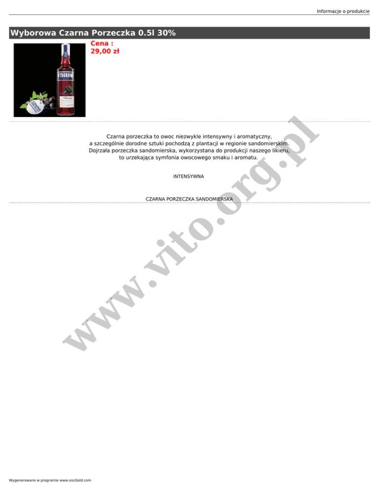 Informacje o produkcie Wyborowa Czarna Porzeczka 0.5l 30% Cena : 29,00 zł or g. pl Czarna porzeczka to owoc niezwykle intensywny i aromatyczny, a szczególnie dorodne sztuki pochodzą z plantacji w regionie sandomierskim. Dojrzała porzeczka sandomierska, wykorzystana do produkcji naszego likieru, to urzekająca symfonia owocowego smaku i aromatu. INTENSYWNA w w w .v it o. CZARNA PORZECZKA SANDOMIERSKA Wygenerowano w programie www.oscGold.com