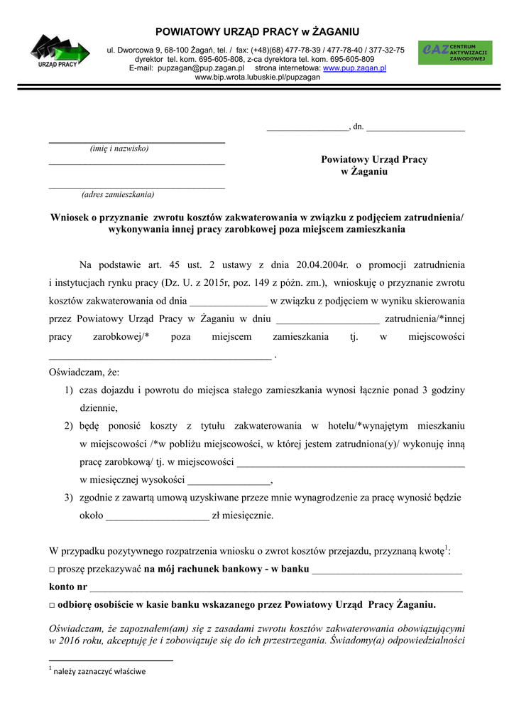 POWIATOWY URZĄD PRACY w ŻAGANIU ul. Dworcowa 9, 68-100 Żagań, tel. / fax: (+48)(68) 477-78-39 / 477-78-40 / 377-32-75 dyrektor tel. kom. 695-605-808, z-ca dyrektora tel. kom. 695-605-809 E-mail: [email protected] strona internetowa: www.pup.zagan.pl www.bip.wrota.lubuskie.pl/pupzagan ___________________, dn. ___________________ __________________________________ (imię i nazwisko) __________________________________ Powiatowy Urząd Pracy w Żaganiu __________________________________ (adres zamieszkania) Wniosek o przyznanie zwrotu kosztów zakwaterowania w związku z podjęciem zatrudnienia/ wykonywania innej pracy zarobkowej poza miejscem zamieszkania Na podstawie art. 45 ust. 2 ustawy z dnia 20.04.2004r. o promocji zatrudnienia i instytucjach rynku pracy (Dz. U. z 2015r, poz. 149 z póżn. zm.), wnioskuję o przyznanie zwrotu kosztów zakwaterowania od dnia _______________ w związku z podjęciem w wyniku skierowania przez Powiatowy Urząd Pracy w Żaganiu w dniu ____________________ zatrudnienia/*innej pracy zarobkowej/* poza miejscem zamieszkania tj. w miejscowości ___________________________________________ . Oświadczam, że: 1) czas dojazdu i powrotu do miejsca stałego zamieszkania wynosi łącznie ponad 3 godziny dziennie, 2) będę ponosić koszty z tytułu zakwaterowania w hotelu/*wynajętym mieszkaniu w miejscowości /*w pobliżu miejscowości, w której jestem zatrudniona(y)/ wykonuję inną pracę zarobkową/ tj. w miejscowości ____________________________________________ w miesięcznej wysokości ________________, 3) zgodnie z zawartą umową uzyskiwane przeze mnie wynagrodzenie za pracę wynosić będzie około ____________________ zł miesięcznie. W przypadku pozytywnego rozpatrzenia wniosku o zwrot kosztów przejazdu, przyznaną kwotę1: □ proszę przekazywać na mój rachunek bankowy - w banku _____________________________ konto nr ________________________________________________________________________ □ odbiorę osobiście w kasie banku wskazanego przez Powiatowy Urząd Pracy Żaganiu. Oświadczam, że zapoznałem(am) się z zasadami zwrotu kosztów zakwaterowania obowiązującymi w 2016 roku, akceptuję je i zobowiązuje się do ich przestrzegania. Świadomy(a) odpowiedzialności 1 należy zaznaczyć właściwe karnej wynikającej z art. 233 § 1 k.k. oświadczam, że dane zawarte w niniejszym oświadczeniu są zgodne z prawdą. W załączeniu przedkładam □ kserokopię dokumentu potwierdzającego podjęcie zatrudnienia lub wykonywania innej pracy zarobkowej. ____________________________ (data i podpis wnioskodawcy) ________________________________________________________________________________ ADNOTACJE POWIATOWEGO URZĘDU PRACY 1. Dane dotyczące wniosku Nr wniosku ______________________________ W niosek kompletny tak nie / Wniosek złożony w terminie tak nie Wezwano do uzupełnienia wniosku tak nie Termin na uzupełnienie wniosku ______________ Wniosek uzupełniono tak, w dniu _____________________ nie Podjęcie zatrudnienia nastąpiło w oparciu o skierowanie do pracodawcy tak nie Data wydania skierowania ________________ Podjęcie pracy od ___________________________ Nazwa pracodawcy _______________________________________________________________ 2. Dane dotyczące wysokości zwrotu Posiadany profil pomocy ___________________________________________________________ Okres zatrudnienia od__________do_________ Miejsce zatrudnienia _______________________ Miesięczna kwota zwrotu zgodna z zasadami zwrotu kosztów zakwaterowania ________________ Całkowita kwota zwrotu zgodna z zasadami zwrotu kosztów zakwaterowania _________________ Inne informacje ________________________________________________________________________________ ________________________________________________________________________________ _________________________________ (data i podpis doradcy klienta) 2. Informacja działu Finansowo - Księgowego o posiadaniu środków na zwrot kosztów zakwaterowania finansowanie ze środków ________________________________________________________ brak środków _________________________________ (data i podpis pracownika PUP) 3. Wniosek rozpatrzony: pozytywnie/ negatywnie* Uwagi:__________________________________________________________________________ ________________________________________________________________________________ ______________________________ (data i podpis Dyrektora PUP)