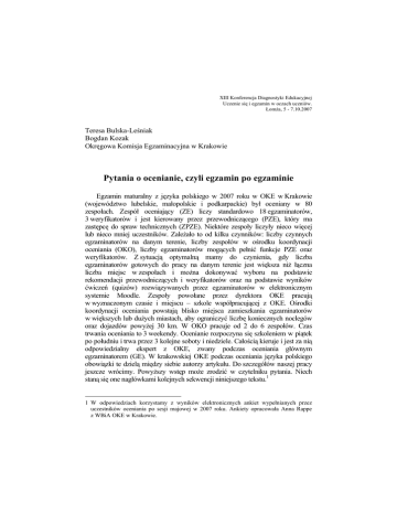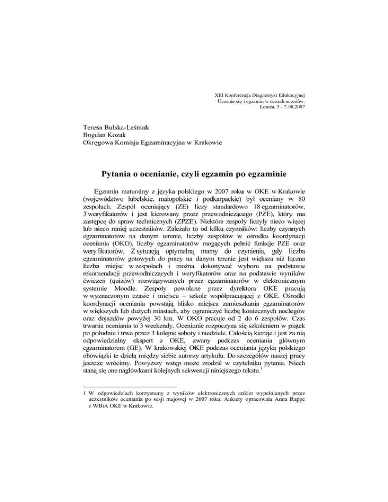 XIII Konferencja Diagnostyki Edukacyjnej Uczenie się i egzamin w oczach uczniów. Łomża, 5 - 7.10.2007 Teresa Bulska-Leśniak Bogdan Kozak Okręgowa Komisja Egzaminacyjna w Krakowie Pytania o ocenianie, czyli egzamin po egzaminie Egzamin maturalny z języka polskiego w 2007 roku w OKE w Krakowie (województwo lubelskie, małopolskie i podkarpackie) był oceniany w 80 zespołach. Zespół oceniający (ZE) liczy standardowo 18 egzaminatorów, 3 weryfikatorów i jest kierowany przez przewodniczącego (PZE), który ma zastępcę do spraw technicznych (ZPZE). Niektóre zespoły liczyły nieco więcej lub nieco mniej uczestników. Zależało to od kilku czynników: liczby czynnych egzaminatorów na danym terenie, liczby zespołów w ośrodku koordynacji oceniania (OKO), liczby egzaminatorów mogących pełnić funkcje PZE oraz weryfikatorów. Z sytuacją optymalną mamy do czynienia, gdy liczba egzaminatorów gotowych do pracy na danym terenie jest większa niż łączna liczba miejsc w zespołach i można dokonywać wyboru na podstawie rekomendacji przewodniczących i weryfikatorów oraz na podstawie wyników ćwiczeń (quizów) rozwiązywanych przez egzaminatorów w elektronicznym systemie Moodle. Zespoły powołane przez dyrektora OKE pracują w wyznaczonym czasie i miejscu – szkole współpracującej z OKE. Ośrodki koordynacji oceniania powstają blisko miejsca zamieszkania egzaminatorów w większych lub dużych miastach, aby ograniczyć liczbę koniecznych noclegów oraz dojazdów powyżej 30 km. W OKO pracuje od 2 do 6 zespołów. Czas trwania oceniania to 3 weekendy. Ocenianie rozpoczyna się szkoleniem w piątek po południu i trwa przez 3 kolejne soboty i niedziele. Całością kieruje i jest za nią odpowiedzialny ekspert z OKE, zwany podczas oceniania głównym egzaminatorem (GE). W krakowskiej OKE podczas oceniania języka polskiego obowiązki te dzielą między siebie autorzy artykułu. Do szczegółów naszej pracy jeszcze wrócimy. Powyższy wstęp może zrodzić w czytelniku pytania. Niech staną się one nagłówkami kolejnych sekwencji niniejszego tekstu.1 1 W odpowiedziach korzystamy z wyników elektronicznych ankiet wypełnianych przez uczestników oceniania po sesji majowej w 2007 roku. Ankiety opracowała Anna Rappe z WBiA OKE w Krakowie. Dlaczego nie powołuje się większej liczby zespołów, aby skrócić czas oceniania? Otóż dlatego, że im mniejsza liczba oceniających, tym większa porównywalność. Zatrudniliśmy do oceniania języka polskiego łącznie 1924 osoby! To dużo, nawet bardzo dużo. Poza tym trudno dwu osobom kierować pracą 80 zespołów, cóż mówić o większej liczbie. Wreszcie specyfika oceniania egzaminu z języka polskiego powoduje, że pierwszego dnia egzaminator ocenia niewiele arkuszy, ponieważ „uczy się” kryterialnego oceniania wypracowań na dwa różne tematy. Podczas kolejnych dni, kolejnych weekendów następuje przyspieszenie tempa pracy i można zakładać, że utrzymana jest porównywalna jej jakość oraz stwierdzić, że taki system jest raczej ekonomiczny. Jeszcze jednym argumentem może być elektroniczny system zawierania umów z oceniającymi. Każdy z egzaminatorów musi być zalogowany w systemie elektronicznym, PZE lub GE musi wpisać do sytemu zespoły, dyrektor OKE musi podpisać wszystkie wydrukowane z systemu umowy, aby egzaminatorzy otrzymali je przed rozpoczęciem pracy. Po zakończeniu oceniania PZE lub ZPZE drukuje rachunek, który podpisuje egzaminator, PZE, GE oraz dyrektor i księgowy. Wypłata następuje po zamknięciu tego procesu i zatwierdzeniu go w systemie. Taki sposób ewidencjonowania i rozliczania jest bardzo wygodny i przejrzysty dla OKE, jednak bywa uciążliwy dla nie zawsze obytych z komputerem nauczycieli. Doświadczamy tego jeszcze przez pewien czas po zakończeniu sesji, gdyż egzaminatorzy mylą się, podając dane osobowe, numery kont bankowych itd. Jak dokonuje się naboru egzaminatorów do zespołów? Egzamin maturalny w 2007 roku odbył się już po raz trzeci (nie licząc sesji poprawkowej w styczniu 2006 roku oraz matury w 2002 roku). Zatem, rekrutacja oceniających odbywała się przede wszystkim na podstawie rekomendacji przewodniczących zespołów oceniających. Przeważająca większość egzaminatorów oceniała już w 2005 i 2006 roku. Tylko 9% oceniało w tym roku po raz pierwszy. Dodatkową informacją o egzaminatorze są jego wyniki w systemie Moodle. Egzaminatorzy rozwiązują quizy, polegające na ocenie testów, wypracowań, różnych rozwiązań tego samego zadania testowego, nazywaniu błędów językowych itp. Ankietowani twierdzą, że taki system szkolenia pomaga w ocenianiu. Na pytanie, czy kursy w Moodlu pozwoliły przećwiczyć umiejętność stosowania kryteriów, 24% odpowiedziało – „zdecydowanie tak”, 38% „raczej tak”, 13% „trudno powiedzieć”, 4% „raczej nie”, 1% „zdecydowanie nie”, pozostali respondenci albo nie udzielili odpowiedzi na to pytanie, albo nie brali udziału w takim szkoleniu. Przeważająca większość (64%) biorących udział w szkoleniach w Moodle uważa, że podane podczas szkoleń internetowych uzasadnienia dotyczące konieczności zastosowania podanej punktacji były dla nich przekonujące. Przemawia to za potrzebą takich kursów jako uzupełnienia przygotowania egzaminatora do pracy. Wyniki quizów mogą stanowić jedno z kryteriów przy powoływaniu zespołów. Główny egzaminator dokonuje analizy pracy zespołów na podstawie losowego przeglądu ocenionych prac maturalnych. Daje to możliwość oceny pracy nie tylko egzaminatorów, ale i weryfikatorów oraz przewodniczących. Wnioski dotyczące zespołów, wyciągane wspólnie z przewodniczącymi, pozwalają unikać zatrudniania tych egzaminatorów, którzy się nie sprawdzili. Prawie 80% egzaminatorów uczy w szkołach ponadgimnazjalnych. Reszta to nauczyciele szkół niższego szczebla oraz, co prawda sporadycznie, pracownicy akademiccy i emerytowani 