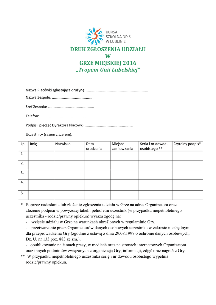 DRUK ZGŁOSZENIA UDZIAŁU W GRZE MIEJSKIEJ 2016 „Tropem Unii Lubelskiej” Nazwa Placówki zgłaszająca drużynę: …………………………………………………………. Nazwa Zespołu: ………………………………………. Szef Zespołu: ………………………………………….. Telefon: ………………………………………………. Podpis i pieczęć Dyrektora Placówki: ……………………………………………. Uczestnicy (razem z szefem): Lp. Imię Nazwisko Data urodzenia Miejsce zamieszkania Seria i nr dowodu osobistego ** Czytelny podpis* 1 2. 3. 4. 5. * Poprzez nadesłanie lub złożenie zgłoszenia udziału w Grze na adres Organizatora oraz złożenie podpisu w powyższej tabeli, pełnoletni uczestnik (w przypadku niepełnoletniego uczestnika - rodzic/prawny opiekun) wyraża zgodę na: - wzięcie udziału w Grze na warunkach określonych w regulaminie Gry, - przetwarzanie przez Organizatorów danych osobowych uczestnika w zakresie niezbędnym dla przeprowadzenia Gry (zgodnie z ustawą z dnia 29.08.1997 o ochronie danych osobowych, Dz. U. nr 133 poz. 883 ze zm.), - opublikowanie na łamach prasy, w mediach oraz na stronach internetowych Organizatora oraz innych podmiotów związanych z organizacją Gry, informacji, zdjęć oraz nagrań z Gry. ** W przypadku niepełnoletniego uczestnika serię i nr dowodu osobistego wypełnia rodzic/prawny opiekun. 1) OŚWIADCZENIA RODZICA/PRAWNEGO OPIEKUNA NIEPEŁNOLETNIEGO UCZESTNIKA GRY: Uczestnik 1: Przyjmuję odpowiedzialność za życie i zdrowie niepełnoletniego uczestnika (imię i nazwisko): ……………………………………………..……………………….… i zobowiązuję się do opieki nad nim podczas Gry Miejskiej 2016 „ Tropem Unii Lubelskiej” w dniu 19.05.2016 r. Czytelny podpis rodzica/prawnego opiekuna: Seria i nr dowodu osobistego: ……………………………………………… ………………………………………….. Uczestnik 2 Przyjmuję odpowiedzialność za życie i zdrowie niepełnoletniego uczestnika (imię i nazwisko): ……………………………………………..……………………….… i zobowiązuję się do opieki nad nim podczas Gry Miejskiej 2016 „ Tropem Unii Lubelskiej” w dniu 19.05.2016 r. Czytelny podpis rodzica/prawnego opiekuna: Seria i nr dowodu osobistego: ……………………………………………… ………………………………………….. Uczestnik 3 Przyjmuję odpowiedzialność za życie i zdrowie niepełnoletniego uczestnika (imię i nazwisko): ……………………………………………..……………………….… i zobowiązuję się do opieki nad nim podczas Gry Miejskiej 2016 „ Tropem Unii Lubelskiej” w dniu 19.05.2016 r. Czytelny podpis rodzica/prawnego opiekuna: Seria i nr dowodu osobistego: ……………………………………………… ………………………………………….. Uczestnik 4 Przyjmuję odpowiedzialność za życie i zdrowie niepełnoletniego uczestnika (imię i nazwisko): ……………………………………………..……………………….… i zobowiązuję się do opieki nad nim podczas Gry Miejskiej 2016 „ Tropem Unii Lubelskiej” w dniu 19.05.2016 r. Czytelny podpis rodzica/prawnego opiekuna: Seria i nr dowodu osobistego: ……………………………………………… ………………………………………….. Uczestnik 5 Przyjmuję odpowiedzialność za życie i zdrowie niepełnoletniego uczestnika (imię i nazwisko): ……………………………………………..……………………….… i zobowiązuję się do opieki nad nim podczas Gry Miejskiej 2016 „ Tropem Unii Lubelskiej” w dniu 19.05.2016 r. Czytelny podpis rodzica/prawnego opiekuna: Seria i nr dowodu osobistego: ……………………………………………… …………………………………………..
