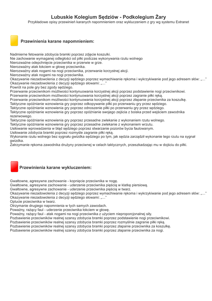 Lubuskie Kolegium Sędziów - Podkolegium Żary Przykładowe opisy przewinień karanych napomnieniem oraz wykluczeniem z gry wg systemu Extranet Przewinienia karane napomnieniem: Nadmierne fetowanie zdobycia bramki poprzez zdjęcie koszulki. Nie zachowanie wymaganej odległości od piłki podczas wykonywania rzutu wolnego Nierozważne odepchnięcie przeciwnika w przerwie w grze. Nierozważny atak łokciem w głowę przeciwnika. Nierozważny atak nogami na nogi przeciwnika, przerwanie korzystnej akcji. Nierozważny atak nogami na nogi przeciwnika. Okazywanie niezadowolenia z decyzji sędziego poprzez wymachiwanie rękoma i wykrzykiwanie pod jego adresem słów: „…” Okazywanie niezadowolenia z decyzji sędziego słowami: „…” Powrót na pole gry bez zgody sędziego. Przerwanie przeciwnikom możliwości kontynuowania korzystnej akcji poprzez podstawienie nogi przeciwnikowi. Przerwanie przeciwnikom możliwości kontynuowania korzystnej akcji poprzez zagranie piłki ręką. Przerwanie przeciwnikom możliwości kontynuowania korzystnej akcji poprzez złapanie przeciwnika za koszulkę. Taktyczne opóźnianie wznowienia gry poprzez odkopywanie piłki po przerwaniu gry przez sędziego. Taktyczne opóźnianie wznowienia gry poprzez odnoszenie piłki po przerwaniu gry przez sędziego. Taktyczne opóźnianie wznowienia gry poprzez opóźnianie swojego zejścia z boiska przed wejściem zawodnika rezerwowego. Taktyczne opóźnianie wznowienia gry poprzez przesadne zwlekanie z wykonaniem rzutu wolnego. Taktyczne opóźnianie wznowienia gry poprzez przesadne zwlekanie z wykonaniem wrzutu. Usiłowanie wprowadzenia w błąd sędziego poprzez stwarzanie pozorów bycia faulowanym. Usiłowanie zdobycia bramki poprzez rozmyśle zagranie piłki ręką. Wykonanie rzutu wolnego bez sygnału gwizdka sędziego po tym, jak sędzia zarządził wykonanie tego rzutu na sygnał gwizdka. Zatrzymanie rękoma zawodnika drużyny przeciwnej w celach taktycznych, przeszkadzając mu w dojściu do piłki. Przewinienia karane wykluczeniem: Gwałtowne, agresywne zachowanie - kopnięcie przeciwnika w nogę. Gwałtowne, agresywne zachowanie - uderzenie przeciwnika pięścią w klatkę piersiową. Gwałtowne, agresywne zachowanie - uderzenie przeciwnika pięścią w twarz. Okazywanie niezadowolenia z decyzji sędziego poprzez wymachiwanie rękoma i wykrzykiwanie pod jego adresem słów: „…” Okazywanie niezadowolenia z decyzji sędziego słowami: „…” Oplucie przeciwnika w twarz. Otrzymanie drugiego napomnienia w tych samych zawodach. Poważny, rażący faul - uderzenie przeciwnika łokciem w głowę. Poważny, rażący faul - atak nogami na nogi przeciwnika z użyciem nieproporcjonalnej siły. Pozbawienie przeciwników realnej szansy zdobycia bramki poprzez podstawienie nogi przeciwnikowi. Pozbawienie przeciwników realnej szansy zdobycia bramki poprzez rozmyślnie zagranie piłki ręką. Pozbawienie przeciwników realnej szansy zdobycia bramki poprzez złapanie przeciwnika za koszulkę. Pozbawienie przeciwników realnej szansy zdobycia bramki poprzez złapanie przeciwnika za nogi.