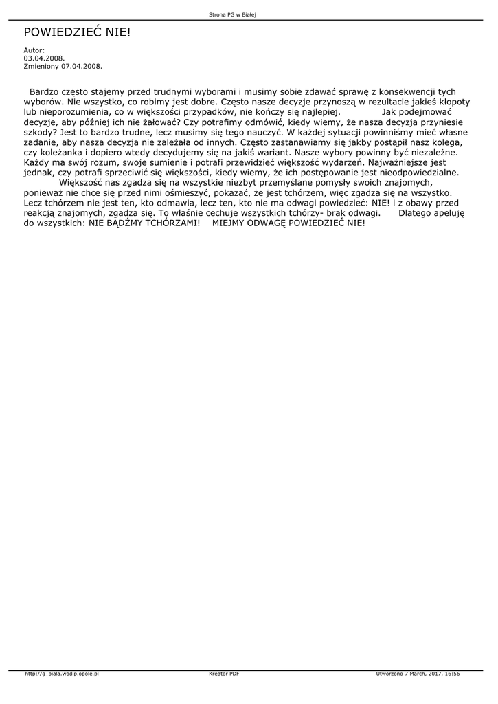 Strona PG w Białej POWIEDZIEĆ NIE! Autor: 03.04.2008. Zmieniony 07.04.2008. Bardzo często stajemy przed trudnymi wyborami i musimy sobie zdawać sprawę z konsekwencji tych wyborów. Nie wszystko, co robimy jest dobre. Często nasze decyzje przynoszą w rezultacie jakieś kłopoty lub nieporozumienia, co w większości przypadków, nie kończy się najlepiej. Jak podejmować decyzje, aby później ich nie żałować? Czy potrafimy odmówić, kiedy wiemy, że nasza decyzja przyniesie szkody? Jest to bardzo trudne, lecz musimy się tego nauczyć. W każdej sytuacji powinniśmy mieć własne zadanie, aby nasza decyzja nie zależała od innych. Często zastanawiamy się jakby postąpił nasz kolega, czy koleżanka i dopiero wtedy decydujemy się na jakiś wariant. Nasze wybory powinny być niezależne. Każdy ma swój rozum, swoje sumienie i potrafi przewidzieć większość wydarzeń. Najważniejsze jest jednak, czy potrafi sprzeciwić się większości, kiedy wiemy, że ich postępowanie jest nieodpowiedzialne. Większość nas zgadza się na wszystkie niezbyt przemyślane pomysły swoich znajomych, ponieważ nie chce się przed nimi ośmieszyć, pokazać, że jest tchórzem, więc zgadza się na wszystko. Lecz tchórzem nie jest ten, kto odmawia, lecz ten, kto nie ma odwagi powiedzieć: NIE! i z obawy przed reakcją znajomych, zgadza się. To właśnie cechuje wszystkich tchórzy- brak odwagi. Dlatego apeluję do wszystkich: NIE BĄDŹMY TCHÓRZAMI! MIEJMY ODWAGĘ POWIEDZIEĆ NIE! http://g_biala.wodip.opole.pl Kreator PDF Utworzono 7 March, 2017, 16:56