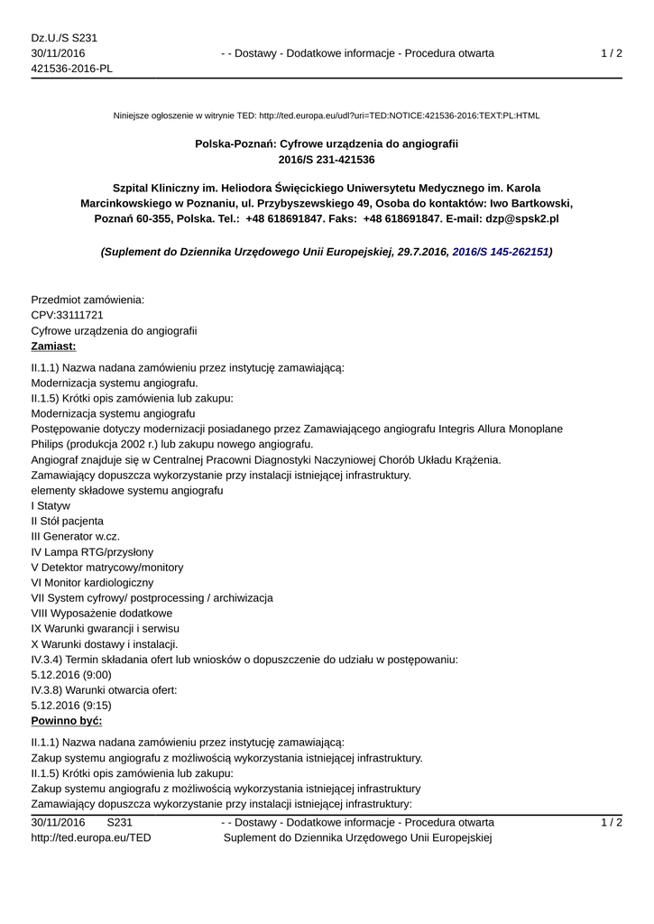 Dz.U./S S231 30/11/2016 421536-2016-PL - - Dostawy - Dodatkowe informacje - Procedura otwarta 1/2 Niniejsze ogłoszenie w witrynie TED: http://ted.europa.eu/udl?uri=TED:NOTICE:421536-2016:TEXT:PL:HTML Polska-Poznań: Cyfrowe urządzenia do angiografii 2016/S 231-421536 Szpital Kliniczny im. Heliodora Święcickiego Uniwersytetu Medycznego im. Karola Marcinkowskiego w Poznaniu, ul. Przybyszewskiego 49, Osoba do kontaktów: Iwo Bartkowski, Poznań 60-355, Polska. Tel.: +48 618691847. Faks: +48 618691847. E-mail: [email protected] (Suplement do Dziennika Urzędowego Unii Europejskiej, 29.7.2016, 2016/S 145-262151) Przedmiot zamówienia: CPV:33111721 Cyfrowe urządzenia do angiografii Zamiast: II.1.1) Nazwa nadana zamówieniu przez instytucję zamawiającą: Modernizacja systemu angiografu. II.1.5) Krótki opis zamówienia lub zakupu: Modernizacja systemu angiografu Postępowanie dotyczy modernizacji posiadanego przez Zamawiającego angiografu Integris Allura Monoplane Philips (produkcja 2002 r.) lub zakupu nowego angiografu. Angiograf znajduje się w Centralnej Pracowni Diagnostyki Naczyniowej Chorób Układu Krążenia. Zamawiający dopuszcza wykorzystanie przy instalacji istniejącej infrastruktury. elementy składowe systemu angiografu I Statyw II Stół pacjenta III Generator w.cz. IV Lampa RTG/przysłony V Detektor matrycowy/monitory VI Monitor kardiologiczny VII System cyfrowy/ postprocessing / archiwizacja VIII Wyposażenie dodatkowe IX Warunki gwarancji i serwisu X Warunki dostawy i instalacji. IV.3.4) Termin składania ofert lub wniosków o dopuszczenie do udziału w postępowaniu: 5.12.2016 (9:00) IV.3.8) Warunki otwarcia ofert: 5.12.2016 (9:15) Powinno być: II.1.1) Nazwa nadana zamówieniu przez instytucję zamawiającą: Zakup systemu angiografu z możliwością wykorzystania istniejącej infrastruktury. II.1.5) Krótki opis zamówienia lub zakupu: Zakup systemu angiografu z możliwością wykorzystania istniejącej infrastruktury Zamawiający dopuszcza wykorzystanie przy instalacji istniejącej infrastruktury: 30/11/2016 S231 http://ted.europa.eu/TED - - Dostawy - Dodatkowe informacje - Procedura otwarta Suplement do Dziennika Urzędowego Unii Europejskiej 1/2 Dz.U./S S231 30/11/2016 421536-2016-PL - - Dostawy - Dodatkowe informacje - Procedura otwarta 2/2 1. infrastruktura w postaci osłon ołowianych – szyba sterowni, drzwi pacjenta, drzwi lekarza, 2. infrastruktura w postaci kanałów kablowych (ich połączeń z pomieszczeniem sterowni oraz technicznym), 3. infrastruktura związana z systemem klimatyzacji wszystkich pomieszczeń pracowni, 4. infrastruktura w postaci stalowych konstrukcji nośnych – belek przytwierdzonych do stropu obiektu, na których zawieszone są poszczególne elementy systemu, 5. elementy konstrukcji łączące stół systemu z podłożem elementy składowe systemu angiografu I Statyw II Stół pacjenta III Generator w.cz. IV Lampa RTG/przysłony V Detektor matrycowy/monitory VI Monitor kardiologiczny VII System cyfrowy/ postprocessing VIIa System gromadzenia i przechowywania danych w pracowni (PACS) VIII Wyposażenie dodatkowe IX Warunki gwarancji i serwisu X Warunki dostawy i instalacji. IV.3.4) Termin składania ofert lub wniosków o dopuszczenie do udziału w postępowaniu: 20.12.2016 (9:00) IV.3.8) Warunki otwarcia ofert: 20.12.2016 (9:15) Inne dodatkowe informacje Informacje do poprawienia lub dodania w odpowiedniej dokumentacji przetargowej. Więcej informacji w odpowiedniej dokumentacji przetargowej. 30/11/2016 S231 http://ted.europa.eu/TED - - Dostawy - Dodatkowe informacje - Procedura otwarta Suplement do Dziennika Urzędowego Unii Europejskiej 2/2