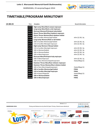 Lotto 5. Warszawski Memoriał Kamili Skolimowskiej WARSZAWA, 23 sierpnia/August 2014 TIMETABLE/PROGRAM MINUTOWY 14-08-23 Time 16:00 16:05 16:15 16:20 16:20 17:00 17:05 17:08 17:15 17:20 17:23 17:30 17:37 17:45 17:50 17:53 18:00 18:05 18:05 18:10 18:20 18:30 18:40 18:47 19:00 Discipline Round Information High Jump Men/Skok wzwyż mężczyzn Long Jump Men/Skok w dal mężczyzn Shot put Women/Pchnięcie kulą kobiet Discus Throw Men/Rzut dyskiem mężczyzn Discus Throw Women/Rzut dyskiem kobiet 100 m hurdles Women/ppł kobiet Long Jump Women/Skok w dal kobiet 100 m hurdles Women/ppł kobiet 110 m hurdles Men/ppł mężczyzn High Jump Women/ Wzwyż kobiet 110 m hurdles Men/ppł mężczyzn 100 m Women/kobiet 100 m Women/kobiet 100 m Men/mężczyzn Shot put Men/Pchnięcie kulą mężczyzn 100 m Men/mężczyzn 100 m Para Women/niepełnosprawni Hammer Throw Men/Rzut młotem mężczyzn Hammer Throw Women/Rzut młotem kobiet 100 m Para Men/niepełnosprawni 100 m hurdles Women/ppł kobiet 110 m hurdles Men/ppł mężczyzn 100 m boys/chłopców 100 m Women/kobiet 100 m Men/mężczyzn Strona 1 z 1 WARSZAWA 2014 Timing and Dataservice by DomTel Sport Timing Poland www.domtel.pl elim (1) 3Q 2q elim (2) 3Q 2q elim (1) 3Q 2q elim (2) 3Q elim (1) 3Q elim (2) 3Q elim (1) 3Q 2q 2q 2q 1q elim (2) 3Q 1q Heats/Biegi (1) Heats/Biegi (1) FINAL FINAL Heats/Biegi (1) FINAL FINAL 14-08-23 11:51:55