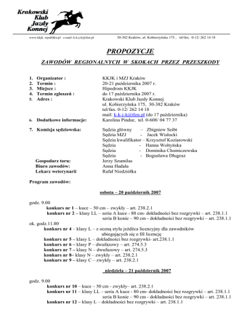 www.kkjk. republika.pl e-mail: [email protected] 30-382 Kraków, ul. Kobierzyńska 175 , tel/fax. 0-12/ 262 14 18 PROPOZYCJE ZAWODÓW REGIONALNYCH W SKOKACH PRZEZ PRZESZKODY 1. 2. 3. 4. Organizator : Termin : Miejsce : Termin zgłoszeń : 5. Adres : 6. Dodatkowe informacje: 7. Komisja sędziowska: Gospodarz toru: Biuro zawodów: Lekarz weterynarii KKJK i MZJ Kraków 20-21 października 2007 r. Hipodrom KKJK do 17 października 2007 r. Krakowski Klub Jazdy Konnej ul. Kobierzyńska 175, 30-382 Kraków tel/fax. 0-12/ 262 14 18 mail: [email protected] (do 17 października) Karolina Pindur, tel. 0-608/ 04 77 37 Sędzia główny – Zbigniew Seibt Sędzia MZJ - Jacek Wisłocki Sędzia kwalifikator – Krzysztof Koziarowski Sędzia - Hanna Woltyńska Sędzia - Dominika Chomiczewska Sędzia - Bogusława Długosz Jerzy Szumilas Anna Hadała Rafał Niedziółka Program zawodów: sobota – 20 październik 2007 godz. 9.00 konkurs nr 1 – kuce – 50 cm – zwykły – art. 238.2.1 konkurs nr 2 – klasy LL – seria A kuce - 80 cm- dokładności bez rozgrywki – art. 238.1.1 seria B konie – 90 cm - dokładności bez rozgrywki – art. 238.1.1 ok. godz.11.00 konkurs nr 4 – klasy L – z oceną stylu jeźdźca licencyjny dla zawodników ubiegających się o III licencję konkurs nr 5 – klasy L – dokładności bez rozgrywki- art.238.1.1 konkurs nr 6 – klasy P – dwufazowy – art. 274.5.3 konkurs nr 7 – klasy N – dwufazowy – art. 274.5.3 konkurs nr 8– klasy N – zwykły – art. 238.2.1 konkurs nr 9 – klasy C – zwykły – art. 238.2.1 niedziela – 21 październik 2007 godz. 9.00 konkurs nr 10 – kuce – 50 cm - zwykły– art. 238.2.1 konkurs nr 11 – klasy LL – seria A kuce - 80 cm- dokładności bez rozgrywki – art. 238.1.1 seria B konie – 90 cm - dokładności bez rozgrywki – art. 238.1.1 konkurs nr 12 – klasy L – dokładności bez rozgrywki – art. 238.1.1 konkurs nr 13 – klasy P - zwykły – art. 238.2.1 konkurs nr 14 – klasy N – zwykły – art. 238.2.1 konkurs nr 15 – klasy N – dwufazowy – art. 274.5.3 konkurs nr 16 – klasy C – dwufazowy – art. 274.5.3 8. Uwagi : Warunki techniczne : - parcours - podłoże piaskowe o wymiarach 80 x 100 - rozprężalnia – podłoże piaskowe o wymiarach 40 x 80 Sprawy organizacyjne: 1. Ostateczny termin zapisów do sobotnich konkursów– 19 października 2007r.(piątek) w godz. 18.30-20.00 w biurze zawodów; 2. Dokumenty jeźdźców i koni zgodnie z regulaminem i przepisami PZJ, MZJ i weterynaryjnymi; Od 1 lipca 2007 zawodnik musi posiadać „plastykową” licencję. Straciły moc stare, „papierowe” druki licencyjne. Uwaga!! Koń, aby startować w zawodach regionalnych musi mieć opłaconą roczną opłatę rejestracyjną wg cennika swojego WZJ. Licencja roczna szczebla centralnego konia nie upoważnia do startu w zawodach regionalnych. Kuce muszą posiadać aktualny certyfikat wzrostu 3. Opłaty za udział w zawodach : - organizacyjna: 30 zł od konia dziennie /50 zł za zawody - boks w stajniach : 50 zł od konia dziennie/100 zł za zawody (liczy się rozpoczęta doba) Stajnie przygotowane od dnia 19 października 2007, godz. 14.00 –istnieje możliwość przywiezienia koni wcześniej (po wcześniejszym ustaleniu z organizatorem) lub pozostawienia po zawodach na terenie klubu-opłata 30 zł / dobę - Uwaga- ilość boksów ograniczona – (decyduje kolejność zgłoszeń) - stanowisko – 20 zł od konia dziennie - Uwaga!!! w przypadku zabierania konia na noc z terenu zawodów wysokość opłat za boks lub stanowisko nie podlega zmianie - przyłączenie koniowozu do prądu – 50 zł za okres zawodów. Na zgłoszeniu proszę zaznaczyć, że będziecie Państwo korzystać z przyłącza prądu. 4. Konie zgłoszone po ustalonym terminie mogą być przyjęte przez organizatorów w miarę wolnych miejsc. 5. Reklamacje: - wyłącznie na piśmie z dołączeniem kaucji 200 zł 6. Każda zmiana na liście startowej po jej wydrukowaniu za zgodą Sędziego Głównego po wniesieniu opłaty 10 zł ( nie dotyczy skreśleń z listy) 7. Organizator zapewnia pierwszą ściółkę. Na terenie klubu istnieje możliwość nabycia słomy – 1 kostka - 7 zł, siana – 1 kostka - 10 zł (do godziny 14.00 lub po godzinie 20.00) 8. Wstęp do stajni: szefowie ekip, trenerzy, zawodnicy, luzacy, właściciele koni 9. Przegląd weterynaryjny w stajniach na życzenie lekarza weterynarii 10. Organizator zastrzega sobie prawo ograniczenia ilości koni w przypadku nadmiernej liczby zgłoszeń 11. Na prośbę trenerów lub szefów ekip konkursy klasy L- C mogą być rozegrane w dwóch seriach: kuce i duże konie. Prośba o rozegranie serii kuców musi być zgłoszona najpóźniej podczas składania zapisów do konkursów. Kuc, aby wystartować w konkursie/serii dla kuców musi posiadać certyfikat wzrostu zgodnie z przepisami PZJ. 12. Organizator nie ponosi żadnej odpowiedzialności w razie wypadków i zachorowań zawodników, luzaków i koni, jak również w przypadku kradzieży, zniszczeń, pożarów i innych zdarzeń losowych 13. Organizator zastrzega sobie prawo zmiany programu zawodów 2 14. 15. - Wyżywienie w Barze Jeździeckim STARE KONIE na terenie KKJK we własnym zakresie Rezerwacja miejsc noclegowych we własnym zakresie - adresy polecanych hoteli : START , ul. Kapelanka 60, tel. 0-12/ 269 22 10 PANORAMA, ul. Lipińskiego 3, tel. 0-12/ 260 64 01 16. Sprawy weterynaryjne Szczepienia ochronne przeciwko grypie koni. Obowiązuje następujący schemat szczepień: a. szczepienie podstawowe: • pierwsze szczepienie – w dniu rozpoczęcia szczepień • drugie szczepienie – nie wcześniej niż 21-go dnia i nie później niż 92 dnia od pierwszego szczepienia. b. szczepienie przypominające: • co 6 miesięcy od ostatniego szczepienia (jest dopuszczalny 21 dniowy okres karencji); • żadne szczepienie przypominające nie może się odbyć później niż na 7 dni przed przybyciem na zawody. Polski Związek Jeźd