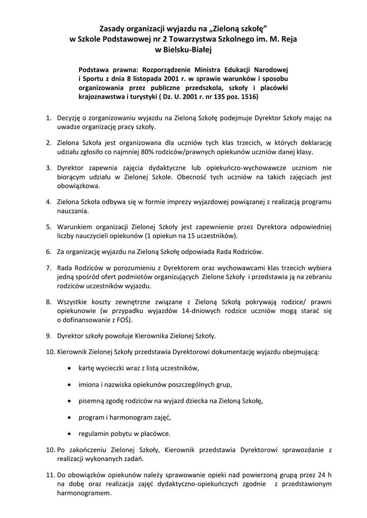 Zasady organizacji wyjazdu na „Zieloną szkołę” w Szkole Podstawowej nr 2 Towarzystwa Szkolnego im. M. Reja w Bielsku-Białej Podstawa prawna: Rozporządzenie Ministra Edukacji Narodowej i Sportu z dnia 8 listopada 2001 r. w sprawie warunków i sposobu organizowania przez publiczne przedszkola, szkoły i placówki krajoznawstwa i turystyki ( Dz. U. 2001 r. nr 135 poz. 1516) 1. Decyzję o zorganizowaniu wyjazdu na Zieloną Szkołę podejmuje Dyrektor Szkoły mając na uwadze organizację pracy szkoły. 2. Zielona Szkoła jest organizowana dla uczniów tych klas trzecich, w których deklarację udziału zgłosiło co najmniej 80% rodziców/prawnych opiekunów uczniów danej klasy. 3. Dyrektor zapewnia zajęcia dydaktyczne lub opiekuńczo-wychowawcze uczniom nie biorącym udziału w Zielonej Szkole. Obecność tych uczniów na takich zajęciach jest obowiązkowa. 4. Zielona Szkoła odbywa się w formie imprezy wyjazdowej powiązanej z realizacją programu nauczania. 5. Warunkiem organizacji Zielonej Szkoły jest zapewnienie przez Dyrektora odpowiedniej liczby nauczycieli opiekunów (1 opiekun na 15 uczestników). 6. Za organizację wyjazdu na Zieloną Szkołę odpowiada Rada Rodziców. 7. Rada Rodziców w porozumieniu z Dyrektorem oraz wychowawcami klas trzecich wybiera jedną spośród ofert podmiotów organizujących Zielone Szkoły i przedstawia ją na zebraniu rodziców uczestników wyjazdu. 8. Wszystkie koszty zewnętrzne związane z Zieloną Szkołą pokrywają rodzice/ prawni opiekunowie (w przypadku wyjazdów 14-dniowych rodzice uczniów mogą starać się o dofinansowanie z FOŚ). 9. Dyrektor szkoły powołuje Kierownika Zielonej Szkoły. 10. Kierownik Zielonej Szkoły przedstawia Dyrektorowi dokumentację wyjazdu obejmującą: kartę wycieczki wraz z listą uczestników, imiona i nazwiska opiekunów poszczególnych grup, pisemną zgodę rodziców na wyjazd dziecka na Zieloną Szkołę, program i harmonogram zajęć, regulamin pobytu w placówce. 10. Po zakończeniu Zielonej Szkoły, Kierownik przedstawia Dyrektorowi sprawozdanie z realizacji wykonanych zadań. 11. Do obowiązków opiekunów należy sprawowanie opieki nad powierzoną grupą przez 24 h na dobę oraz realizacja zajęć dydaktyczno-opiekuńczych zgodnie z przedstawionym harmonogramem. 12. Nauczyciele prowadzący zajęcia dydaktyczno-opiekuńcze zobowiązani są do prowadzenia dokumentacji przebiegu zajęć. 13. Opiekunowie nie ponoszą odpowiedzialności materialnej za wartościowe przedmioty, które nie są koniecznym wyposażeniem uczestnika Zielonej Szkoły (np. telefony, aparaty fotograficzne, sprzęt grający). 14. Za szkody materialne wyrządzone rodzice/opiekunowie prawni. przez dziecko, odpowiedzialność ponoszą 15. Do w/w postanowień stosuje się odpowiednio zapisy Regulaminu Wycieczki Szkolnej Szkoły Podstawowej nr 2 Towarzystwa Szkolnego im. M. Reja w Bielsku-Białej tekst jednolity na dzień 06.10.2014 r.