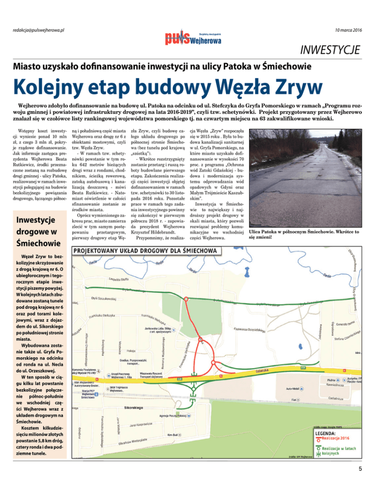 [email protected] 10 marca 2016 INWESTYCJE Miasto uzyskało dofinansowanie inwestycji na ulicy Patoka w Śmiechowie Kolejny etap budowy Węzła Zryw Wejherowo zdobyło dofinansowanie na budowę ul. Patoka na odcinku od ul. Stefczyka do Gryfa Pomorskiego w ramach „Programu rozwoju gminnej i powiatowej infrastruktury drogowej na lata 2016-2019”, czyli tzw. schetynówki. Projekt przygotowany przez Wejherowo znalazł się w czołówce listy rankingowej województwa pomorskiego tj. na czwartym miejscu na 63 zakwalifikowane wnioski. Wstępny koszt inwestycji wyniesie ponad 10 mln zł, z czego 3 mln zł, pokryje rządowe dofinansowanie. Jak informuje zastępca prezydenta Wejherowa Beata Rutkiewicz, środki przeznaczone zostaną na rozbudowę drogi gminnej - ulicy Patoka, realizowanej w ramach inwestycji polegającej na budowie bezkolizyjnego powiązania drogowego, łączącego północ- Inwestycje drogowe w Śmiechowie ną i południową część miasta Wejherowa oraz drogę nr 6 z obiektami mostowymi, czyli tzw. Węzła Zryw. - W ramach tzw. schetynówki powstanie w tym roku 642 metrów bieżących drogi wraz z rondami, chodnikiem, ścieżką rowerową, zatoką autobusową i kanalizacją deszczową - mówi Beata Rutkiewicz. - Natomiast oświetlenie w całości sfinansowanie zostanie ze środków miasta. Oprócz wymienionego zakresu prac, miasto zamierza zlecić w tym samym postępowaniu przetargowym, pierwszy drogowy etap Wę- zła Zryw, czyli budowę całego układu drogowego po północnej stronie Śmiechowa (bez tunelu pod krajową „szóstką”). - Wkrótce rozstrzygnięty zostanie przetarg i ruszą roboty budowlane pierwszego etapu. Zakończenia realizacji części inwestycji objętej dofinansowaniem w ramach tzw. schetynówki to 30 listopada 2016 roku. Pozostałe prace w ramach tego zadania inwestycyjnego powinny się zakończyć w pierwszym półroczu 2018 r. - zapowiada prezydent Wejherowa Krzysztof Hildebrandt. Przypomnimy, że realiza- cja Węzła „Zryw” rozpoczęła się w 2015 roku . Była to budowa kanalizacji sanitarnej w ul. Gryfa Pomorskiego, na które miasto uzyskało dofinansowanie w wysokości 70 proc. z programu „Ochrona wód Zatoki Gdańskiej - budowa i modernizacja systemu odprowadzania wód opadowych w Gdyni oraz Małym Trójmieście Kaszubskim”. Inwestycja w Śmiechowie to największy i najdroższy projekt drogowy w skali miasta, który pozwoli rozwiązać problemy komunikacyjne we wschodniej części Wejherowa. Ulica Patoka w północnym Śmiechowie. Wkrótce to się zmieni! Węzeł Zryw to bezkolizyjne skrzyżowanie z drogą krajową nr 6. O ubiegłorocznym i tegorocznym etapie inwestycji piszemy powyżej. W kolejnych latach zbudowane zostaną tunele pod drogą krajową nr 6 oraz pod torami kolejowymi, wraz z dojazdem do ul. Sikorskiego po południowej stronie miasta. Wybudowana zostanie także ul. Gryfa Pomorskiego na odcinku od ronda na ul. Necla do ul. Orzeszkowej. W ten sposób w ciągu kilku lat powstanie bezkolizyjne połączenie północ-południe we wschodniej części Wejherowa wraz z układem drogowym na Śmiechowie. Kosztem kilkudziesięciu milionów złotych powstanie 5,8 km dróg, cztery ronda i dwa podziemne tunele. 5