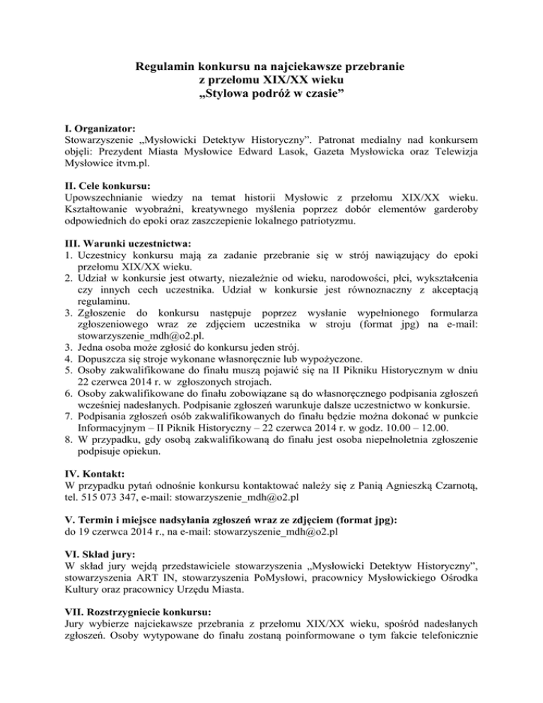 Regulamin konkursu na najciekawsze przebranie z przełomu XIX/XX wieku „Stylowa podróż w czasie” I. Organizator: Stowarzyszenie „Mysłowicki Detektyw Historyczny”. Patronat medialny nad konkursem objęli: Prezydent Miasta Mysłowice Edward Lasok, Gazeta Mysłowicka oraz Telewizja Mysłowice itvm.pl. II. Cele konkursu: Upowszechnianie wiedzy na temat historii Mysłowic z przełomu XIX/XX wieku. Kształtowanie wyobraźni, kreatywnego myślenia poprzez dobór elementów garderoby odpowiednich do epoki oraz zaszczepienie lokalnego patriotyzmu. III. Warunki uczestnictwa: 1. Uczestnicy konkursu mają za zadanie przebranie się w strój nawiązujący do epoki przełomu XIX/XX wieku. 2. Udział w konkursie jest otwarty, niezależnie od wieku, narodowości, płci, wykształcenia czy innych cech uczestnika. Udział w konkursie jest równoznaczny z akceptacją regulaminu. 3. Zgłoszenie do konkursu następuje poprzez wysłanie wypełnionego formularza zgłoszeniowego wraz ze zdjęciem uczestnika w stroju (format jpg) na e-mail: [email protected]. 3. Jedna osoba może zgłosić do konkursu jeden strój. 4. Dopuszcza się stroje wykonane własnoręcznie lub wypożyczone. 5. Osoby zakwalifikowane do finału muszą pojawić się na II Pikniku Historycznym w dniu 22 czerwca 2014 r. w zgłoszonych strojach. 6. Osoby zakwalifikowane do finału zobowiązane są do własnoręcznego podpisania zgłoszeń wcześniej nadesłanych. Podpisanie zgłoszeń warunkuje dalsze uczestnictwo w konkursie. 7. Podpisania zgłoszeń osób zakwalifikowanych do finału będzie można dokonać w punkcie Informacyjnym – II Piknik Historyczny – 22 czerwca 2014 r. w godz. 10.00 – 12.00. 8. W przypadku, gdy osobą zakwalifikowaną do finału jest osoba niepełnoletnia zgłoszenie podpisuje opiekun. IV. Kontakt: W przypadku pytań odnośnie konkursu kontaktować należy się z Panią Agnieszką Czarnotą, tel. 515 073 347, e-mail: [email protected] V. Termin i miejsce nadsyłania zgłoszeń wraz ze zdjęciem (format jpg): do 19 czerwca 2014 r., na e-mail: [email protected] VI. Skład jury: W skład jury wejdą przedstawiciele stowarzyszenia „Mysłowicki Detektyw Historyczny”, stowarzyszenia ART IN, stowarzyszenia PoMysłowi, pracownicy Mysłowickiego Ośrodka Kultury oraz pracownicy Urzędu Miasta. VII. Rozstrzygniecie konkursu: Jury wybierze najciekawsze przebrania z przełomu XIX/XX wieku, spośród nadesłanych zgłoszeń. Osoby wytypowane do finału zostaną poinformowane o tym fakcie telefonicznie lub mailowo. Podczas trwania II Pikniku Historycznego w Mysłowicach w Parku Zamkowym w dniu 22 czerwca 2014 r. finaliści zaprezentują swoje stroje. Spośród nich Jury wybierze 2 najciekawsze stroje. Może zostać przyznana nagroda publiczności. Jury dopuszcza możliwość przyznania innych dodatkowych nagród. Dopuszcza się inną formę rozstrzygnięcia konkursu w zależności od ilości zgłoszonych strojów. VII. Ogłoszenie wyników konkursu: Ogłoszenie wyniku konkursu oraz wręczenie nagród odbędzie się w dniu 22 czerwca 2014 r. podczas trwania II Pikniku Historycznego. VIII. Uwagi dodatkowe: 1. Stroje niezgodne z regulaminem nie będą brane pod uwagę. 2. Rozstrzygnięcie jury jest ostateczne (od werdyktu nie przysługuje odwołanie). 3. Wszelkie sprawy nie uwzględnione w regulaminie rozstrzyga Organizator.