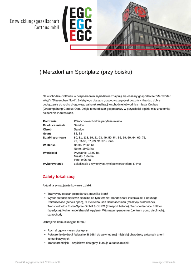 ( Merzdorf am Sportplatz (przy boisku) Na wschodzie Cottbusu w bezpośrednim sąsiedztwie znajdują się obszary gospodarcze "Merzdorfer Weg" i "Dissenchen Nord". Zaletą tego obszaru gospodarczego jest bocznica i bardzo dobre podłączenie do ruchu drogowego wskutek realizacji wschodniej obwodnicy miasta Cottbus (Ortsumgehung Cottbus-Ost). Dzięki temu obszar gospodarczy w przyszłości będzie miał znakomite połączenie z autostradą. Położenie Dzielnica miasta Obręb Grunt Działki gruntowe Wielkość Właściciel Wykorzystanie Północno-wschodnie peryferie miasta Sandow Sandow 82, 83 80, 81, 113, 19, 21-23, 49, 50, 54, 56, 59, 60, 64, 69, 75, 79, 83-86, 87, 89, 91-97 -i inneBrutto: 20,63 ha Netto: 19,03 ha Prywatnie: 18,92 ha Miasto: 1,64 ha Inne: 0,06 ha Lokalizacja z wykorzystanymi powierzchniami (75%) Zalety lokalizacji Aktualna sytuacja/użytkowanie działki: • Tradycyjny obszar gospodarczy, mozaika branż • Wybór przedsiębiorstw z siedzibą na tym terenie: Handelshof Finsterwalde, PneuhageReifenservice (serwis opon), C. Beutelhausen Baumaschinen (maszyny budowlane), Transportbeton Elster-Spree GmbH & Co KG (transport betonu), Transportservice Büttner (spedycja), Kohlehandel (handel węglem), Wärmepumpencenter (centrum pomp cieplnych), samochody Uzbrojenie komunikacyjne terenu: • Ruch drogowy - teren dostępny • Połączenie do drogi federalnej B 168 i do wewnętrznej miejskiej obwodnicy głównych arterii • komunikacyjnych Transport miejski - częściowo dostępny, kursuje autobus miejski Entwicklungsgesellschaft Cottbus mbH www.egc-cottbus.de Uzbrojenie w miejskie sieci techniczne: • Uzbrojony (woda pitna, ścieki, gaz, energia elektryczna, łączność) Środki promocji: • Tak Zarejestrowana wartość gleby/gruntu: • 25 €/m² (2011) Przydatność terenu: • Obróbka i przetwórstwo metalu / mechatronika, logistyka, gospodarka żywnościowa, technika transportu szynowego Sytuacja prawna planowania Plan użytkowania powierzchni: • Powierzchnia budowlana gospodarcza Prawo planowania: • według § 33 (1) niemieckiego kodeksu budowlanego (BauGB) Cele rozwoju miasta • Na podstawie koncepcji rozwoju powierzchni gospodarczych (GEK stan: 9/2007) • Kategoria docelowa: Obszar rewitalizacji • Powierzchnia korzysta z priorytetu rozwoju, kontynuacja reorganizacji budowlanej EGC Entwicklungsgesellschaft Cottbus mbH Am Turm 14, D-03046 Cottbus www.egc-cottbus.de Telefon: +49 (0)355 729913-0 Fax: +49 (0)355 729913-15 [email protected]