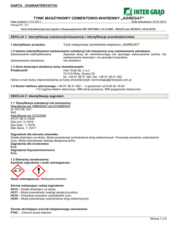 KARTA CHARAKTERYSTYKI TYNK MASZYNOWY CEMENTOWO-WAPIENNY „AGREGAT” Data wydania 17.01.2011 Wersja PL: 2.0 Data aktualizacji: 23.07.2013 Karta Charakterystyki jest zgodna z Rozporządzeniem WE 1907/2006 z 18.12.2006 – REACH oraz 453/2010 z 20.05.2010r. SEKCJA 1: Identyfikacja substancji/mieszaniny i identyfikacja przedsiębiorstwa 1 Identyfikator produktu: Tynk maszynowy cementowo-wapienny „AGREGAT” 1.2 Istotne zidentyfikowane zastosowania substancji lub mieszaniny oraz zastosowania odradzane: Zastosowanie zidentyfikowane: Zaprawa słuŜy do mechanicznego lub ręcznego wykonywania tynków. Do zastosowania wewnątrz i na zewnątrz budynków. Zastosowanie odradzane: nie określono 1.3 Dane dotyczące dostawcy karty charakterystyki: Producent: Inter Grąd Sp. z o.o. 72-310 Płoty, Sowno 52 tel. +48 91 38 51 362, fax. +48 91 38 51 362 Adres e-mail osoby odpowiedzialnej za kartę charakterystyki: [email protected] 1.4 Numer telefonu alarmowego: +48 91 38 51 362 – w godzinach od 8.00 do 16.00 112 (ogólny telefon alarmowy), 998 (straŜ poŜarna), 999 (pogotowie medyczne); SEKCJA 2: Identyfikacja zagroŜeń 1.1 Klasyfikacja substancji lub mieszaniny Klasyfikacja wg 1999/45/EC lub 67/548/EWG Xi: R37/38, R41 R43 Klasyfikacja wg 1272/2008 STOT SE 3; H335 Skin Irrit. 2; H315 Eye Dam. 1; H318 Skin Sens. 1; H317 ZagroŜenie dla zdrowia człowieka Działa draŜniąco na skórę. MoŜe powodować podraŜnienie dróg oddechowych. Powoduje powaŜne uszkodzenie oczu. MoŜe powodować reakcję alergiczną skóry. ZagroŜenie dla środowiska Brak ZagroŜenia fizyczne/chemiczne Brak. 1.2 Elementy oznakowania: Symbole zagroŜenia i znaki ostrzegawcze: Hasło ostrzegawcze: Niebezpieczeństwo Zwroty wskazujące rodzaj zagroŜenia: H315 – Działa draŜniąco na skórę. H317 – MoŜe powodować reakcję alergiczną skóry. H318 – Powoduje powaŜne uszkodzenie oczu H335 – MoŜe powodować podraŜnienie dróg oddechowych. Zwroty określające warunki bezpiecznego stosowania: P102 – Chronić przed dziećmi. Strona 1 z 9 KARTA CHARAKTERYSTYKI TYNK MASZYNOWY CEMENTOWO-WAPIENNY „AGREGAT” Data wydania 17.01.2011 Wersja PL: 2.0 Data aktualizacji: 23.07.2013 Karta Charakterystyki jest zgodna z Rozporządzeniem WE 1907/2006 z 18.12.2006 – REACH oraz 453/2010 z 20.05.2010r. P280 – Stosować rękawice ochronne/ odzieŜ ochronną/ ochronę oczu /ochronę twarzy. P305 + P351 + P338 – W PRZYPADKU DOSTANIA SIĘ DO OCZU: OstroŜnie płukać wodą przez kilka minut. Wyjąć soczewki kontaktowe, jeŜeli są i moŜna je łatwo usunąć. Nadal płukać. P302 + P352 - W PRZYPADKU KONTAKTU ZE SKÓRĄ: Umyć duŜą ilością wody z mydłem. P304 + P340 – W PRZYPADKU DOSTANIA SIĘ DO DRÓG ODDECHOWYCH: wyprowadzić lub wynieść poszkodowanego na świeŜe powietrze i zapewnić warunki do odpoczynku w pozycji umoŜliwiającej swobodne oddychanie P312 - W przypadku złego samopoczucia skontaktować się z OŚRODKIEM ZATRUĆ lub z lekarzem Składniki niebezpieczne: Klinkier cementu portlandzkiego [CAS: 65997-15-1], Wodorotlenek wapnia [CAS: 1305-620]. Inne informacje: Produkt przed uŜyciem jest rozrabiany z wodą i w takiej postaci jest stosowany 1.3 Inne zagroŜenia: Brak innych zagroŜeń. Brak informacji na temat spełnienia kryteriów PBT lub vPvB zgodnie z załącznikiem XIII rozporządzenia REACH. Odpowiednie badania nie były przeprowadzone. SEKCJA 3: Skład/informacja o składnikach 3.1 Substancja: Nie dotyczy. 3.2 Mieszanina: Niebezpieczne składniki: Identyfikator produktu Klinkier cementu portlandzkiego CAS: 65997-15-1 WE: 266-043-4 Nr indeksowy:Nr REACH: substancja podlega przepisom okresu przejściowego Zawartość % <17 Wodorotlenek wapnia CAS: 1305-62-0 WE: 215-137-3 Nr indeksowy:-Nr REACH: substancja podlega przepisom okresu przejściowego <10 Mrówczan wapnia bezwodny CAS: 1305-62-0 WE: 215-137-3 Nr indeksowy: Nr REACH: substancja podlega przepisom okresu przejściowego <0,5 Klasyfikacja wg 67/548/EWG Klasyfikacja CLP Kody zwrotów Klasa zagroŜenia i wskazujących kody kategorii rodzaj zagroŜenia Xi: R41,R37/38 Eye Dam. 1 STOT SE 3 Skin Irrit. 2 Skin Sens. 1 H318 H335 H315 H317 Xi: R41,R37/38 Eye Dam. 1 STOT SE 3 Skin Irrit. 2 H318 H335 H315 Eye Irrit. 2 STOT SE 3 H319 H335 R43 Xi; R36/37 Pełna treść zwrotów R i H w sekcji 16 Pozostałe składniki: Piasek kwarcowy (CAS: 14808-60-7) >70% z ustaloną wartością NDS dla pyłów krzemionki Strona 2 z 9 KARTA CHARAKTERYSTYKI TYNK MASZYNOWY CEMENTOWO-WAPIENNY „AGREGAT” Data wydania 17.01.2011 Wersja PL: 2.0 Data aktualizacji: 23.07.2013 Karta Charakterystyki jest zgodna z Rozporządzeniem WE 1907/2006 z 18.12.2006 – REACH oraz 453/2010 z 20.05.2010r. SEKCJA 4: Środki pierwszej pomocy 4.1 Opis środków pierwszej pomocy W przypadku kontaktu ze skórą: Zdjąć zanieczyszczoną odzieŜ, umyć zabrudzoną skórę wodą z mydłem, spłukać dokładnie wodą, w przypadku pojawienia się podraŜnienia, skontaktować się z lekarzem. W przypadku kontaktu z oczami: Przepłukać oczy przez kilkanaście minut (ok. 15) duŜą ilością wody, trzymając powieki szeroko rozwarte. Unikać silnego strumienia, ze względu na niebezpieczeństwo uszkodzenia rogówki. W przypadku przedłuŜającego się podraŜnienia skonsultować się z lekarzem. NaraŜenie inhalacyjne: W razie zawrotów głowy lub nudności wyprowadzić poszkodowanego na świeŜe powietrze, w razie braku szybkiej poprawy zasięgnąć porady lekarza. W przypadku połknięcia: Nie wywoływać wymiotów, natychmiast skontaktować się z lekarzem. Nie podawać niczego doustnie osobie nieprzytomnej. 4.2 NajwaŜniejsze ostre i opóźnione objawy oraz skutki naraŜenia: Układ oddechowy. Wdychanie stęŜonych pyłów produktu powoduje podraŜnienia błon śluzowych nosa, gardła i dalszych odcinków układu oddechowego. MoŜe powodować duszności, kaszel, problemy z oddychaniem. Przewód pokarmowy. SpoŜycie powoduje podraŜnienia błon śluzowych języka, jamy ustnej, gardła i dalszych o