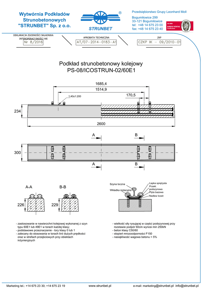 Przedsiębiorstwo Grupy Leonhard Moll Bogumiłowice 299 33-121 Bogumiłowice tel: +48 14 675 23 00 fax: +48 14 675 23 40 Strunobetonowych "STRUNBET" Sp. z o.o. DEKLARACJA ZGODNOŚCI SKŁADNIKA INTEROPERACYJNOŚCI WE APROBATA TECHNICZNA ZKP Podkład strunobetonowy kolejowy PS-08/ICOSTRUN-02/60E1 1685,4 1514,9 170,5 1:40±1:200 234 2600 A B A B 300 A-A B-B Szyna toczna Wkładka izolacyjna Łapka sprężysta Przekł. podszynowa Płyta bazowa Nadlew Icosit 226 229 - zastosowanie w nawierzchni kolejowej wykonanej z szyn typu 60E1 lub 49E1 w torach każdej klasy; - podstawowe przeznaczenie - tory klasy 0 lub 1 - zalecany do stosowania w torach linii dużych prędkości oraz w strefach przejściowych przy obiektach inżynieryjnych Marketing tel.: +14 675 23 30; +14 675 23 19 - wielkość siły rysującej w części podszynowej przy rozstawie podpór 60cm wynosi min 250kN - beton klasy C50/60 - stopień mrozoodporności F150 - nasiąkliwość wagowa betonu < 5% www.strunbet.pl e-mail: [email protected] [email protected]