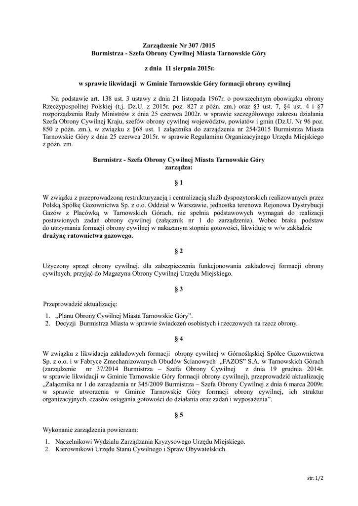 Zarządzenie Nr 307 /2015 Burmistrza - Szefa Obrony Cywilnej Miasta Tarnowskie Góry z dnia 11 sierpnia 2015r. w sprawie likwidacji w Gminie Tarnowskie Góry formacji obrony cywilnej Na podstawie art. 138 ust. 3 ustawy z dnia 21 listopada 1967r. o powszechnym obowiązku obrony Rzeczypospolitej Polskiej (t.j. Dz.U. z 2015r. poz. 827 z późn. zm.) oraz §3 ust. 7, §4 ust. 4 i §7 rozporządzenia Rady Ministrów z dnia 25 czerwca 2002r. w sprawie szczegółowego zakresu działania Szefa Obrony Cywilnej Kraju, szefów obrony cywilnej województw, powiatów i gmin (Dz.U. Nr 96 poz. 850 z późn. zm.), w związku z §68 ust. 1 załącznika do zarządzenia nr 254/2015 Burmistrza Miasta Tarnowskie Góry z dnia 25 czerwca 2015r. w sprawie Regulaminu Organizacyjnego Urzędu Miejskiego z późn. zm. Burmistrz - Szefa Obrony Cywilnej Miasta Tarnowskie Góry zarządza: §1 W związku z przeprowadzoną restrukturyzacją i centralizacją służb dyspozytorskich realizowanych przez Polską Spółkę Gazownictwa Sp. z o.o. Oddział w Warszawie, jednostka terenowa Rejonowa Dystrybucji Gazów z Placówką w Tarnowskich Górach, nie spełnia podstawowych wymagań do realizacji postawionych zadań obrony cywilnej (załącznik nr 1 do zarządzenia). Wobec braku podstaw do utrzymania formacji obrony cywilnej w nakazanym stopniu gotowości, likwiduję w w/w zakładzie drużynę ratownictwa gazowego. §2 Użyczony sprzęt obrony cywilnej, dla zabezpieczenia funkcjonowania zakładowej formacji obrony cywilnych, przyjąć do Magazynu Obrony Cywilnej Urzędu Miejskiego. §3 Przeprowadzić aktualizację: 1. „Planu Obrony Cywilnej Miasta Tarnowskie Góry”. 2. Decyzji Burmistrza Miasta w sprawie świadczeń osobistych i rzeczowych na rzecz obrony. §4 W związku z likwidacja zakładowych formacji obrony cywilnej w Górnośląskiej Spółce Gazownictwa Sp. z o.o. i w Fabryce Zmechanizowanych Obudów Ścianowych „FAZOS” S.A. w Tarnowskich Górach (zarządzenie nr 37/2014 Burmistrza – Szefa Obrony Cywilnej z dnia 19 grudnia 2014r. w sprawie likwidacji w Gminie Tarnowskie Góry formacji obrony cywilnej), przeprowadzić aktualizację „Załącznika nr 1 do zarządzenia nr 345/2009 Burmistrza – Szefa Obrony Cywilnej z dnia 6 marca 2009r. w sprawie utworzenia w Gminie Tarnowskie Góry formacji obrony cywilnej, ich struktur organizacyjnych, czasów osiągania gotowości do działania oraz zadań i wyposażenia”. §5 Wykonanie zarządzenia powierzam: 1. Naczelnikowi Wydziału Zarządzania Kryzysowego Urzędu Miejskiego. 2. Kierownikowi Urzędu Stanu Cywilnego i Spraw Obywatelskich. str. 1/2 §6 Zarządzenie wchodzi w życie z dniem podjęcia. Burmistrza - Szefa Obrony Cywilnej Miasta Tarnowskie Góry /-/ Arkadiusz CZECH str. 2/2