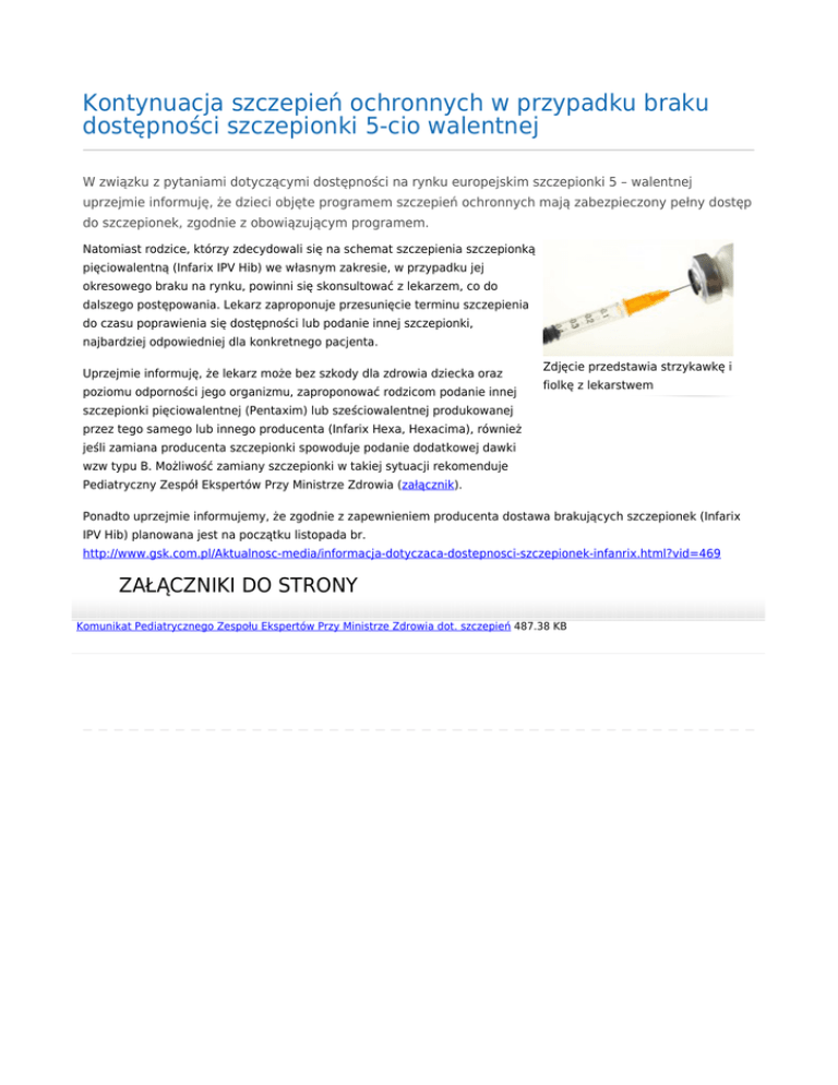 Kontynuacja szczepień ochronnych w przypadku braku dostępności szczepionki 5-cio walentnej W związku z pytaniami dotyczącymi dostępności na rynku europejskim szczepionki 5 – walentnej uprzejmie informuję, że dzieci objęte programem szczepień ochronnych mają zabezpieczony pełny dostęp do szczepionek, zgodnie z obowiązującym programem. Natomiast rodzice, którzy zdecydowali się na schemat szczepienia szczepionką pięciowalentną (Infarix IPV Hib) we własnym zakresie, w przypadku jej okresowego braku na rynku, powinni się skonsultować z lekarzem, co do dalszego postępowania. Lekarz zaproponuje przesunięcie terminu szczepienia do czasu poprawienia się dostępności lub podanie innej szczepionki, najbardziej odpowiedniej dla konkretnego pacjenta. Uprzejmie informuję, że lekarz może bez szkody dla zdrowia dziecka oraz poziomu odporności jego organizmu, zaproponować rodzicom podanie innej Zdjęcie przedstawia strzykawkę i fiolkę z lekarstwem szczepionki pięciowalentnej (Pentaxim) lub sześciowalentnej produkowanej przez tego samego lub innego producenta (Infarix Hexa, Hexacima), również jeśli zamiana producenta szczepionki spowoduje podanie dodatkowej dawki wzw typu B. Możliwość zamiany szczepionki w takiej sytuacji rekomenduje Pediatryczny Zespół Ekspertów Przy Ministrze Zdrowia (załącznik). Ponadto uprzejmie informujemy, że zgodnie z zapewnieniem producenta dostawa brakujących szczepionek (Infarix IPV Hib) planowana jest na początku listopada br. http://www.gsk.com.pl/Aktualnosc-media/informacja-dotyczaca-dostepnosci-szczepionek-infanrix.html?vid=469 ZAŁĄCZNIKI DO STRONY Komunikat Pediatrycznego Zespołu Ekspertów Przy Ministrze Zdrowia dot. szczepień 487.38 KB