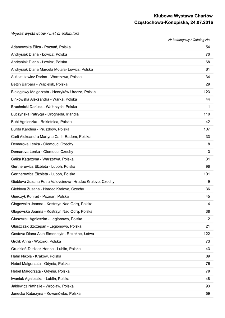 Klubowa Wystawa Chartów Częstochowa-Konopiska, 24.07.2016 Wykaz wystawców / List of exhibitors Nr katalogowy / Catalog No. Adamowska Eliza - Poznań, Polska 54 Andrysiak Diana - Łowicz, Polska 70 Andrysiak Diana - Łowicz, Polska 68 Andrysiak Diana Marcela Motała- Łowicz, Polska 61 Auksztulewicz Dorina - Warszawa, Polska 34 Bettin Barbara - Wąpielsk, Polska 29 Białogłowy Małgorzata - Henryków Urocze, Polska 123 Binkowska Aleksandra - Warka, Polska 44 Bruchnicki Dariusz - Wałbrzych, Polska 1 Buczynska Patrycja - Drogheda, Irlandia Buhl Agnieszka - Rokietnica, Polska Burda Karolina - Pruszków, Polska Carli Aleksandra Martyna Carli- Radom, Polska 110 42 107 33 Demarova Lenka - Olomouc, Czechy 8 Demarova Lenka - Olomouc, Czechy 3 Gałka Katarzyna - Warszawa, Polska 31 Gertnerowicz Elżbieta - Luboń, Polska 96 Gertnerowicz Elżbieta - Luboń, Polska 101 Gieblova Zuzana Petra Valovcinova- Hradec Kralove, Czechy 9 Gieblova Zuzana - Hradec Kralove, Czechy 36 Gierczyk Konrad - Poznań, Polska 45 Głogowska Joanna - Kostrzyn Nad Odrą, Polska 4 Głogowska Joanna - Kostrzyn Nad Odrą, Polska 38 Głuszczak Agnieszka - Legionowo, Polska 2 Głuszczak Szczepan - Legionowo, Polska 21 Gosteva Diana Asta Simonelyte- Rezekne, Łotwa 122 Grolik Anna - Woźniki, Polska 73 Grudzień-Dudziak Hanna - Lublin, Polska 43 Hahn Nikola - Kraków, Polska 89 Hebel Małgorzata - Gdynia, Polska 76 Hebel Małgorzata - Gdynia, Polska 79 Iwaniuk Agnieszka - Lublin, Polska 48 Jaklewicz Nathalie - Wrocław, Polska 93 Janecka Katarzyna - Kowanówko, Polska 59 Janecka Katarzyna - Kowanówko, Polska 60 Jarczyńska Monika - Ryńsk, Polska 80 Jarczyńska Monika Przemysław Jarczyński- Ryńsk, Polska 87 Jarczyńska Monika Przemysław Jarczyński- Ryńsk, Polska 85 Jarczyńska Monika - Ryńsk, Polska 81 Klimek Ewa - Łódź, Polska 114 Klouckova Kristyna Veronika Necasova- Liberec, Czechy 98 Knioła Elżbieta - Poznań, Polska 26 Knioła Elżbieta - Poznań, Polska 19 Kocur Izabela - Lubin, Polska 10 Koszarek Marek - Nowy Sącz, Polska 82 Koszarek Marek Maria Koszarek- Nowy Sącz, Polska 78 Kotnowska Paulina - Częstochowa, Polska 91 Kozik Aleksander - Pszczyna, Polska 124 Kozik Aleksander Tomasz Wolańczyk- Pszczyna, Polska 121 Kozik Aleksander - Pszczyna, Polska 115 Krapova Marta - Rymarov, Czechy 74 Krzeptowska Jowita - Luboń, Polska 103 Kundrat Antonin - Valasske Mezirici, Czechy 128 Kuraś Damian Jan Sitarski- Warszawa, Polska 84 Laskowska Anna Diana Andrysiak- Magdalenka, Polska 65 Lech Joanna - Warszawa, Polska 116 Lekki Justyna - Olkusz, Polska 72 Lipiński Leszek - Kępno, Polska 100 Lipiński Leszek - Kępno, Polska 94 Michajluck Zmicer - Grodno, Białoruś 50 Michalak Katarzyna - Poznań, Polska 118 Mijakowska Katarzyna - Konin, Polska 17 Miśków Agata - Tarnowskie Góry, Polska 88 Młodożeniec Weronika - Murowana Goślina, Polska 86 Morandini Klaudia - Łódź, Polska 51 Motała Marcela - Leszno, Polska 66 Mozeluk Adamska Ewelina - Leczna, Polska 55 Mozeluk Adamska Ewelina - Leczna, Polska 46 Naarits Iren - Tallin, Estonia 41 Nabiałczyk Krzysztof Krzysztof Sawicki- Łodz, Polska 56 Niewińska Magdalena Łukasz Niewiński- Olszewo-Borki, Polska 30 Niewińska Magdalena Łukasz Niewiński- Olszewo-Borki, Polska 22 Niewińska Magdalena Łukasz Niewiński- Olszewo-Borki, Polska 7 Nowak Alicja - Dąbrowa, Polska 40 Nowak Alicja - Dąbrowa, Polska 109 Nowak Monika - Stare Bogaczowice, Polska 11 Nowak Monika - Stare Bogaczowice, Polska 23 Nowak Roman - Dąbrowa, Polska 53 Olejarczyk Tomasz - Slupia Jedrzejowska, Polska 71 Piłat Agnieszka - Bolesławiec, Polska 125 Piłat Agnieszka - Bolesławiec, Polska 129 Rebeś Magdalena - Zakopane, Polska 83 Rebeś Magdalena - Zakopane, Polska 75 Rodych Oksana - Lviv, Ukraina 18 Rojszyk Anna - Bydgoszcz, Polska 117 Rygiel Agnieszka - Warszawa, Polska 119 Rzeźniczak Grzegorz Tomasz Kamiński- Józefina, Polska 58 Rzeźniczak Grzegorz Tomasz Kamiński- Józefina, Polska 134 Sakławska-Badziukiewicz Katarzyna - Górzno, Polska 67 Sakławska-Badziukiewicz Katarzyna - Górzno, Polska 69 Sarnowska Joanna - Bytom, Polska 13 Serafin Irmina - Thonex, Szwajcaria 5 Sęk Joanna - Dominice, Polska 104 Sęk Joanna - Dominice, Polska 106 Skowronek Karol - Warka, Polska 140 Skrabut Ewa - Nienadówka, Polska 52 Sławik Adam - Aleksandria Pierwsza, Polska 92 Smoczyńska Urszula - Poznań, Polska 77 Sokół-Iskra Ewa - Krzeszowice, Polska 131 Sokół-Iskra Ewa - Krzeszowice, Polska 138 Sokół-Iskra Ewa - Krzeszowice, Polska 137 Sokół-Iskra Ewa - Krzeszowice, Polska 135 Sokół-Iskra Ewa - Krzeszowice, Polska 133 Sokół-Iskra Ewa - Krzeszowice, Polska 130 Strużyna Renata - Warszawa, Polska 47 Strzałkowska Barbara - Kołczygłowy, Polska 136 Symanowicz Izabella - Kalisz, Polska 111 Szadkowska Agata - Zgorzała, Polska 35 Szadkowska Agata - Zgorzała, Polska 37 Szadkowska Agata - Zgorzała, Polska 25 Szadkowska Agata - Zgorzała, Polska 32 Szadkowska Agata - Zgorzała, Polska 20 Szopa Justyna Tomasz Wolańczyk- Cisie, Polska Szopa Justyna - Cisie, Polska 113 95 Szymańska Karolina - Konstantynów Łódzki, Polska 6 Szymańska Karolina - Konstantynów Łódzki, Polska 39 Szymańska Karolina - Konstantynów Łódzki, Polska 16 Szymańska Karolina - Konstantynów Łódzki, Polska 24 Ścibor Joanna - Grójec, Polska 64 Ścibor Joanna - Grójec, Polska 62 Ścibor Joanna - Grójec, Polska 105 Trzepacz Grażyna - Inowrocław, Polska 27 Trzepacz Grażyna - Inowrocław, Polska 14 Tvarogova Barbora - Svatoborice - Mistrin, Czechy 12 Tvarogova Barbora - Svatoborice - Mistrin, Czechy 15 Tvarogova Barbora Zdenek Barak- Svatoborice - Mistrin, Czechy 28 Wąsowska Laura - Konstancin-Jeziorna, Polska 90 Wąsowska Laura - Konstancin-Jeziorna, Polska 99 Weirauch Marzena - Czerwionka-Leszczyny, Polska 97 Wieczorek Iwona - Oława, Polska 63 Wirska Urszula - Warszawa, Polska 120 Wirska Urszula - Warszawa, Polska 112 Wolańczyk Tomasz - Warszawa, Polska 102 Wolska Beata - Warszawa Wesoła, Polska 108 Woźna-G