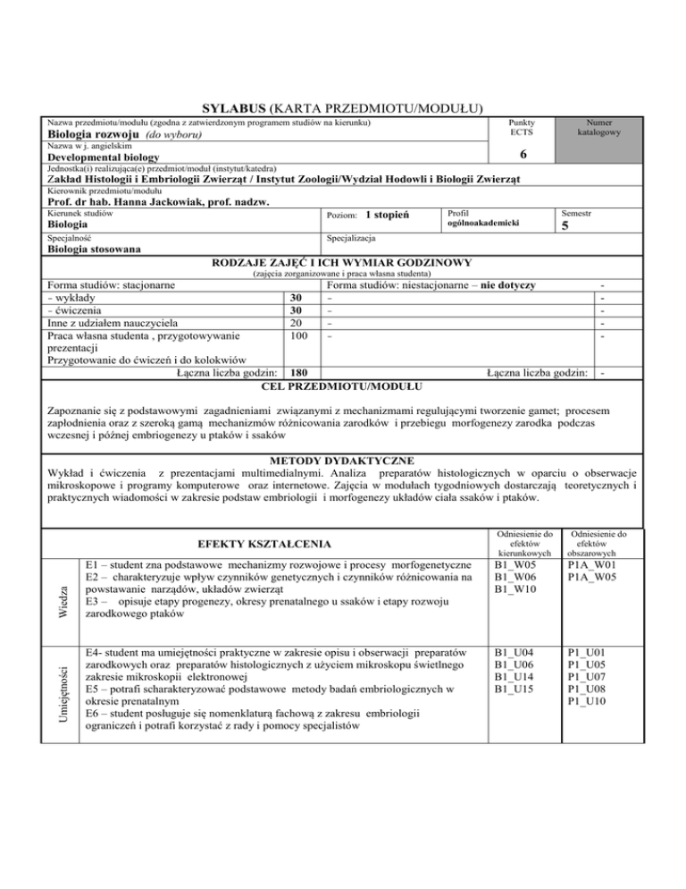 SYLABUS (KARTA PRZEDMIOTU/MODUŁU) Nazwa przedmiotu/modułu (zgodna z zatwierdzonym programem studiów na kierunku) Punkty ECTS Biologia rozwoju (do wyboru) Nazwa w j. angielskim Numer katalogowy 6 Developmental biology Jednostka(i) realizująca(e) przedmiot/moduł (instytut/katedra) Zakład Histologii i Embriologii Zwierząt / Instytut Zoologii/Wydział Hodowli i Biologii Zwierząt Kierownik przedmiotu/modułu Prof. dr hab. Hanna Jackowiak, prof. nadzw. Kierunek studiów Poziom: 1 stopień Biologia Specjalność Profil ogólnoakademicki Semestr 5 Specjalizacja Biologia stosowana RODZAJE ZAJĘĆ I ICH WYMIAR GODZINOWY (zajęcia zorganizowane i praca własna studenta) Forma studiów: stacjonarne Forma studiów: niestacjonarne – nie dotyczy wykłady 30 ćwiczenia 30 Inne z udziałem nauczyciela 20 Praca własna studenta , przygotowywanie 100 prezentacji Przygotowanie do ćwiczeń i do kolokwiów Łączna liczba godzin: 180 Łączna liczba godzin: CEL PRZEDMIOTU/MODUŁU - - Zapoznanie się z podstawowymi zagadnieniami związanymi z mechanizmami regulującymi tworzenie gamet; procesem zapłodnienia oraz z szeroką gamą mechanizmów różnicowania zarodków i przebiegu morfogenezy zarodka podczas wczesnej i późnej embriogenezy u ptaków i ssaków METODY DYDAKTYCZNE Wykład i ćwiczenia z prezentacjami multimedialnymi. Analiza preparatów histologicznych w oparciu o obserwacje mikroskopowe i programy komputerowe oraz internetowe. Zajęcia w modułach tygodniowych dostarczają teoretycznych i praktycznych wiadomości w zakresie podstaw embriologii i morfogenezy układów ciała ssaków i ptaków. Odniesienie do efektów kierunkowych Odniesienie do efektów obszarowych E1 – student zna podstawowe mechanizmy rozwojowe i procesy morfogenetyczne E2 – charakteryzuje wpływ czynników genetycznych i czynników różnicowania na powstawanie narządów, układów zwierząt E3 – opisuje etapy progenezy, okresy prenatalnego u ssaków i etapy rozwoju zarodkowego ptaków B1_W05 B1_W06 B1_W10 P1A_W01 P1A_W05 E4- student ma umiejętności praktyczne w zakresie opisu i obserwacji preparatów zarodkowych oraz preparatów histologicznych z użyciem mikroskopu świetlnego zakresie mikroskopii elektronowej E5 – potrafi scharakteryzować podstawowe metody badań embriologicznych w okresie prenatalnym E6 – student posługuje się nomenklaturą fachową z zakresu embriologii ograniczeń i potrafi korzystać z rady i pomocy specjalistów B1_U04 B1_U06 B1_U14 B1_U15 P1_U01 P1_U05 P1_U07 P1_U08 P1_U10 Umiejętności Wiedza EFEKTY KSZTAŁCENIA Kompetencje Społeczne E7- student ma umiejętność krytycznej analizy danych E8 – student ma potrzebę i rozumie konieczność ustawicznego kształcenia B1_K01 P1A_K01 P1A_K05 P1A_K07 Numery efektów Metody weryfikacji efektów kształcenia: Kolokwia z części ćwiczeniowej Egzamin pisemny E1-6 E1-8 TREŚCI KSZTAŁCENIA Wykłady Gametogeneza. Wczesny rozwój zarodków - typy bruzdkowania u bezkręgowców i kręgowców. Przebieg i mechanizmy gastrulacji (ruchy morfogenetyczne, indukcja). Procesy degeneracji. Mechanizmy rozwojowe i procesy morfogenetyczne rozwoju zarodków ssaków w okresie przedimplanatacyjnym. Kształtowanie błon płodowych. Implantacja i rozwój wybranych typów łożysk. Ćwiczenia Podłoże genetyczne i przebieg procesów historóżnicowania narządów pierwotnych. Procesy organogenezy wybranych narządów układu nerwowego ( rozwój cewy nerwowej, różnicowanie grzebienia nerwowego, histogeneza nerwów), krwionośnego (angiogeneza i waskulogeneza), pokarmowego, oddechowego, moczowego (pranercze, przednercze i nerka ostateczna) i rozrodczego (stadia rozwoju gonad i przewodów płciowych) ssaków i ptaków. Najczęstsze wady rozwojowe narządów. Formy i kryteria zaliczenia przedmiotu/modułu Zaliczenia cząstkowe praktyczne i teoretyczne z ćwiczeń Procentowy udział w końcowej ocenie (uzyskanie co najmniej 65% prawidłowych odpowiedzi) Egzamin końcowy z treści wykładów i ćwiczeń 100% egzamin WYKAZ LITERATURY Literatura podstawowa 1. Bielańska-Osuchowska Z (2010) Embriologia. Wyd. PWRiL, Warszawa 2. Jura Cz., Klag J.(2005) Podstawy embriologii zwierząt i człowieka. Tom 1. Podstawowe procesy rozmnażania i rozwoju osobniczego. Wyd. Naukowe PWN, Warszawa 3. Jura Cz., Klag J.(2005) Podstawy embriologii zwierząt i człowieka Tom 2. Mechanizmy rozwoju zarodkowego. Niektóre zastosowania praktyczne współczesnej embriologii. Wyd. Naukowe PWN, Warszawa 4. Rodkiewicz B. (1998) Biologia rozwoju. Wyd. PWN, Warszawa Literatura uzupełniająca 1. Bielańska-Osuchowska Z. (2004) Zarys organogenezy. Wyd. Naukowe PWN, Warszawa