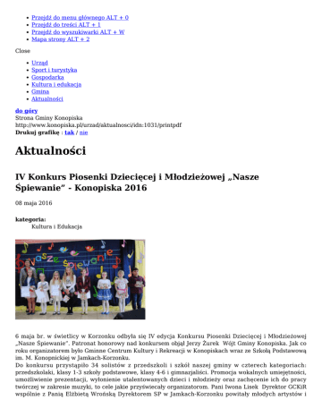 Przejdź do menu głównego ALT + 0 Przejdź do treści ALT + 1 Przejdź do wyszukiwarki ALT + W Mapa strony ALT + 2 Close Urząd Sport i turystyka Gospodarka Kultura i edukacja Gmina Aktualności do góry Strona Gminy Konopiska http://www.konopiska.pl/urzad/aktualnosci/idn:1031/printpdf Drukuj grafikę : tak / nie Aktualności IV Konkurs Piosenki Dziecięcej i Młodzieżowej „Nasze Śpiewanie” - Konopiska 2016 08 maja 2016 kategoria: Kultura i Edukacja 6 maja br. w świetlicy w Korzonku odbyła się IV edycja Konkursu Piosenki Dziecięcej i Młodzieżowej „Nasze Śpiewanie”. Patronat honorowy nad konkursem objął Jerzy Żurek Wójt Gminy Konopiska. Jak co roku organizatorem było Gminne Centrum Kultury i Rekreacji w Konopiskach wraz ze Szkołą Podstawową im. M. Konopnickiej w Jamkach-Korzonku. Do konkursu przystąpiło 34 solistów z przedszkoli i szkół naszej gminy w czterech kategoriach: przedszkolaki, klasy 1-3 szkoły podstawowe, klasy 4-6 i gimnazjaliści. Promocja wokalnych umiejętności, umożliwienie prezentacji, wyłonienie utalentowanych dzieci i młodzieży oraz zachęcenie ich do pracy twórczej w zakresie muzyki, to cele jakie przyświecały organizatorom. Pani Iwona Lisek Dyrektor GCKiR wspólnie z Panią Elżbietą Wrońską Dyrektorem SP w Jamkach-Korzonku powitały młodych artystów i przybyłych gości, a całą imprezę muzyczną jak co roku w profesjonalny sposób poprowadziła Pani Dorota Mielczarek. Wykonawcy świetnie się bawili, prezentując swoje umiejętności wokalne na bardzo wysokim poziomie. Śpiewali w języku polskim jedną piosenkę o tematyce dziecięcej lub młodzieżowej dostosowanej formą i treścią do ich wieku. Komisja w składzie: Bernadetta Owcarz – muzyk instrumentalista, nauczyciel gry na flecie, muzykoterapeuta, Paweł Łowicki – muzyk, balladzista, autor tekstów, w 2014r. wydał płytę pt. ”Do zobaczenia”, Tomasz Hadrian – kapelmistrz Orkiestry Dętej OSP Konopiska, oceniała: dobór repertuaru do wieku wykonawcy, interpretację utworu, technikę i walory głosowe, intonację, emisję głosu, dykcję oraz wyraz artystyczno-sceniczny. Po wysłuchaniu wszystkich prezentacji przyznała następujące miejsca i wyróżnienia: wśród przedszkolaków I miejsce – Paulina Bitner – Przedszkole w Konopiskach II miejsce – Wiktoria Harabas – SP w Jamkach-Korzonku, Oddział Przedszkolny III miejsce – Nadia Kowalik – SP w Łaźcu, Oddział Przedszkolny szkoły podstawowe klasy 1 – 3 I miejsce – Anna Blukacz – SP w Jamkach-Korzonku II miejsce – Wiktoria Herman – ZSP w Aleksandrii III miejsce – Wiktoria Wojtaluk – ZS w Konopiskach szkoły podstawowe klasy 4 – 6 I miejsce – Nikola Cuber – SP w Jamkach-Korzonku II miejsce – Wiktoria Burzyńska – SP w Łaźcu III miejsce – Julia Kozik – ZS w Konopiskach wyróżnienie – Zofia Kamińska – SP w Jamkach-Korzonku klasy gimnazjum I miejsce – Karolina Skaczyło - Gimnazjum w Aleksandrii II miejsce – Wiktoria Kozik – Gimnazjum w Konopiskach II miejsce – Jakub Morawiec – Gimnazjum w Konopiskach Dzięki finansowemu wsparciu konkursu przez Urząd Gminy, nie tylko laureaci, ale również wszyscy uczestnicy otrzymali dyplomy i rzeczowe upominki, które wręczała w towarzystwie członków komisji Pani Zofia Kuśmierska Zastępca Wójta Gminy Konopiska. Serdecznie dziękujemy wszystkim uczestnikom konkursu za udział, gratulujemy zwycięzcom i zapraszamy za rok! M.Łyszczarz/GCKiR powrót do listy aktualności