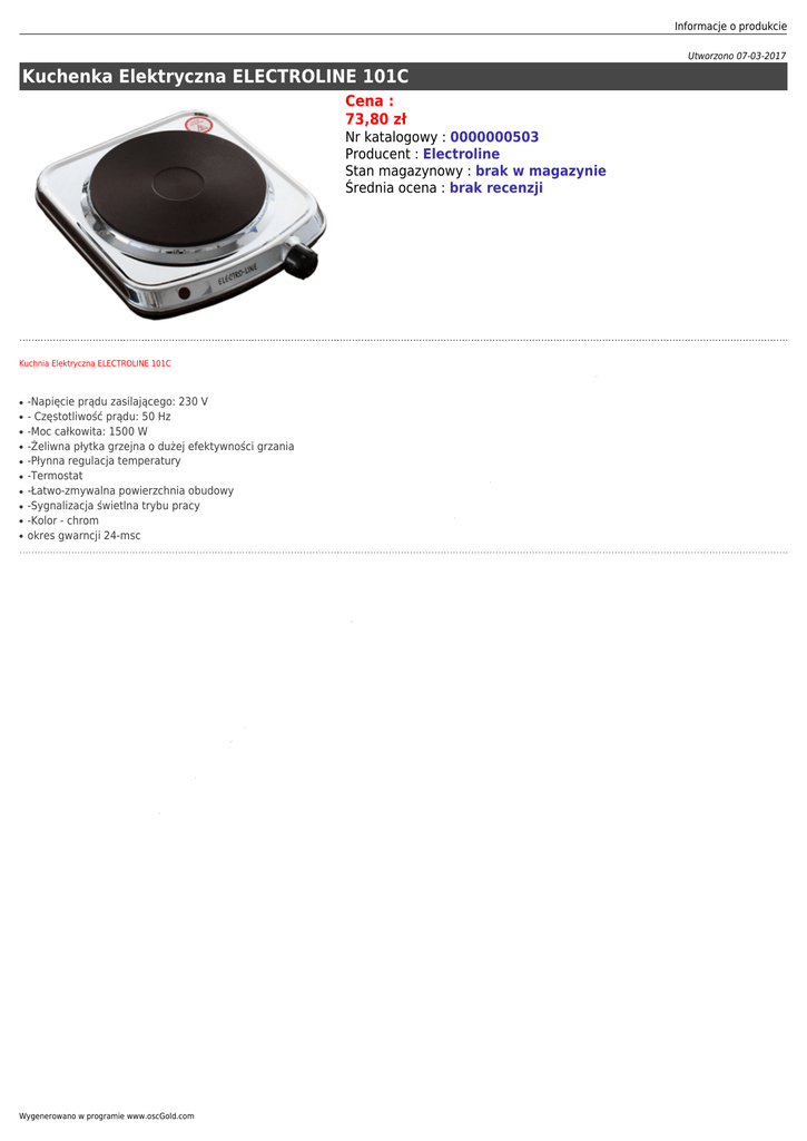 Informacje o produkcie Utworzono 07-03-2017 Kuchenka Elektryczna ELECTROLINE 101C Cena : 73,80 zł ● ● ● ● w ● Wygenerowano w programie www.oscGold.com r ● a ● r ● -Napięcie prądu zasilającego: 230 V - Częstotliwość prądu: 50 Hz -Moc całkowita: 1500 W -Żeliwna płytka grzejna o dużej efektywności grzania -Płynna regulacja temperatury -Termostat -Łatwo-zmywalna powierzchnia obudowy -Sygnalizacja świetlna trybu pracy -Kolor - chrom okres gwarncji 24-msc te ● a ● m Kuchnia Elektryczna ELECTROLINE 101C k Nr katalogowy : 0000000503 Producent : Electroline Stan magazynowy : brak w magazynie Średnia ocena : brak recenzji