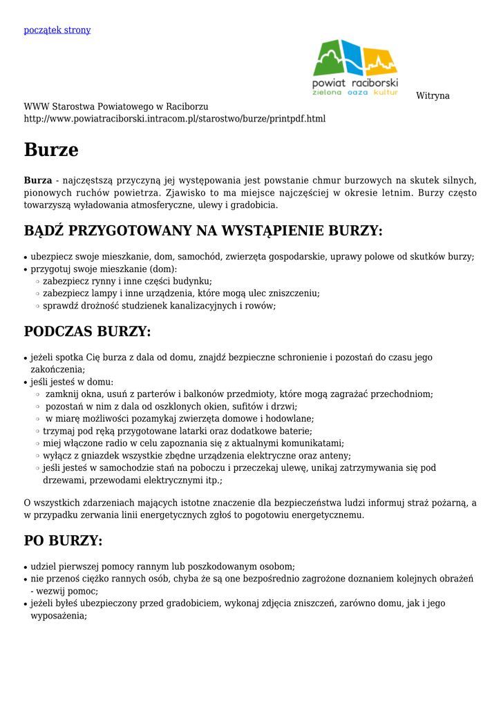 początek strony Witryna WWW Starostwa Powiatowego w Raciborzu http://www.powiatraciborski.intracom.pl/starostwo/burze/printpdf.html Burze Burza - najczęstszą przyczyną jej występowania jest powstanie chmur burzowych na skutek silnych, pionowych ruchów powietrza. Zjawisko to ma miejsce najczęściej w okresie letnim. Burzy często towarzyszą wyładowania atmosferyczne, ulewy i gradobicia. BĄDŹ PRZYGOTOWANY NA WYSTĄPIENIE BURZY: ● ● ubezpiecz swoje mieszkanie, dom, samochód, zwierzęta gospodarskie, uprawy polowe od skutków burzy; przygotuj swoje mieszkanie (dom): zabezpiecz rynny i inne części budynku; zabezpiecz lampy i inne urządzenia, które mogą ulec zniszczeniu; sprawdź drożność studzienek kanalizacyjnych i rowów; ❍ ❍ ❍ PODCZAS BURZY: ● ● jeżeli spotka Cię burza z dala od domu, znajdź bezpieczne schronienie i pozostań do czasu jego zakończenia; jeśli jesteś w domu: zamknij okna, usuń z parterów i balkonów przedmioty, które mogą zagrażać przechodniom; pozostań w nim z dala od oszklonych okien, sufitów i drzwi; w miarę możliwości pozamykaj zwierzęta domowe i hodowlane; trzymaj pod ręką przygotowane latarki oraz dodatkowe baterie; miej włączone radio w celu zapoznania się z aktualnymi komunikatami; wyłącz z gniazdek wszystkie zbędne urządzenia elektryczne oraz anteny; jeśli jesteś w samochodzie stań na poboczu i przeczekaj ulewę, unikaj zatrzymywania się pod drzewami, przewodami elektrycznymi itp.; ❍ ❍ ❍ ❍ ❍ ❍ ❍ O wszystkich zdarzeniach mających istotne znaczenie dla bezpieczeństwa ludzi informuj straż pożarną, a w przypadku zerwania linii energetycznych zgłoś to pogotowiu energetycznemu. PO BURZY: ● ● ● udziel pierwszej pomocy rannym lub poszkodowanym osobom; nie przenoś ciężko rannych osób, chyba że są one bezpośrednio zagrożone doznaniem kolejnych obrażeń - wezwij pomoc; jeżeli byłeś ubezpieczony przed gradobiciem, wykonaj zdjęcia zniszczeń, zarówno domu, jak i jego wyposażenia;