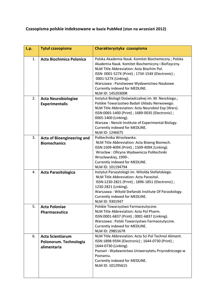Czasopisma polskie indeksowane w bazie PubMed (stan na wrzesień 2012) L.p. Tytuł czasopisma Charakterystyka czasopisma 1. Acta Biochimica Polonica 2. Acta Neurobiologiae Experimentalis 3. Acta of Bioengineering and Biomechanics 4. Acta Parasitologica 5. Acta Poloniae Pharmaceutica 6. Acta Scientiarum Polonorum. Technologia alimentaria Polska Akademia Nauk. Komitet Biochemiczny.; Polska Akademia Nauk. Komitet Biochemiczny i Biofizyczny. NLM Title Abbreviation: Acta Biochim Pol. ISSN: 0001-527X (Print) ; 1734-154X (Electronic) ; 0001-527X (Linking). Warszawa : Panstwowe Wydawnictwo Naukowe. Currently indexed for MEDLINE. NLM ID: 14520300R Instytut Biologii Doświadczalnej im. M. Nenckiego.; Polskie Towarzystwo Badań Układu Nerwowego. NLM Title Abbreviation: Acta Neurobiol Exp (Wars). ISSN:0065-1400 (Print) ; 1689-0035 (Electronic) ; 0065-1400 (Linking). Warsaw : Nencki Institute of Experimental Biology. Currently indexed for MEDLINE. NLM ID: 1246675 Politechnika Wrocławska. NLM Title Abbreviation: Acta Bioeng Biomech. ISSN:1509-409X (Print) ; 1509-409X (Linking). Wrocław : Oficyna Wydawnicza Politechniki Wrocławskiej, 1999-. Currently indexed for MEDLINE. NLM ID: 101194794 Instytut Parazytologii im. Witolda Stefańskiego. NLM Title Abbreviation: Acta Parasitol. ISSN:1230-2821 (Print) ; 1896-1851 (Electronic) ; 1230-2821 (Linking). Warszawa : Witold Stefanski Institute Of Parasitology. Currently indexed for MEDLINE. NLM ID: 9301947 Polskie Towarzystwo Farmaceutyczne. NLM Title Abbreviation: Acta Pol Pharm. ISSN:0001-6837 (Print) ; 0001-6837 (Linking). Warszawa : Polski Towarzystwo Farmaceutyczne. Currently indexed for MEDLINE. NLM ID: 2985167R NLM Title Abbreviation: Acta Sci Pol Technol Aliment. ISSN:1898-9594 (Electronic) ; 1644-0730 (Print) ; 1644-0730 (Linking). Poznań : Wydawnictwo Uniwersytetu Przyrodniczego w Poznaniu. Currently indexed for MEDLINE. NLM ID: 101295615 7. Advances in Medical Sciences 8. Anaesthesiology Intensive Therapy 9. Annales Academiae Medicae Stetinensis 10. Annales Universitatis Mariae Curie-Skłodowska. Sectio D: Medicina 11. Annals of Agricultural and Environmental Medicine : AAEM 12. Annals of Transplantation : quarterly of the Polish Transplantation Society Polish Transplantation Society. 13. Archiwum Medycyny Sadowe i ryminologii 14. Cardiology Journal Akademia Medyczna w Białymstoku. NLM Title Abbreviation: Adv Med Sci. ISSN:1896-1126 (Print) ; 1898-4002 (Electronic) ; 1896-1126 (Linking). Białystok, Poland : Medical University of Białystok, [2006]-. Currently indexed for MEDLINE. NLM ID: 101276222 Polskie Towarzystwo Anestezjologii i Intensywnej Terapii. NLM Title Abbreviation: Anaesthesiol Intensive Ther. ISSN:0209-1712 (Print) ; 1731-2515 (Electronic). 2012- : Gdansk : Via Medica. Currently indexed for MEDLINE. NLM ID: 101472620 Pomorski Uniwersytet Medyczny w Szczecinie. NLM Title Abbreviation: Ann Acad Med Stetin. ISSN:1427-440X (Print) ; 1427-440X(Linking). Warszawa : Panstwowy Zaklad Wydawnictw Lekarskich. Currently indexed for MEDLINE. NLM ID: 7506854 Uniwersytet Medyczny w Lublinie.; Uniwersytet Marii Curie-Skłodowskiej. NLM Title Abbreviation: Ann Univ Mariae Curie Sklodowska Med. ISSN:0066-2240 (Print) ;0066-2240 (Linking). Lublin : Wydawn. Uniwersytetu Marii Curie Sklodowskies. Currently indexed for MEDLINE. NLM ID: 0414101 Institute of Agricultural Medicine (Poland). NLM Title Abbreviation: Ann Agric Environ Med. ISSN:1232-1966 (Print) ; 1898-2263 (Electronic) ; 1232-1966 (Linking). Lublin : Institute Of Agricultural Medicine. Currently indexed for MEDLINE. NLM ID: 9500166 NLM Title Abbreviation: Ann Transplant. ISSN:1425-9524 (Print) ; 1425-9524 (Linking). Warsaw : Index Copernicus International. Currently indexed for MEDLINE. NLM ID: 9802544 NLM Title Abbreviation: Arch Med Sadowej Kryminol. ISSN:0324-8267 (Print) ;0324-8267 (Linking). Warszawa, Państwowy Zakład Wydawn. Lekarskich. Currently indexed for MEDLINE. NLM ID: 1260766 Polskie Towarzystwo Kardiologiczne. NLM Title Abbreviation: Cardiol J. ISSN:1897-5593 (Electronic) ; 1898-018X (Linking). Gdańsk : Via Medica. Currently indexed for MEDLINE. NLM ID: 101392712 15. Cellular & Molecular Biology Letters 16. Chirurgia Narzadów Ruchu i Ortopedia Polska 17. Endokrynologia Polska 18. European Journal of Cardio-Thoracic Surgery : official journal of the European Association for Cardiothoracic Surgery European Association for Cardiothoracic Surgery. 19. Folia Biologica 20. Folia Histochemica et Cytobiologica/ Polish Academy of Sciences, Polish Histochemical and Cytochemical Society 21. Folia Medica Cracoviensia Uniwersytet Wrocławski. Biochemistry Institute. Dept. of Genetic Biochemistry.; Polska Akademia Nauk. Komitet Biochemiczny i Biofizyczny.; Polish Network for Molecular and Cell Biology UNESCO/PAN. NLM Title Abbreviation: Cell Mol Biol Lett. ISSN:1425-8153 (Print) ; 1689-1392 (Electronic) ; 1425-8153 (Linking). Warsaw : Berlin : Versita ; Springer. Currently indexed for MEDLINE. NLM ID: 9607427 Polskie Towarzystwo Ortopedyczne.; Polskie Towarzystwo Ortopedyczne i Traumatologiczne. NLM Title Abbreviation: Chir Narzadow Ruchu Ortop Pol. ISSN:0009-479X (Print) ; 0009-479X (Linking). Warszawa : Panstwowy Zaklad Wydawnictw Lekarskich. Currently indexed for MEDLINE. NLM ID: 2985137R Polskie Towarzystwo Endokrynologiczne. NLM Title Abbreviation: Endokrynol Pol. ISSN:0423-104X (Print) ; 0423-104X (Linking). Warszawa : Wydawnictwo Viamedica. Currently indexed for MEDLINE. NLM ID: 0370674 NLM Title Abbreviation: Eur J Cardiothorac Surg. ISSN:1010-7940 (Print) ; 1873-734X (Electronic) ; 1010-7940 (Linking). Kidlington, Oxford, UK : Elsevier Science. Currently indexed for MEDLINE. NLM ID: 8804069 NLM Title Abbreviation: Folia Biol (Krakow). ISSN:0015-5497 (Print) ; 0015-5497 (Linking). Krakow :Institute of Systematics and Evolution of Animals. Currently indexed for MEDLINE. NLM ID: 2984758R Polskie Towarzystwo Histochemików i Cytochemików.; Polska Akademia Nauk. NLM Title Abbreviat