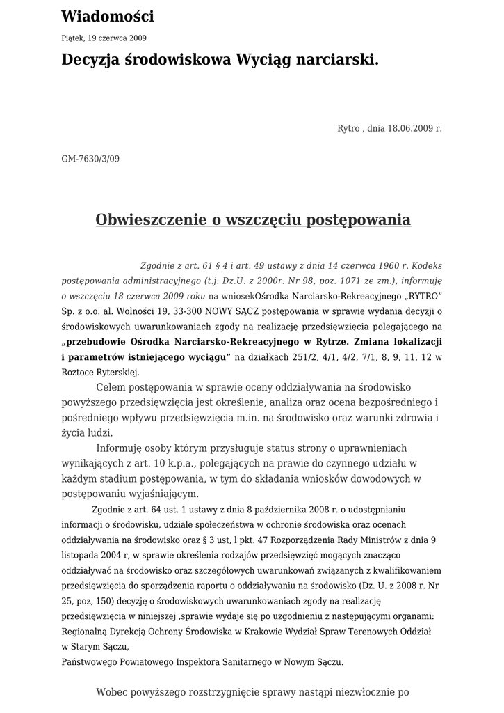 Wiadomości Piątek, 19 czerwca 2009 Decyzja środowiskowa Wyciąg narciarski. Rytro , dnia 18.06.2009 r. GM-7630/3/09 Obwieszczenie o wszczęciu postępowania Zgodnie z art. 61 § 4 i art. 49 ustawy z dnia 14 czerwca 1960 r. Kodeks postępowania administracyjnego (t.j. Dz.U. z 2000r. Nr 98, poz. 1071 ze zm.), informuję o wszczęciu 18 czerwca 2009 roku na wniosekOśrodka Narciarsko-Rekreacyjnego „RYTRO” Sp. z o.o. al. Wolności 19, 33-300 NOWY SĄCZ postępowania w sprawie wydania decyzji o środowiskowych uwarunkowaniach zgody na realizację przedsięwzięcia polegającego na „przebudowie Ośrodka Narciarsko-Rekreacyjnego w Rytrze. Zmiana lokalizacji i parametrów istniejącego wyciągu” na działkach 251/2, 4/1, 4/2, 7/1, 8, 9, 11, 12 w Roztoce Ryterskiej. Celem postępowania w sprawie oceny oddziaływania na środowisko powyższego przedsięwzięcia jest określenie, analiza oraz ocena bezpośredniego i pośredniego wpływu przedsięwzięcia m.in. na środowisko oraz warunki zdrowia i życia ludzi. Informuję osoby którym przysługuje status strony o uprawnieniach wynikających z art. 10 k.p.a., polegających na prawie do czynnego udziału w każdym stadium postępowania, w tym do składania wniosków dowodowych w postępowaniu wyjaśniającym. Zgodnie z art. 64 ust. 1 ustawy z dnia 8 października 2008 r. o udostępnianiu informacji o środowisku, udziale społeczeństwa w ochronie środowiska oraz ocenach oddziaływania na środowisko oraz § 3 ust, l pkt. 47 Rozporządzenia Rady Ministrów z dnia 9 listopada 2004 r, w sprawie określenia rodzajów przedsięwzięć mogących znacząco oddziaływać na środowisko oraz szczegółowych uwarunkowań związanych z kwalifikowaniem przedsięwzięcia do sporządzenia raportu o oddziaływaniu na środowisko (Dz. U. z 2008 r. Nr 25, poz, 150) decyzję o środowiskowych uwarunkowaniach zgody na realizację przedsięwzięcia w niniejszej ,sprawie wydaje się po uzgodnieniu z następującymi organami: Regionalną Dyrekcją Ochrony Środowiska w Krakowie Wydział Spraw Terenowych Oddział w Starym Sączu, Państwowego Powiatowego Inspektora Sanitarnego w Nowym Sączu. Wobec powyższego rozstrzygnięcie sprawy nastąpi niezwłocznie po uzyskaniu wymaganego uzgodnienia i opinii pomocniczych. Obwieszenie zostało zamieszczone na stronie internetowej Biuletynu Informacji Publicznej Gminy Rytro, oraz na tablicy ogłoszeń Urzędu Gminy Rytro W związku z tym zainteresowani mogą w Urzędzie Gminy Rytro (pokój Nr 8) w terminie 14 dniu od daty opublikowania niniejszego obwieszczenia zapoznać się z zamierzeniami inwestycyjnymi wnioskodawcy. Wójt Gminy Rytro Władysław Wnętrzak Lista stron: Wg. oddzielnego wykazu. Wykaz stron: Dz. 251/2 - Ośrodek Narciarsko-Rekreacyjnego „RYTRO” Sp. z o.o. al. Wolności 19, 33- 300 NOWY SĄCZ Dz. 4/1, 9, 12 – Małgorzata i Jan Berstling, Roztoka Ryterska 57 Dz. 4/2 – Wspólnota wsi Roztoka Ryterska – Małgorzata Pancerz, Roztoka Ryterska 59 Dz. 8 – Irena Tomasiak, Roztoka Ryterska 68 Dz. 11 – Maria i Stanisław kowalik, Roztoka Ryterska 18 Rytro, dn. 18.06.2009 r. Znak sprawy: GKŚ-7630/3/09 ZAWIADOMIENIE o wszczęciu postępowania administracyjnego zawiadamiam, na podstawie art. 61 § 4 ustawy z dnia 14 czerwca 1960 r, kodeks postępowania administracyjnego (t.j, Dz, U- z 2000 r. Nr 98, póz. 1071 zm.), o wszczęciu w dniu 10.06.2009 r. na wniosek Powiatowego Zarządu Dróg w Nowym Sączu postępowania w sprawie wydania decyzji o środowiskowych uwarunkowaniach zgody na „przebudowie Ośrodka Narciarsko-Rekreacyjnego w Rytrze. Zmiana lokalizacji i parametrów istniejącego wyciągu” na działkach 251/2, 4/1, 4/2, 7/1, 8, 9, 11, 12 w Roztoce Ryterskiej. Celem postępowania w sprawie oceny oddziaływania na środowisko powyższego przedsięwzięcia jest określenie, analiza oraz ocena bezpośredniego i pośredniego wpływu przedsięwzięcia, m.in. na środowisko oraz warunki zdrowia i życia ludzi, Informuję o uprawnieniach stron tego postępowania, wynikających z a 10 k.p.a., polegających na prawie do czynnego udziału w każdym stadium, w tym o prawie przeglądania akt sprawy, uzyskania wyjaśnień oraz składania wniosków dowodowych w postępowaniu wyjaśniającym. Zgodnie z art. 64 ust. 1 ustawy z dnia 8 października 2008 r. o udostępnianiu informacji o środowisku, udziale społeczeństwa w ochronie środowiska oraz ocenach oddziaływania na środowisko oraz § 3 ust, l pkt. 47 Rozporządzenia Rady Ministrów z dnia 9 listopada 2004 r, w sprawie określenia rodzajów przedsięwzięć mogących znacząco oddziaływać na środowisko oraz szczegółowych uwarunkowań związanych z kwalifikowaniem przedsięwzięcia do sporządzenia raportu o oddziaływaniu na środowisko (Dz. U. z 2008 r. Nr 25, poz, 150) decyzję o środowiskowych uwarunkowaniach zgody na realizację przedsięwzięcia w niniejszej ,sprawie wydaje się po uzgodnieniu z następującymi organami: Regionalną Dyrekcją Ochrony Środowiska w Krakowie Wydział Spraw Terenowych Oddział w Starym Sączu Państwowego Powiatowego Inspektora Sanitarnego w Nowym Sączu Wobec powyższego rozstrzygniecie sprawy nastąpi niezwłocznie po uzyskaniu wymaganych uzgodnień oraz opinii pomocniczych. Zgodnie z art. 35 § 5 k,p.a, do terminów załatwienia sprawy nie wlicza się terminów przewidzianych w przepisach prawa dla dokonania określonych czynności okresów zawieszenia postępowania oraz okresów opóźnień, spowodowanych ze strony albo z przyczyn niezależnych od organu. Na podstawie art. 41 k,p,a. w toku postępowania strony oraz ich przedstawiciele i pełnomocnicy mają obowiązek zawiadomić organ administracji publicznej o każdej zmianie swojego adresu. Zgodnie z § 2 w razie zaniedbania obowiązku określonego w § l doręczenie pisma pod dotychczasowym adresem ma skutek prawny. Informuję, iż na podstawie art. 30 ustawy o udostępnianiu informacji o środowisku i jego ochronie. Udziale społeczeństwa w ochronie 