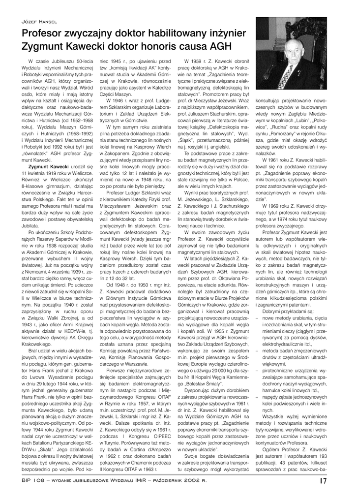 Józef Hansel Profesor zwyczajny doktor habilitowany in¿ynier Zygmunt Kawecki doktor honoris causa AGH W czasie Jubileuszu 50-lecia Wydzia³u In¿ynierii Mechanicznej i Robotyki wspominaliœmy tych pracowników AGH, którzy organizowali i tworzyli nasz Wydzia³. Wœród osób, które mia³y i maj¹ istotny wp³yw na kszta³t i osi¹gniêcia dydaktyczne oraz naukowo-badawcze Wydzia³u Mechanizacji Górnictwa i Hutnictwa (od 1952–1958 roku), Wydzia³u Maszyn Górniczych i Hutniczych (1958–1992) i Wydzia³u In¿ynierii Mechanicznej i Robotyki (od 1992 roku) by³ i jest „równolatek” AGH profesor Zygmunt Kawecki. Zygmunt Kawecki urodzi³ siê 11 kwietnia 1919 roku w Wieliczce. Równie¿ w Wieliczce ukoñczy³ 8-klasowe gimnazjum, dzia³aj¹c równoczeœnie w Zwi¹zku Harcerstwa Polskiego. Fakt ten w opinii samego Profesora mia³ i nadal ma bardzo du¿y wp³yw na ca³e ¿ycie zawodowe i postawê obywatelsk¹ Jubilata. Po ukoñczeniu Szko³y Podchor¹¿ych Rezerwy Saperów w Modlinie w roku 1938 rozpocz¹³ studia w Akademii Górniczej w Krakowie, przerwane wybuchem II wojny œwiatowej. Ju¿ na pocz¹tku wojny z Niemcami, 4 wrzeœnia 1939 r., zosta³ bardzo ciê¿ko ranny, wrêcz cudem unikaj¹c œmierci. Po ucieczce z niewoli zatrudni³ siê w Kopalni Soli w Wieliczce w biurze technicznym. Na pocz¹tku 1940 r. zosta³ zaprzysiê¿ony w ruchu oporu w Zwi¹zku Walki Zbrojnej, a od 1943 r., jako oficer Armii Krajowej aktywnie dzia³a³ w KEDYW-ie, tj. kierownictwie dywersji AK Okrêgu Krakowskiego. Bra³ udzia³ w wielu akcjach bojowych, miêdzy innymi w wysadzeniu poci¹gu, którym gen. gubernator Hans Frank jecha³ z Krakowa do Lwowa. Wysadzenie poci¹gu w dniu 29 lutego 1944 roku, w którym jecha³ generalny gubernator Hans Frank, nie tylko w opinii bezpoœredniego uczestnika akcji Zygmunta Kaweckiego, by³o udan¹ planowan¹ akcj¹ o du¿ym znaczeniu wojskowo-politycznym. Od po³owy 1944 roku Zygmunt Kawecki nadal czynnie uczestniczy³ w walkach Batalionu Partyzanckiego KEDYW-u „Ska³a”. Jego dzia³alnoœæ bojowa z okresu II wojny œwiatowej musia³a byæ ukrywana, zw³aszcza bezpoœrednio po wojnie. Pod ko- niec 1945 r., po ujawieniu przed tzw. „komisj¹ likwidacji AK” kontynuowa³ studia w Akademii Górniczej w Krakowie, równoczeœnie pracuj¹c jako asystent w Katedrze Czêœci Maszyn. W 1946 r. wraz z prof. Ludgerem Szklarskim organizuje Laboratorium i Zak³ad Urz¹dzeñ Elektrycznych w Górnictwie. W tym samym roku zaistnia³a pilna potrzeba dok³adnego zbadania stanu technicznego lin noœnych kolei linowej na Kasprowy Wierch w Zakopanem. Zgodnie z obowi¹zuj¹cymi wtedy przepisami liny noœne kolei linowych mog³y pracowaæ tylko 12 lat i nale¿a³o je wymieniæ na nowe w 1948 roku, na co po prostu nie by³o pieniêdzy. Profesor Ludger Szklarski wraz z kierownikiem Katedry Fizyki prof. Mieczys³awem Je¿ewskim oraz z Zygmuntem Kaweckim opracowali defektoskop do badañ magnetycznych lin stalowych. Opracowanym defektoskopem Zygmunt Kawecki (wtedy jeszcze mgr in¿.) bada³ przez wiele lat (co pó³ roku) liny noœne kolei linowej na Kasprowy Wierch. Dziêki tym badaniom przed³u¿ony zosta³ czas pracy trzech z czterech badanych lin z 12 do 32 lat. Od 1948 r. do 1950 r. mgr in¿. Z. Kawecki pracowa³ dodatkowo w G³ównym Instytucie Górnictwa nad przystosowaniem defektoskopii magnetycznej do badania bezpieczeñstwa lin wyci¹gów w szybach kopalñ wêgla. Metoda zosta³a odpowiednio przystosowana do tego celu, a wiarygodnoœæ metody zosta³a uznana przez specjaln¹ Komisjê powo³an¹ przez Pañstwow¹ Komisjê Planowania Gospodarczego w Warszawie. Pierwsze miêdzynarodowe zetkniêcie specjalistów zajmuj¹cych siê badaniem elektromagnetycznym lin nast¹pi³o podczas I Miêdzynarodowego Kongresu OITAF w Rzymie w roku 1957, w którym m.in. uczestniczyli prof. prof. M. Je¿ewski, L. Szklarski i mgr in¿. Z. Kawecki. Dalsze spotkania dr. in¿. Z. Kaweckiego odby³y siê w 1961 r. podczas I Kongresu OIPEEC w Turynie. Porównywano te¿ metody badañ w Cortina d'Ampezzo w 1962 r. oraz dokonano badañ pokazowych w Chamonix podczas II Kongresu OITAF w 1963 r. W 1959 r. Z. Kawecki obroni³ pracê doktorsk¹ w AGH w Krakowie na temat „Zagadnienia teoretyczne i praktyczne zwi¹zane z elektromagnetyczn¹ defektoskopi¹ lin stalowych”. Promotorem pracy by³ prof. dr Mieczys³aw Je¿ewski. Wraz z najbli¿szym wspó³pracownikiem, prof. Juliuszem Stachurskim, opracowali pierwsz¹ w literaturze œwiatowej ksi¹¿kê „Defektoskopia magnetyczna lin stalowych”, Wyd. „Œl¹sk”, przet³umaczon¹ póŸniej na j. rosyjski i j. angielski. Te podstawowe prace z zakresu badañ magnetycznych lin przerodzi³y siê w du¿y i wa¿ny dzia³ diagnostyki technicznej, który by³ i jest stale rozwijany nie tylko w Polsce, ale w wielu innych krajach. Wyniki prac teoretycznych prof. M. Je¿ewskiego, L. Szklarskiego, Z. Kaweckiego i J. Stachurskiego z zakresu badañ magnetycznych lin stanowi¹ trwa³y dorobek w œwiatowej nauce i technice. W swoim zawodowym ¿yciu Profesor Z. Kawecki oczywiœcie zajmowa³ siê nie tylko badaniami magnetycznymi lin stalowych. W latach piêædziesi¹tych Z. Kawecki pracowa³ w Zak³adzie Urz¹dzeñ Szybowych AGH, kierowanym przez prof. dr. Oktawiana Popowicza, na etacie adiunkta. Równolegle by³ zatrudniony na czêœciowym etacie w Biurze Projektów Górniczych w Krakowie, gdzie zorganizowa³ i kierowa³ pracowni¹ projektuj¹c¹ nowoczesne urz¹dzenia wyci¹gowe dla kopalñ wêgla i kopalñ soli. W 1955 r. Zygmunt Kawecki przej¹³ w AGH kierownictwo Zak³adu Urz¹dzeñ Szybowych, wykonuj¹c ze swoim zespo³em m.in. projekt pierwszego w Œrodkowej Europie wyci¹gu czterolinowego o udŸwigu 20 000 kg dla szybu Nr III Kopalni Wêgla Kamiennego „Boles³aw Œmia³y”. Dysponuj¹c du¿ym dorobkiem z zakresu projektowania nowoczesnych wyci¹gów szybowych w 1961 r. dr in¿. Z. Kawecki habilitowa³ siê na Wydziale Górniczym AGH na podstawie pracy pt. „Zagadni