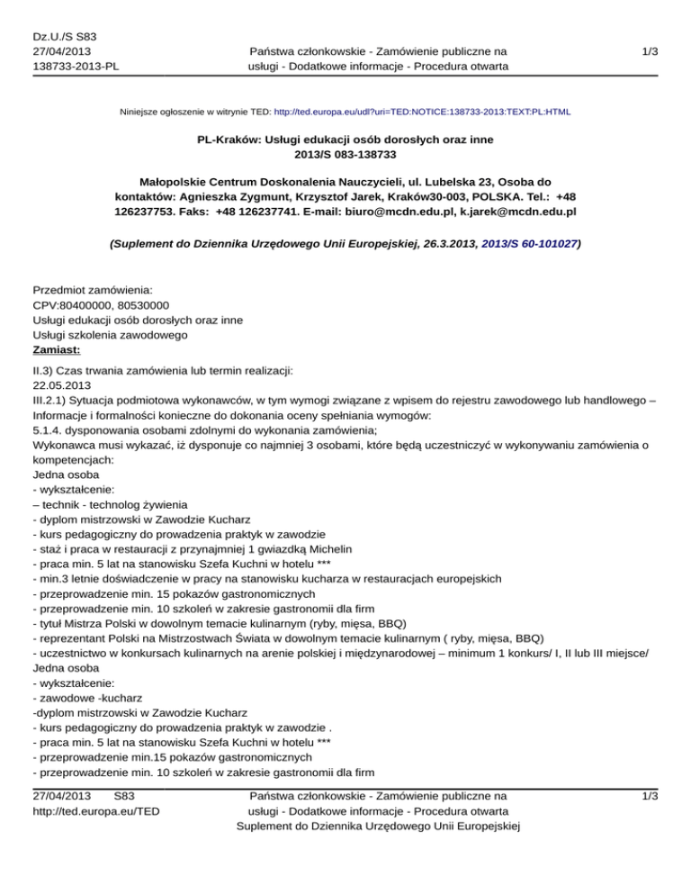 Dz.U./S S83 27/04/2013 138733-2013-PL Państwa członkowskie - Zamówienie publiczne na usługi - Dodatkowe informacje - Procedura otwarta 1/3 Niniejsze ogłoszenie w witrynie TED: http://ted.europa.eu/udl?uri=TED:NOTICE:138733-2013:TEXT:PL:HTML PL-Kraków: Usługi edukacji osób dorosłych oraz inne 2013/S 083-138733 Małopolskie Centrum Doskonalenia Nauczycieli, ul. Lubelska 23, Osoba do kontaktów: Agnieszka Zygmunt, Krzysztof Jarek, Kraków30-003, POLSKA. Tel.: +48 126237753. Faks: +48 126237741. E-mail: [email protected], [email protected] (Suplement do Dziennika Urzędowego Unii Europejskiej, 26.3.2013, 2013/S 60-101027) Przedmiot zamówienia: CPV:80400000, 80530000 Usługi edukacji osób dorosłych oraz inne Usługi szkolenia zawodowego Zamiast: II.3) Czas trwania zamówienia lub termin realizacji: 22.05.2013 III.2.1) Sytuacja podmiotowa wykonawców, w tym wymogi związane z wpisem do rejestru zawodowego lub handlowego – Informacje i formalności konieczne do dokonania oceny spełniania wymogów: 5.1.4. dysponowania osobami zdolnymi do wykonania zamówienia; Wykonawca musi wykazać, iż dysponuje co najmniej 3 osobami, które będą uczestniczyć w wykonywaniu zamówienia o kompetencjach: Jedna osoba - wykształcenie: – technik - technolog żywienia - dyplom mistrzowski w Zawodzie Kucharz - kurs pedagogiczny do prowadzenia praktyk w zawodzie - staż i praca w restauracji z przynajmniej 1 gwiazdką Michelin - praca min. 5 lat na stanowisku Szefa Kuchni w hotelu *** - min.3 letnie doświadczenie w pracy na stanowisku kucharza w restauracjach europejskich - przeprowadzenie min. 15 pokazów gastronomicznych - przeprowadzenie min. 10 szkoleń w zakresie gastronomii dla firm - tytuł Mistrza Polski w dowolnym temacie kulinarnym (ryby, mięsa, BBQ) - reprezentant Polski na Mistrzostwach Świata w dowolnym temacie kulinarnym ( ryby, mięsa, BBQ) - uczestnictwo w konkursach kulinarnych na arenie polskiej i międzynarodowej – minimum 1 konkurs/ I, II lub III miejsce/ Jedna osoba - wykształcenie: - zawodowe -kucharz -dyplom mistrzowski w Zawodzie Kucharz - kurs pedagogiczny do prowadzenia praktyk w zawodzie . - praca min. 5 lat na stanowisku Szefa Kuchni w hotelu *** - przeprowadzenie min.15 pokazów gastronomicznych - przeprowadzenie min. 10 szkoleń w zakresie gastronomii dla firm 27/04/2013 S83 http://ted.europa.eu/TED Państwa członkowskie - Zamówienie publiczne na usługi - Dodatkowe informacje - Procedura otwarta Suplement do Dziennika Urzędowego Unii Europejskiej 1/3 Dz.U./S S83 27/04/2013 138733-2013-PL Państwa członkowskie - Zamówienie publiczne na usługi - Dodatkowe informacje - Procedura otwarta 2/3 - tytuł Mistrza Polski w dowolnym temacie kulinarnym ( ryby, mięsa,, BBQ ) - laureat / Zwycięzca Kulinarnego Pucharu Polski ( w okresie ostatnich 3 lat) - tytuł Mistrza Europy w dowolnym temacie kulinarnym / ryby, mięsa, BBQ / - laureat konkursów międzynarodowych – minimum 1 konkurs / I, II lub III miejsce / - doświadczenie w prowadzeniu szkoleń kulinarnych dla nauczycieli zawodu Jedna osoba - wykształcenie: - zawodowe – specjalizacja kuchnia tajlandzka - praca min. 5 lat na stanowisku Szefa Kuchni w Restauracji specjalizującej się w kuchni tajlandzkiej Ocena spełnienia warunku będzie dokonywana metoda 0 – 1, tj. spełnia/nie spełnia, w oparciu o oświadczenie, którego wzór stanowi załącznik nr 3 do SIWZ, wykaz osób -wzór załącznik nr 5 do SIWZ i oświadczenie wzór załącznik nr 6 do SIWZ dołączone do oferty IV.3.3) Warunki otrzymania specyfikacji, dokumentów dodatkowych lub dokumentu opisowego – Termin składania wniosków dotyczących uzyskania dokumentów lub dostępu do dokumentów: 07.05.2013 (09:30) IV.3.4) Termin składania ofert lub wniosków o dopuszczenie do udziału w postępowaniu: 07.05.2013 (09:30) IV.3.8) Warunki otwarcia ofert: 07.05.2013 (10:00) Powinno być: II.3) Czas trwania zamówienia lub termin realizacji: 10.06.2013 III.2.1) Sytuacja podmiotowa wykonawców, w tym wymogi związane z wpisem do rejestru zawodowego lub handlowego – Informacje i formalności konieczne do dokonania oceny spełniania wymogów: 5.1.4. dysponowania osobami zdolnymi do wykonania zamówienia; Wykonawca musi wykazać, iż dysponuje co najmniej 3 osobami, które będą uczestniczyć w wykonywaniu zamówienia o kompetencjach: Jedna osoba - wykształcenie: – technik - technolog żywienia - dyplom mistrzowski w Zawodzie Kucharz - kurs pedagogiczny do prowadzenia praktyk w zawodzie - staż lub praca w restauracji z przynajmniej 1 gwiazdką Michelin - praca min. 5 lat na stanowisku Szefa Kuchni w hotelu *** - min.3 letnie doświadczenie w pracy na stanowisku kucharza w restauracjach europejskich - przeprowadzenie min. 15 pokazów gastronomicznych - przeprowadzenie min. 10 szkoleń w zakresie gastronomii dla firm - tytuł Mistrza Polski w dowolnym temacie kulinarnym (ryby, mięsa, BBQ) - reprezentant Polski na Mistrzostwach Świata w dowolnym temacie kulinarnym ( ryby, mięsa, BBQ) - uczestnictwo w konkursach kulinarnych na arenie polskiej i międzynarodowej – minimum 1 konkurs/ I, II lub III miejsce/ Jedna osoba - wykształcenie: - zawodowe -kucharz - dyplom mistrzowski w Zawodzie Kucharz - kurs pedagogiczny do prowadzenia praktyk w zawodzie . 27/04/2013 S83 http://ted.europa.eu/TED Państwa członkowskie - Zamówienie publiczne na usługi - Dodatkowe informacje - Procedura otwarta Suplement do Dziennika Urzędowego Unii Europejskiej 2/3 Dz.U./S S83 27/04/2013 138733-2013-PL Państwa członkowskie - Zamówienie publiczne na usługi - Dodatkowe informacje - Procedura otwarta 3/3 - praca min. 5 lat na stanowisku Szefa Kuchni w hotelu *** - przeprowadzenie min.15 pokazów gastronomicznych - przeprowadzenie min. 10 szkoleń w zakresie gastronomii dla firm - tytuł Mistrza Polski w dowolnym temacie kulinarnym ( ryby, mięsa,, BBQ ) - laureat / Zwycięzca Kulinarnego Pucharu Polski - tytuł Mistrza Europy w dowolnym temacie kulinarnym / ryby, mię