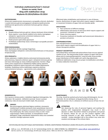Instrukcja użytkowania/User’s manual Orteza na ramię i bark Sling with stabilization strap Wydanie 03.2014/Edition 03.2014 ZASTOSOWANIE: Orteza jest zaopatrzeniem stosowanym w przypadku schorzeń, dysfunkcji i urazów kończyny górnej wymagających odciążenia (podtrzymania), stabilizacji lub ograniczenia ruchomości kończyny górnej i obręczy barkowej. WSKAZANIA: Zespoły bólowe kończyny górnej i obręczy barkowej różnej etiologii. Stany zapalne i urazy tkanek miękkich w/w okolicy wymagające odciążenia i ograniczenia ruchomości (zwłaszcza ruchu odwiedzenia) kończyny górnej. Podtrzymanie opatrunków gipsowych. Profilaktyka podwichnięć stawu ramiennego w przypadku porażeń i niedowładów. PRZECIWWSKAZANIA: Bóle i dysfunkcje odcinka szyjnego kręgosłupa. . Stany wymagające odciążenia i unieruchomienia kończyny w innej pozycji terapeutycznej. OPIS PRODUKTU: Orteza wykonana z miękkie dzianiny welurowej laminowanej pianką poliuretanową. Zapewnia właściwe ujęcie i odciążenie kończyny górnej (od stawu łokciowego po stawy śródręcznopalcowe). Szeroka i długa taśma nośna zaopatrzona w dodatkową miękką osłonę zapewnia prawidłowe rozłożenie ciężaru kończyny oraz szybkie dopasowanie temblaka. Dodatkowa taśma stabilizująca zapewnia właściwe unieruchomienie kończyny – ograniczenia ruchu odwiedzenia. Możliwość regulacji obwodu rękawa./ Adjustable cuff circumference. KONSERWACJA: Prać ręcznie w letniej wodzie z dodatkiem łagodnych detergentów. Nie chlorować. Nie wyżymać , delikatnie wycisnąć. Suszyć w pozycji rozłożonej z dala od sztucznych źródeł ciepła. Nie prasować. UWAGA! Nie przestrzeganie właściwej higieny osobistej, stosowanie niewłaściwych środków piorących może spowodować otarcia lub inne dolegliwości związane ze wzmożoną potliwością i rozwojem flory bakteryjnej. Nie należy stosować ortezy na żele i maści rozgrzewające. Należy pamiętać, że niewypłukane resztki detergentu mogą powodować podrażnienia skóry oraz uszkadzać materiał z którego wykonano wyrób. Effectively helps rehabilitation and treatment in case of disease, injuries, dysfunctions of upper limb which require support, stabilization or movement limitation of upper limb and shoulder girdle. INDICATIONS: Pain syndromes of different etiology Inflammation and injuries of soft tissue which require support and movement limitation of upper limb Plaster dressing support Preventive treatment of shoulder and humeral joint dislocation in paralysis and paresis. CONTRAINDICATIONS: Pain and dysfunctions of cervical spine. Cases which require support and immobilization of upper limb in a chosen therapeutic position. PRODUCT DESCRIPTION: Soft knitted fabric laminated with polyurethane foam ensures optimal comfort of use. The sling provides proper support of upper limb (from elbow joint to metacapolypropylene). Long and wide strap provides proper distribution of limb weight and quick sling adjustment. Additional stabilization strap ensures proper immobilization and allows to reduce abduction movement. MAINTENANCE: The sling should be washed up by hand using mild detergents. Do not chlorinate. Do not whirlpool, wring gently before drying. Dry in horizontal position. Dry in a distance of artificial sources of heat. Do not iron. ATTENTION! Not observing the rules of personal hygiene and washing the product with inappropriate detergents may result in skin abrasion or other discomfort related to perspiration and spread of bacteria. Please do not use the product together with warming ointment or gel. After washing, rinse the product carefully - residue detergent left in the product may cause skin vexation and damage of the orthosis fabric. OSTATECZNĄ DECYZJĘ DOTYCZĄCA ZASTOSOWANIA I WYBORU ZAOPATRZENIA PODEJMUJE LEKARZ SPECJALISTA LUB FIZJOTERAPEUTA. mdh sp. z o.o., 90-349 Łódź, ul. Ks. W. Tymienieckiego 22/24, tel. +4842 6748384, fax.+48426365221, www.mdh.pl, www.qmedinfo.pl mdh ltd. 22/24 ks. W. Tymienieckiego, 90-349 Lodz, Poland, phone: +4842 212 38 04, fax. +4842 6740499