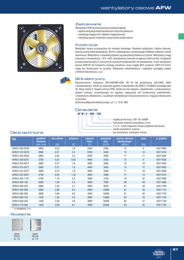 wentylatory osiowe AFW Zastosowanie Wentylatory AFW s¹ stosowane do wentylacji ogólnej: ? ogólna wentylacja lokali handlowych i hal przemys³owych, ? wentylacja magazynów i sk³adów magazynowych, ? wentylacja gara¿y i budynków u¿ytecznoœci publicznej etc. Konstrukcja Wentylator osiowy przeznaczony do monta¿u œciennego. Obudowa wyt³aczana z blachy stalowej, pokryta czarn¹ farb¹ epoksydow¹. Wirnik z polipropylenu wzmacnianego w³óknem szklanym, piasta aluminiowa. Wentylatory o charakterystykach wg specyfikacji klienta na ¿yczenie. Wentylatory mog¹ o pracowaæ w temperaturze -15oC +40 C (standardowy kierunek przep³ywu silnik-wirnik). Urz¹dzenia przeznaczone do pracy w ni¿szych lub wy¿szych temperaturach ni¿ standardowe, w tym wentylatory osiowe AFW-HT do transportu czystego powietrza i pracy ci¹g³ej 90oC (czasowo 100oC/10 min/h) mog¹ byæ dostarczone na ¿yczenie. Wykonania niestandardowe i specjalne wymagaj¹ ustaleñ z Venture Industries sp. z o.o. Silnik elektryczny Asynchroniczny, trójfazowy 220-240/380-420V, 50 Hz lub jednofazowy 220-240V, 50Hz z kondensatorem. Silniki s¹ wykonane zgodnie ze standardem IEC 60072 i IE 60034, posiadaj¹ znak CE. Klasa izolacji F, stopieñ ochrony IP55. Silniki na inne napiêcie i czêstotliwoœæ, o podwy¿szonym stopniu ochrony, przystosowane do regulacji napiêciowej lub przetwornic¹ czêstotliwoœci, z niezale¿nym ch³odzeniem, z czujnikami (bimetalowymi lub pozystorowymi), mog¹ byæ dostarczone na ¿yczenie. Schemat pod³¹czenia elektrycznego: rys. 11, 12 str. 583. Oznaczenia AF W / 2 - 400 - 150 wspó³czynnik mocy 150*10=1500W nominalna œrednica wentylatora w mm 2, 4, 6 - liczba biegunów silnika (prêdkoœæ obrotowa) model wentylatora: œcienny typ wentylatora: wentylator osiowy Dane techniczne prêdkoœæ obrotowa [obr./min] moc silnika [A] napiêcie znam. [V] wydajnoœæ max. [m3/h] poziom ciœnienia akustycznego* [dB(A)] [W] AFW/2-250-025S 2850 0,25 1,8 230V 2250 72 AFW/2-315-037S 2860 9 42511600 0,37 2,5 230V 3400 74 10 AFW/2-355-055S 42511610 2860 0,55 3,4 230V 4500 77 11 42511620 AFW/2-250-025T 2760 0,25 0,65 400V 2250 72 9 42511630 AFW/2-250-037T 2800 0,37 1,0 400V 2600 72 10 42511640 AFW/2-315-037T 2800 0,37 1,0 400V 3400 74 12 42511650 AFW/2-315-075T 2800 0,75 1,9 400V 5000 77 18 42511660 AFW/2-355-055T 2790 0,55 1,35 400V 4500 77 14 42511670 AFW/2-355-110T 2780 1,10 2,5 400V 5700 78 22 42511680 AFW/2-400-150 2800 1,50 3,4 400V 7800 80 30 42511690 AFW/2-450-220 2800 2,20 4,7 400V 9500 81 38 42511700 AFW/2-450-300 2800 3,00 6,5 400V 12000 81 38 42511710 AFW/2-500-300 2800 3,00 6,5 400V 15000 81 40 42511720 AFW/4-560-150 1440 1,50 4,3 400V 14000 82 33 42511730 AFW/4-630-220 1420 2,20 4,8 400V 18200 82 41 42511740 AFW/4-710-400 1440 4,00 8,1 400V 25500 83 45 42511750 Typ natê¿enie masa nr artyku³u [kg] * w odleg³oœci 3 m Akcesoria ¿aluzje PER-W str. 110 ¿aluzje PER-CN str. 110 97 wentylatory osiowe AFW Wymiary [mm] Typ OF AFW/2-250-025 B OD E C A A 315 B 260 C 65 OD 254 E 275 OF 10 AFW/2-250-037 315 260 65 254 290 10 AFW/2-315-037 400 330 80 315 300 10 AFW/2-315-075 400 330 80 315 320 10 AFW/2-355-055 450 380 87 355 320 10 AFW/2-355-110 450 380 87 355 320 10 AFW/2-400-150 500 420 90 400 350 10 AFW/2-450-220 560 480 103 450 390 10 AFW/2-450-300 560 480 103 450 390 10 AFW/2-500-300 630 560 110 500 400 10 AFW/4-560-150 710 630 110 560 400 10 AFW/4-630-220 800 710 115 630 425 10 AFW/4-710-400* 900 800 110 710 430 10,5 * silnik montowany na podstawie Charakterystyki pracy [Pa] AFW/2-315-037 AFW/2-315-075 AFW/2-250-025 AFW/2-250-037 [Pa] AFW/2 - 315 - 075 AFW/2 - 315 - 037 [m3/h] [m3/h] AFW/2-450-220 AFW/2-450-300 AFW/2-500-300 AFW/2-355-055 AFW/2-355-110 AFW/2-400-150 [Pa] [Pa] [m3/h] 98 [m3/h] wentylatory osiowe AFW Charakterystyki pracy AFW/4-710-400 AFW/4-560-150 AFW/4-630-220 [Pa] [Pa] [m3/h] [m3/h] 99