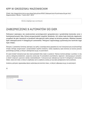 KPP W GRODZISKU MAZOWIECKIM Źródło: http://kppgrodzisk.policja.waw.pl/pgm/aktualnosci/55557,Zabezpieczono-9-automatow-do-gier.html Wygenerowano: Wtorek, 7 marca 2017, 18:47 Strona znajduje się w archiwum. ZABEZPIECZONO 9 AUTOMATÓW DO GIER Policjanci zajmujący się zwalczaniem przestępczości gospodarczej z grodziskiej komendy wraz z funkcjonariuszami Izby Celnej przeprowadzili wspólne działania. Ich celem była kontrola legalności urządzeń do gier losowych w punktach oferujących takie usługi na terenie powiatu. Efektem działań było zabezpieczenie 9 nielegalnych automatów. Policjanci zapowiadają systematyczne kontrole tego typu miejsc. Policjanci z grodziskiej komendy zajmujący się walką z przestępczością gospodarczą oraz funkcjonariusze pruszkowskiego Urzędu Celnego zorganizowali i przeprowadzili wspólne działania. Celem współpracy była kontrola na terenie powiatu grodziskiego punktów, w których udostępniane są gry na automatach. W czasie działań funkcjonariusze obu służb sprawdzili kilka miejsc w powiecie. Podczas kontroli jednego z punktów, w celu ukrycia nielegalnej działalności, wyłączony został prąd. Po sprawdzeniu pochodzenia, legalności i obowiązujących zezwoleń, w dwóch miejscach ujawnione zostały nieprawidłowości. Funkcjonariusze zabezpieczyli łącznie 9 nielegalnych automatów. Wobec właścicieli lokali, w których znajdowały się te urządzenia zostały już wszczęte postępowania karno-skarbowe. Grodziscy policjanci zapowiadają dalsze systematyczne kontrole miejsc, w których odbywają się gry na automatach. kz Ocena: 0/5 (0) Tweetnij