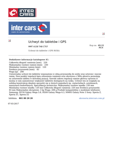 Uchwyt do tabletów i GPS MMT A158 TAB CT07 Kup za: 69.22 PLN Uchwyt do tabletów i GPS ROXA Dodatkowe informacje katalogowe IC: Całkowita długość ramienia [mm]: 220 Maksymalny rozstaw ramion [mm]: 230 Minimalny rozstaw ramion [mm]: 120 Średnica przyssawki [mm]: 83 Waga [g]: 208 Uniwersalny uchwyt do tabletów wyposażono w silną przyssawkę do szyby oraz sztywne i mocne ramię. Dwa punkty regulacji kąta ustawienia ramienia oraz obrotowa o 360o głowica pozwalają na ustawienie tabletu w dowolnej pozycji. Szeroki zakres regulacji ramion głowicy sprawia iż można w nim zamontować większość tabletów dostępnych na rynku. Uchwyt ten ze względu na solidną konstrukcję idealnie sprawdzi się w dużych pojazdach np. ciężarówkach, autobusach, maszynach budowlanych. Specyfikacja techniczna: Maksymalny rozstaw imadła: 230 mm Minimalny rozstaw imadła: 120 mm Całkowita długość ramienia: 220 mm Średnica przyssawki: 83 mm Maksymalne obciążenie: 3 kg Waga: 208 g Produkt kompatybilny z modelami telefonów: Samsung: I9150 Galaxy Mega 5.8, I9200 Galaxy Mega 6.3, N9005 Galaxy Note 3 Sony: Xperia Z, Xperia Z1, Xperia Z2 Infolinia: 801 80 20 20 07-03-2017 akcesoria.intercars.com.pl