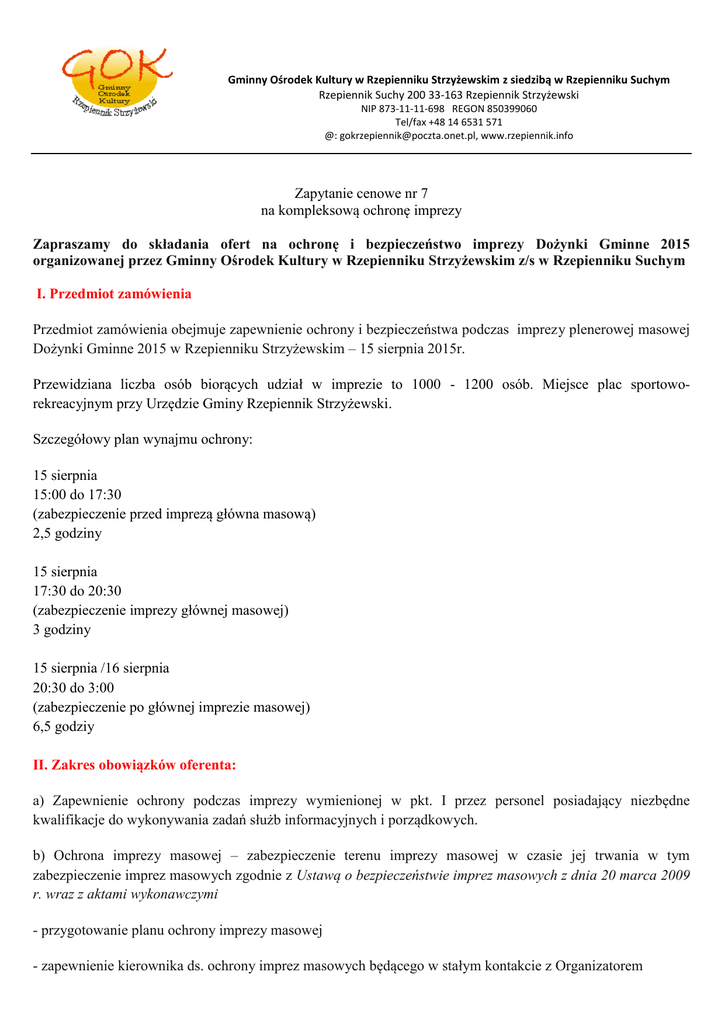 Gminny Ośrodek Kultury w Rzepienniku Strzyżewskim z siedzibą w Rzepienniku Suchym Rzepiennik Suchy 200 33-163 Rzepiennik Strzyżewski NIP 873-11-11-698 REGON 850399060 Tel/fax +48 14 6531 571 @: [email protected], www.rzepiennik.info Zapytanie cenowe nr 7 na kompleksową ochronę imprezy Zapraszamy do składania ofert na ochronę i bezpieczeństwo imprezy Dożynki Gminne 2015 organizowanej przez Gminny Ośrodek Kultury w Rzepienniku Strzyżewskim z/s w Rzepienniku Suchym I. Przedmiot zamówienia Przedmiot zamówienia obejmuje zapewnienie ochrony i bezpieczeństwa podczas imprezy plenerowej masowej Dożynki Gminne 2015 w Rzepienniku Strzyżewskim – 15 sierpnia 2015r. Przewidziana liczba osób biorących udział w imprezie to 1000 - 1200 osób. Miejsce plac sportoworekreacyjnym przy Urzędzie Gminy Rzepiennik Strzyżewski. Szczegółowy plan wynajmu ochrony: 15 sierpnia 15:00 do 17:30 (zabezpieczenie przed imprezą główna masową) 2,5 godziny 15 sierpnia 17:30 do 20:30 (zabezpieczenie imprezy głównej masowej) 3 godziny 15 sierpnia /16 sierpnia 20:30 do 3:00 (zabezpieczenie po głównej imprezie masowej) 6,5 godziy II. Zakres obowiązków oferenta: a) Zapewnienie ochrony podczas imprezy wymienionej w pkt. I przez personel posiadający niezbędne kwalifikacje do wykonywania zadań służb informacyjnych i porządkowych. b) Ochrona imprezy masowej – zabezpieczenie terenu imprezy masowej w czasie jej trwania w tym zabezpieczenie imprez masowych zgodnie z Ustawą o bezpieczeństwie imprez masowych z dnia 20 marca 2009 r. wraz z aktami wykonawczymi - przygotowanie planu ochrony imprezy masowej - zapewnienie kierownika ds. ochrony imprez masowych będącego w stałym kontakcie z Organizatorem Gminny Ośrodek Kultury w Rzepienniku Strzyżewskim z siedzibą w Rzepienniku Suchym Rzepiennik Suchy 200 33-163 Rzepiennik Strzyżewski NIP 873-11-11-698 REGON 850399060 Tel/fax +48 14 6531 571 @: [email protected], www.rzepiennik.info III. Niezbędne elementy oferty: Oferta musi zawierać: - dane oferenta oraz aktualny dokument rejestrowy firmy (kopia potwierdzona za zgodność z oryginałem), - opis sposobu realizacji zlecenia i szczegółowe określenie całkowitych kosztów usługi (stawka kierownika ds. bezpieczeństwa, stawka za 1 rbh pracownika ochrony fizycznej, koszty dojazdu) - koncesja/licencja (kopia potwierdzona za zgodność z oryginałem), - posiadane przez firmę ubezpieczenie OC w zakresie prowadzonej działalności (kopia potwierdzona za zgodność z oryginałem), - wykazanie się co najmniej pięcioma referencjami ze świadczenia usługi o podobnym charakterze jak w przedmiocie zamówienia IV. Termin i miejsce składania ofert Oferty należy składać w siedzibie Ośrodka (Rzepiennik Suchy 200), mailem [email protected], faxem 14 6531 571 (oryginały dostarczyć do GOK) lub wysłać na adres Gminny Ośrodek Kultury w Rzepienniku Strzyżewskim z/s w Rzepienniku Suchym, Rzepiennik Suchy 200 33-163 Rzepiennik Strzyżewski w terminie do dnia 10 lipca 2015 roku do godz. 16.00 w zaklejonych kopertach z napisem „Oferta na kompleksową ochronę imprezy”. Oferty, które wpłyną po terminie nie będą przez komisję brane pod uwagę. VI. Informacje dodatkowe Informacje dodatkowe na temat oferty można uzyskać w siedzibie Gminnego Ośrodka Kultury lub pod nr telefonu 14 6531 571, 668 351 101 VII. Sposób wyboru oferty Powołana komisja dokona wyboru najkorzystniejszej oferty spośród ofert złożonych w postępowaniu i spełniających wymagania postawione w zaproszeniu. Rozstrzygnięcie nastąpi w dniu 13 lipca 2015 roku. Wyniki zostaną opublikowane na stronie rzepiennik.info Oferty składane w niniejszym postępowaniu nie podlegają zwrotowi. Po rozstrzygnięciu postępowania zostanie podpisana umowa z wyłonionym w wyniku postępowania wykonawcą zamówienia. Dyrektor Gminnego Ośrodka Kultury Halina Hołda