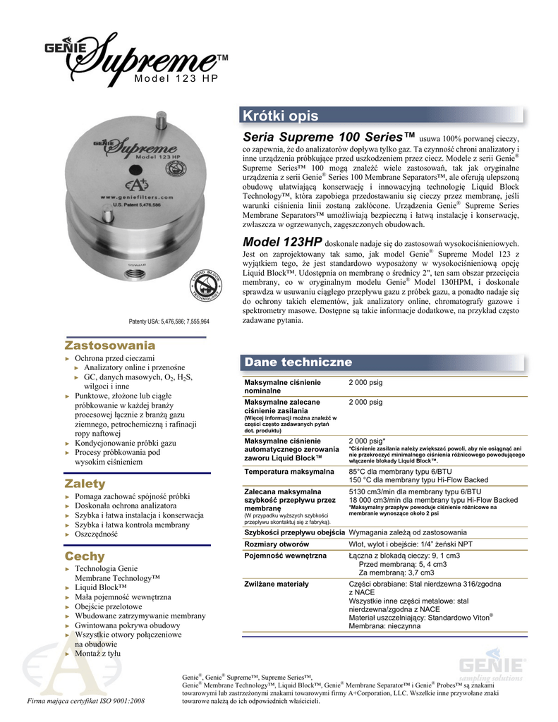 Model 123 HP Krótki opis Seria Supreme 100 Series™ usuwa 100% porwanej cieczy, co zapewnia, że do analizatorów dopływa tylko gaz. Ta czynność chroni analizatory i inne urządzenia próbkujące przed uszkodzeniem przez ciecz. Modele z serii Genie® Supreme Series™ 100 mogą znaleźć wiele zastosowań, tak jak oryginalne urządzenia z serii Genie® Series 100 Membrane Separators™, ale oferują ulepszoną obudowę ułatwiającą konserwację i innowacyjną technologię Liquid Block Technology™, która zapobiega przedostawaniu się cieczy przez membranę, jeśli warunki ciśnienia linii zostaną zakłócone. Urządzenia Genie® Supreme Series Membrane Separators™ umożliwiają bezpieczną i łatwą instalację i konserwację, zwłaszcza w ogrzewanych, zagęszczonych obudowach. Model 123HP doskonale nadaje się do zastosowań wysokociśnieniowych. Patenty USA: 5,476,586; 7,555,964 Zastosowania ► Ochrona przed cieczami Analizatory online i przenośne ► GC, danych masowych, O2, H2S, wilgoci i inne Punktowe, złożone lub ciągłe próbkowanie w każdej branży procesowej łącznie z branżą gazu ziemnego, petrochemiczną i rafinacji ropy naftowej Kondycjonowanie próbki gazu Procesy próbkowania pod wysokim ciśnieniem ► ► ► ► Zalety ► ► ► ► ► Pomaga zachować spójność próbki Doskonała ochrona analizatora Szybka i łatwa instalacja i konserwacja Szybka i łatwa kontrola membrany Oszczędność Cechy ► ► ► ► ► ► ► ► Technologia Genie Membrane Technology™ Liquid Block™ Mała pojemność wewnętrzna Obejście przelotowe Wbudowane zatrzymywanie membrany Gwintowana pokrywa obudowy Wszystkie otwory połączeniowe na obudowie Montaż z tyłu Firma mająca certyfikat ISO 9001:2008 Jest on zaprojektowany tak samo, jak model Genie® Supreme Model 123 z wyjątkiem tego, że jest standardowo wyposażony w wysokociśnieniową opcję Liquid Block™. Udostępnia on membranę o średnicy 2", ten sam obszar przecięcia membrany, co w oryginalnym modelu Genie® Model 130HPM, i doskonale sprawdza w usuwaniu ciągłego przepływu gazu z próbek gazu, a ponadto nadaje się do ochrony takich elementów, jak analizatory online, chromatografy gazowe i spektrometry masowe. Dostępne są takie informacje dodatkowe, na przykład często zadawane pytania. Dane techniczne Maksymalne ciśnienie nominalne 2 000 psig Maksymalne zalecane ciśnienie zasilania 2 000 psig (Więcej informacji można znaleźć w części często zadawanych pytań dot. produktu) Maksymalne ciśnienie automatycznego zerowania zaworu Liquid Block™ 2 000 psig* Temperatura maksymalna 85°C dla membrany typu 6/BTU 150 °C dla membrany typu Hi-Flow Backed Zalecana maksymalna szybkość przepływu przez membranę 5130 cm3/min dla membrany typu 6/BTU 18 000 cm3/min dla membrany typu Hi-Flow Backed (W przypadku wyższych szybkości przepływu skontaktuj się z fabryką). *Ciśnienie zasilania należy zwiększać powoli, aby nie osiągnąć ani nie przekroczyć minimalnego ciśnienia różnicowego powodującego włączenie blokady Liquid Block™. *Maksymalny przepływ powoduje ciśnienie różnicowe na membranie wynoszące około 2 psi Szybkości przepływu obejścia Wymagania zależą od zastosowania Rozmiary otworów Wlot, wylot i obejście: 1/4” żeński NPT Pojemność wewnętrzna Łączna z blokadą cieczy: 9, 1 cm3 Przed membraną: 5, 4 cm3 Za membraną: 3,7 cm3 Zwilżane materiały Części obrabiane: Stal nierdzewna 316/zgodna z NACE Wszystkie inne części metalowe: stal nierdzewna/zgodna z NACE ® Materiał uszczelniający: Standardowo Viton Membrana: nieczynna Genie®, Genie® Supreme™, Supreme Series™, Genie® Membrane Technology™, Liquid Block™, Genie® Membrane Separator™ i Genie® Probes™ są znakami towarowymi lub zastrzeżonymi znakami towarowymi firmy A+Corporation, LLC. Wszelkie inne przywołane znaki towarowe należą do ich odpowiednich właścicieli. Numeracja modeli i numery dodatkowych części Numer modelu jest określany przez konkretne potrzeby. Wybierz spośród poniższych opcji: ® ® Materiał uszczelniający 0 = Viton Typ membrany 6 = Typ 6/BTU Akcesoria wspornika montażowego Nr części = 123-509-SS (sprzedawane oddzielnie) Zamienny pierścień O Nr części = 123-500 (sprzedawane oddzielnie) Jak utworzyć numer modelu: 1 = Kalrez (inne materiały dostępne na zamówienie) 7= Hi-Flow Backed Jak utworzyć numer zestawu wymiennej membrany: (Pięć membran na zestaw. Pierścienie O sprzedawane oddzielnie) Materiał uszczelniający Typ membrany Typ membrany Nie możemy zalecić konkretnego materiału uszczelniającego ze względu na kompleksową naturę kompozycji strumienia próbek. Temperatura i ciśnienie O ile nie zostało to określone inaczej, produkt zostanie wysłany ze standardowymi materiałami uszczelniającymi i konstrukcyjnymi również mają swój wpływ. Na stronie www.dupontelastomers.com można znaleźć zalecenia i porady wymienionymi w części danych technicznych odpowiedniego arkusza produktu. dotyczące materiałów uszczelniających. Użytkownik odpowiada za określenie materiałów uszczelniających i innych materiałów konstrukcyjnych odpowiednich do danego zastosowania. Wymiary Widok z boku Widok z przodu ŚR. 3,480” ŚR. 0,219” ŚR. 3,365” 3,035” OPCJONALNE WSPORNIKI MONTAŻOWE WLOT WLOT 0,708” WYLOT ŚR. 3,025” 0,708” 4,223” WYLOT ŚR. 3,025” 4,670” OBEJŚCIE OBEJŚCIE 0,223” 0,663” 1,077” 2,250” 3,000” Dystrybutor lokalny: Producent A+ Corporation, LLC 41041 Black Bayou Road Gonzales, LA 70737 Skontaktuj się z nami, aby uzyskać specjalistyczną pomoc dla danego zastosowania: Telefon: (225)-644-5255 Faks: (225)-644-3975 Firma mająca certyfikat ISO 9001:2008 Strona: www.geniefilters.com Adres e-mail: [email protected] ©2010 A+ Corporation, LLC. Wszelkie prawa zastrzeżone.