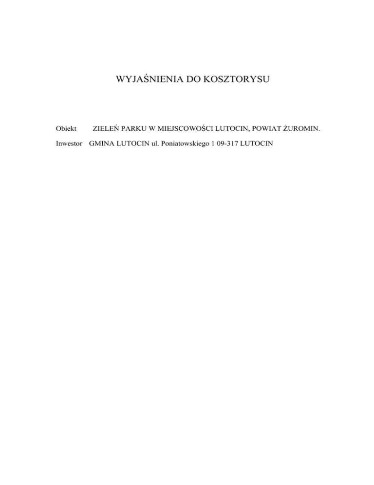 WYJAŚNIENIA DO KOSZTORYSU Obiekt ZIELEŃ PARKU W MIEJSCOWOŚCI LUTOCIN, POWIAT ŻUROMIN. Inwestor GMINA LUTOCIN ul. Poniatowskiego 1 09-317 LUTOCIN 1. 2. 3. 4. 5. 6. 7. 8. 9. 10. 11. 12. 13. 14. 15. 16. 17. 18. 19. 20. 21. DRZEWA LIŚCIASTE SZTUKI Acer platanoides „Crimson Sentry” Acer rubrum „Red Sunset” Carpinus bet ulus „Fastigiata” Crataegus x media „Paul’s Scarlet” Liquidambar styraciflua Liriodendron tulipifera Sorbus aucuparia KRZEWY LIŚCIASTE Berberis thunbergii Chaenomeles japonica Cornus alba Cotoneaster atropurpureus „Variegatus” Cotoneaster dammeri „Major” Hydrangea macrophylla Ilex x meserveae„Blue Princess” Philadelphus coronarius Potentilla fruticosa Spiraea x vanhouttel Spiraea x cinerea„Grefsheim” Viburnum „Eskimo” Weigela w odmianach Rhododendron w odmianach 2 WYSOKOŚĆ OBWÓD (M.) PNIA (CM.) 4-5 20-25 POJEMNIK (LITR) 1 4-5 20-25 2 4-5 25 8 2-3 15 2 4-5 20-25 2 4-5 20-25 6 2-3 15 250 30 0,4-0,6 0,4 3 5 200 200 0,6-0,8 - 5 3 200 - 3 50 0,4-0,6 5 20 0,8-1,2 10 12 1-1,2 10 120 350 0,4-0,6 0,4-0,6 5 5 300 0,4-0,6 5 8 0,8-1,2 10 55 0,8-1,2 10 110 0,6-1,2 10 WYKAZ ELEMENTÓW PLACU ZABAW 1. Zestaw zabawowy - wieża kwadratowa z daszkiem - wieża kwadratowa bez daszku - ślizg stalowy o spawanej konstrukcji rurowej, malowanie proszkowe, blacha nierdzewna lub ślizg plastikowy - część zjazdowa, sklejka- boki - pomost wiszący - schody wejściowe - mocowanie- stopa betonowa ocynk 2. Przeplotnia- wielofunkcyjne urządzenie wyposażone w trzy ścianki do wspinaczki, drążki do przewrotów - mocowanie- stopy betonowe ocynk 3. Karuzela metalowa- średnica półtora metra - podest z blachy nierdzewnej, ryflowanej 4. Sprężynowiec: sztuk: 2 - główny element konstrukcji sprężyna o średnicy 200 mm, wysokość 400mm i grubość 20mm - figury zwierząt wykonane z wodoodpornej sklejki o grubości minimum 18mm 5. Piaskownica- wymiary: 4x4 m z siedziskami z wodoodpornej sklejki o grubości minimum 18 mm 6. Huśtawka wagowa- sztuk: 2, długość 300 cm. - główny element wahająca się na stalowym malowanym proszkowo łożysku, drewniana belka o średnicy minimum 120 mm. Siedziska wykonane z laminowanej wodoodpornej sklejki o grubości minimum 18 mm. - mocowanie stopa betonowa ocynkowana - dodatkowo należy wykonać odbojnice z elementów amortyzujących uderzenie 7. Huśtawka podwójna - główny element poziomy belka i skośne słupy o średnicy minimum 120 mm - siedzisko bezpieczne - siedzisko kubełkowe - mocowanie stopa betonowa ocynkowana TECHNOLOGIA WYKONYWANIA ELEMENTÓW PLACU ZABAW Drewno Tarcica iglasta w kształcie okrąglaków impregnowanych metodą ciśnieniowo próżniową. Ślizgi - stalowe: konstrukcja spawana i malowana proszkowo, wyłożona blachą nierdzewną i sklejką - plastikowe: wykonane z wysoko udarowego tworzywa sztucznego, wzmocnionego włóknem szklanym, barwionego w masie. Farby Wybrane elementy konstrukcji malowane są farbami ftalowymi Elementy metalowe - drążki służące za pochwyty: rurki malowane proszkowo o średnicy 25-35 mm. - elementy stóp fundamentowych: stal zimno- gięta, ocynkowana ogniowo. - łańcuchy techniczne z ogniw krótkich o6 - zawieszenia huśtawek: łożyska ślizgowe, ocynkowane galwanicznie - łączenie elementów konstrukcji: śruby metalowe ocynkowane, zabezpieczone zaślepką plastikową o średnicy 30 mm. Urządzenia zabawowe powinny być ustawione według projektu producenta z uwzględnieniem stref bezpieczeństwa dla poszczególnych pozycji. Urządzenia muszą spełniać wymogi zawarte w normie EN 1176 1 do 7. Rozmieszczenie urządzeń, ich montaż oraz nawierzchnie pod urządzeniami powinny spełniać wymagania normy EN-1177 z zachowaniem określonych przez nią stref bezpiecznego użytkowania. Montaż jest dokonywany przez wyspecjalizowane ekipy producenta lub przez niego wskazane i autoryzowane. Ogrodzenie placu zabaw- 165 m. - płot z bali poziomych: szerokość o,20 m., wysokość 1,00 m., belka o100 mm. lub z belek pionowych: szerokość 0,09 m., wysokość 0,80-1,00 m. - belki poziome ½ o100 mm. - belki pionowe ½ o80 mm. Ławki parkowe- sztuk: 34 - podstawa żeliwna lub stalowa z oparciem długość minimum 1,80-2,00 m. - siedziska drewno impregnowane - kolor czarny i brązowy Kosze na śmieci- sztuk: 14 - wysokość 0,50 m. - metalowe mocowane do podłoża - kolor brązowy Rozmieszczenie ławek i koszy: Park- ławki: 30 sztuk, kosze: 10 sztuk Plac zabaw- ławki: 4 sztuki, kosze: 4 sztuki Uwagi: Do łączenia elementów nie można używać gwoździ. Śruby, lub inne zastosowane złącza muszą być ukryte i zabezpieczone plastikowymi nakładkami. Powierzchnie i krawędzie powinny być zabezpieczone i gładkie. Wszystkie urządzenia i przyrządy powinny spełniać wymogi bezpieczeństwa w zakresie projektowania, produkcji, montażu i konserwacji stawiane przez Polskie i Europejskie normy. Krzysztof Kamiński Architekt krajobrazu