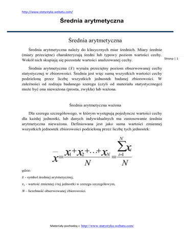 http://www.statystyka.webatu.com/ Średnia arytmetyczna Średnia arytmetyczna Średnia arytmetyczna należy do klasycznych miar średnich. Miary średnie (miary przeciętne) charakteryzują średni lub typowy poziom wartości cechy. Wokół nich skupiają się pozostałe wartości analizowanej cechy. Średnia arytmetyczna ( ̅ ) wyraża przeciętny poziom obserwowanej cechy statystycznej w zbiorowości. Średnia jest więc sumą wszystkich wartości cechy podzieloną przez liczbę wszystkich jednostek badanej zbiorowości. W zależności od rodzaju badanego szeregu (czyli od materiału statystycznego) może być ona nieważona (prosta, zwykła) lub ważona. Średnia arytmetyczna ważona Dla szeregu szczegółowego, w którym występują pojedyncze wartości cechy dla każdej jednostki, lub danych indywidualnych ma zastosowanie średnia arytmetyczna nieważona. Definiowana jest jako suma wartości zmiennej wszystkich jednostek zbiorowości podzieloną przez liczbę tych jednostek: N __ x x1 x2 xN N x i i1 N gdzie: ̅ - symbol średniej arytmetycznej, - wartość zmiennej i-tej jednostki w szeregu szczegółowym, N – liczebność obserwowanej zbiorowości. Materiały pochodzą z http://www.statystyka.webatu.com/ Strona | 1 http://www.statystyka.webatu.com/ Średnia arytmetyczna Średnia arytmetyczna ważona Średnia arytmetyczna ważona liczona jest dla szeregów rozdzielczych (punktowych i przedziałowych), w których wartości zmiennych występują z różną częstotliwością. Wagami są liczebności odpowiadające poszczególnym wariantom cech. Dla szeregu rozdzielczego punktowego Dla szeregu rozdzielczego punktowego wartości średniej obliczana jest następująco: k __ x x n x n 1 1 2 2 x k nk N x n i i i 1 N gdzie: ∈ (dla – to zbiór liczb naturalnych, = 1,2, … , ) – liczebność jednostek odpowiadającym poszczególnym wariantom obserwowanych cech. Dla szeregu rozdzielczego przedziałowego Dla szeregów rozdzielczych przedziałowych wartości zmiennej mieszczą się w pewnych przedziale. W celu wyznaczenia średniej arytmetycznej należy wyznaczyć środek przedziału. Otrzymuje się go jako średnią arytmetyczną dolnej i górnej granicy poszczególnej klasy. Średnia arytmetyczna w tym przypadku wyrażana jest wzorem: k o o o x1 n1 x2 n2 xk nk x N __ o x n i i i 1 N gdzie: 0 x - średnia arytmetyczna i-tej klasy. i Materiały pochodzą z http://www.statystyka.webatu.com/ Strona | 2 http://www.statystyka.webatu.com/ Średnia arytmetyczna Procentowe wskaźniki struktury – średnia arytmetyczna Wówczas, gdy w obliczeniach stosuje się tylko procentowe wskaźniki struktury, to wzór na średnią arytmetyczną przyjmuję postać: Strona | 3 k __ (3.4) x o x w i i i 1 100 gdzie: - odsetki całości, w i n 100 . i N W przypadku gdy znane są wartości średnich arytmetycznych dla pewnych grup, to można obliczyć średnią arytmetyczną dla wszystkich grup łącznie. Umożliwia to następujący wzór: k x n i i x i 1 N gdzie: ̿ - średnia ze średnich, x i - średnia arytmetyczna i-tej grupy, N – suma liczebności grupy. Materiały pochodzą z http://www.statystyka.webatu.com/ http://www.statystyka.webatu.com/ Średnia arytmetyczna Średnia arytmetyczna stosowana jest w odniesieniu do zbiorowości jednorodnych, o niewielkim stopniu zróżnicowania wartości zmiennej. Należy pamiętać że na poziom średniej arytmetycznej silny wpływ wywierają wartości skrajne. W miarę wzrostu asymetrii i zróżnicowania rozkładu traci swoją wartość poznawczą. Materiały pochodzą z http://www.statystyka.webatu.com/ Strona | 4